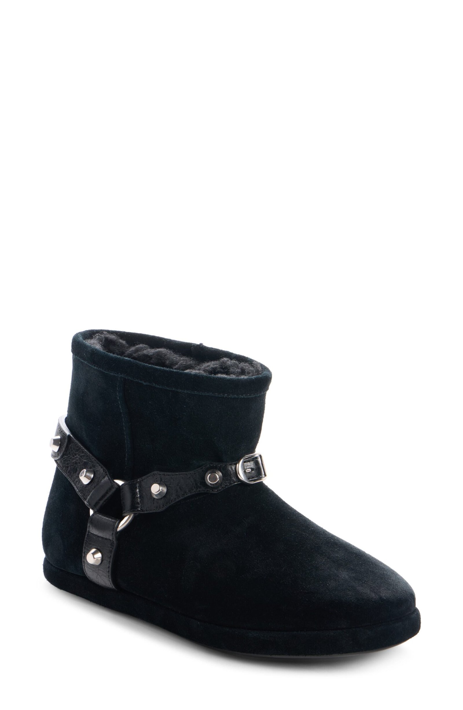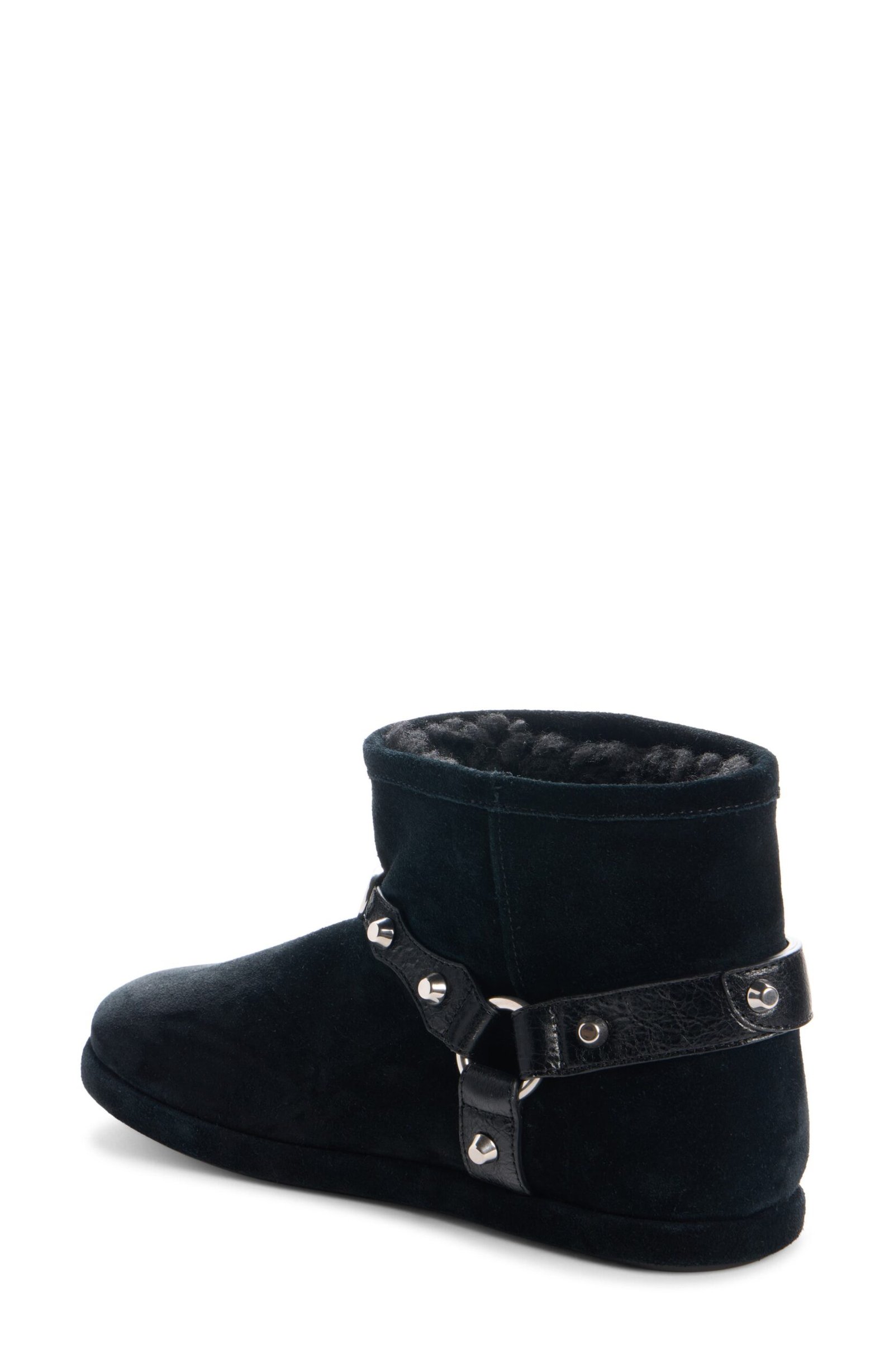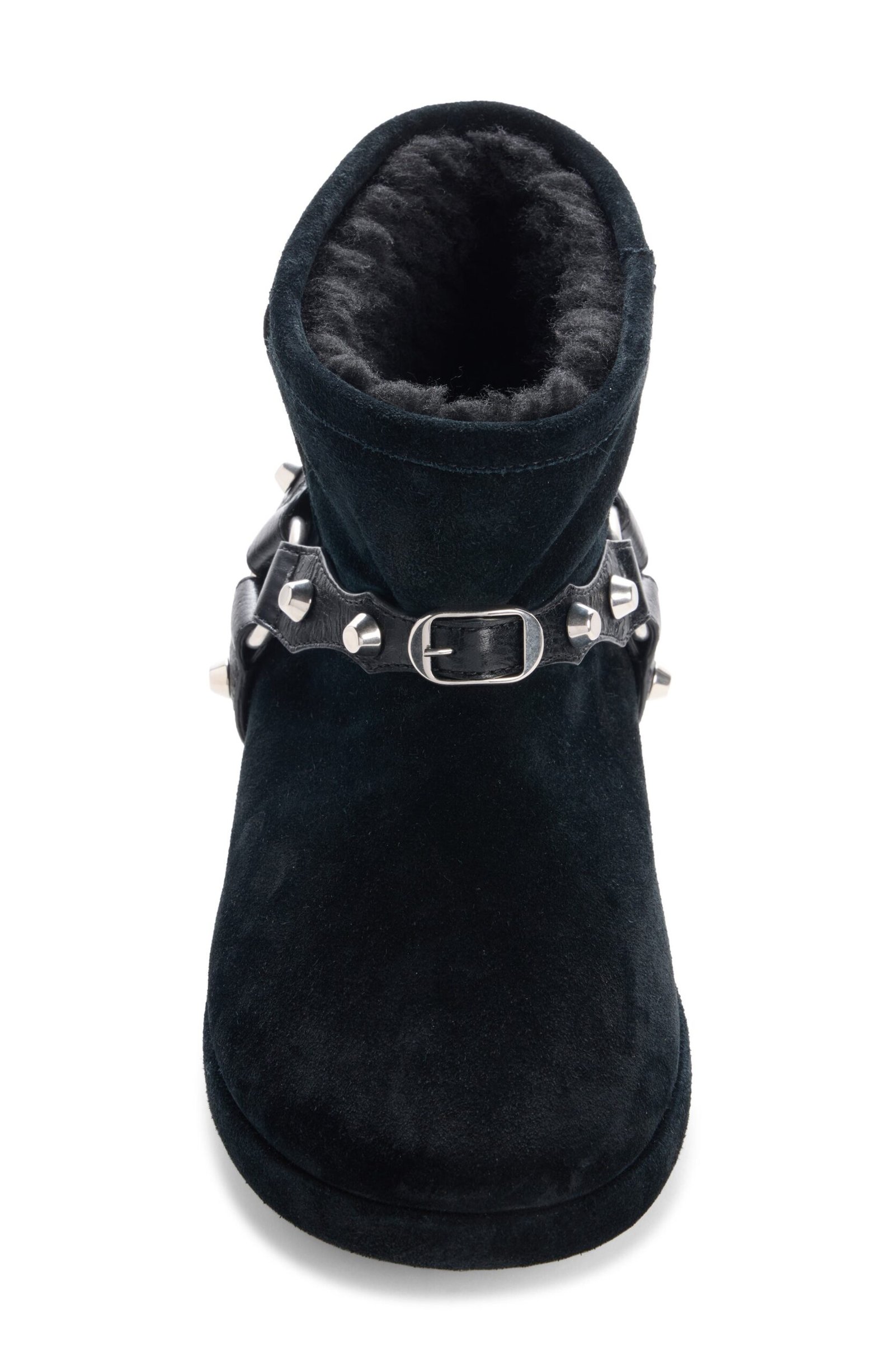 Velvety Italian suede is leashed with harness-inspired hardware on a soft puffer boot that captures Balenciaga’s extreme aesthetic.