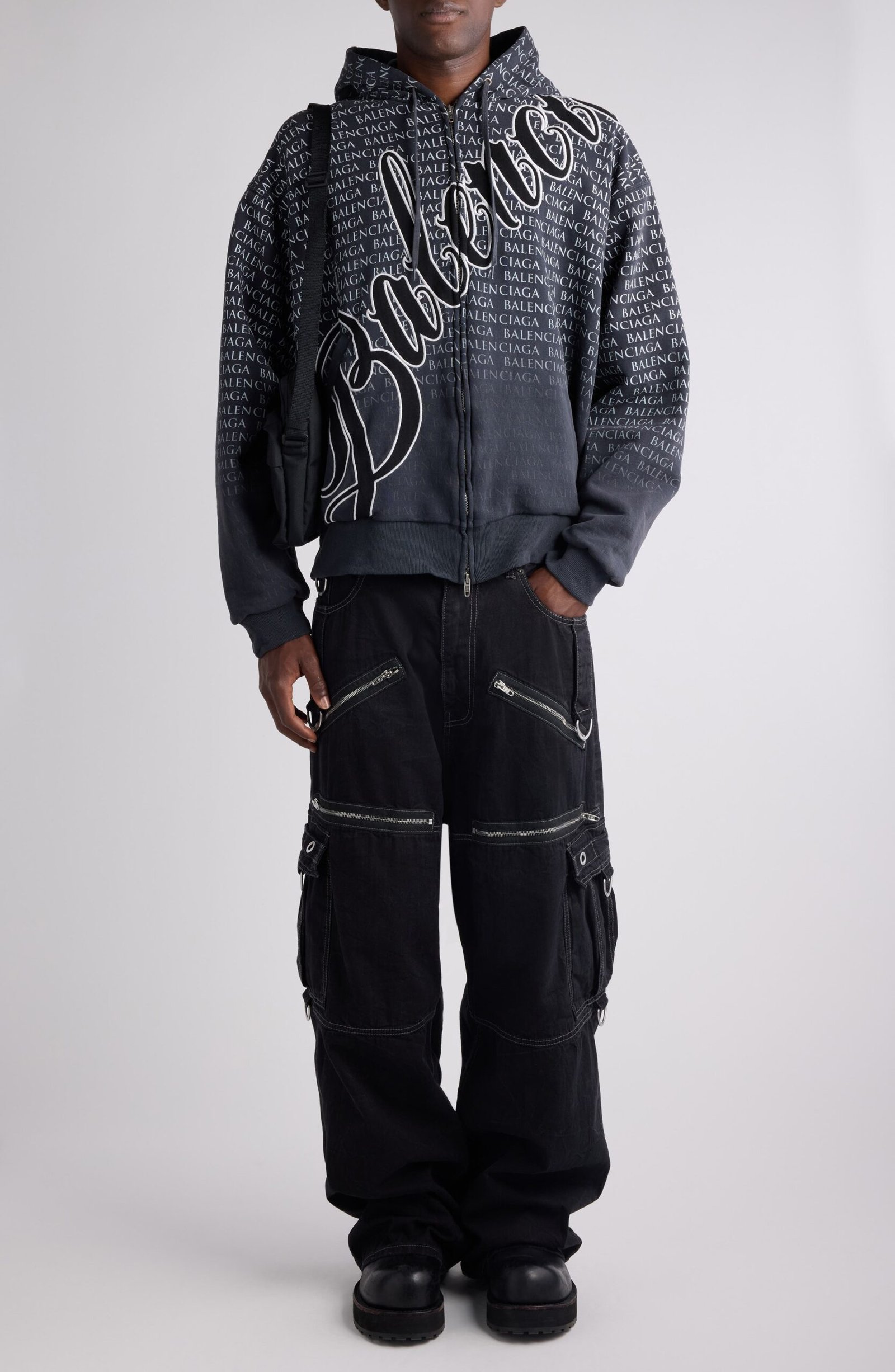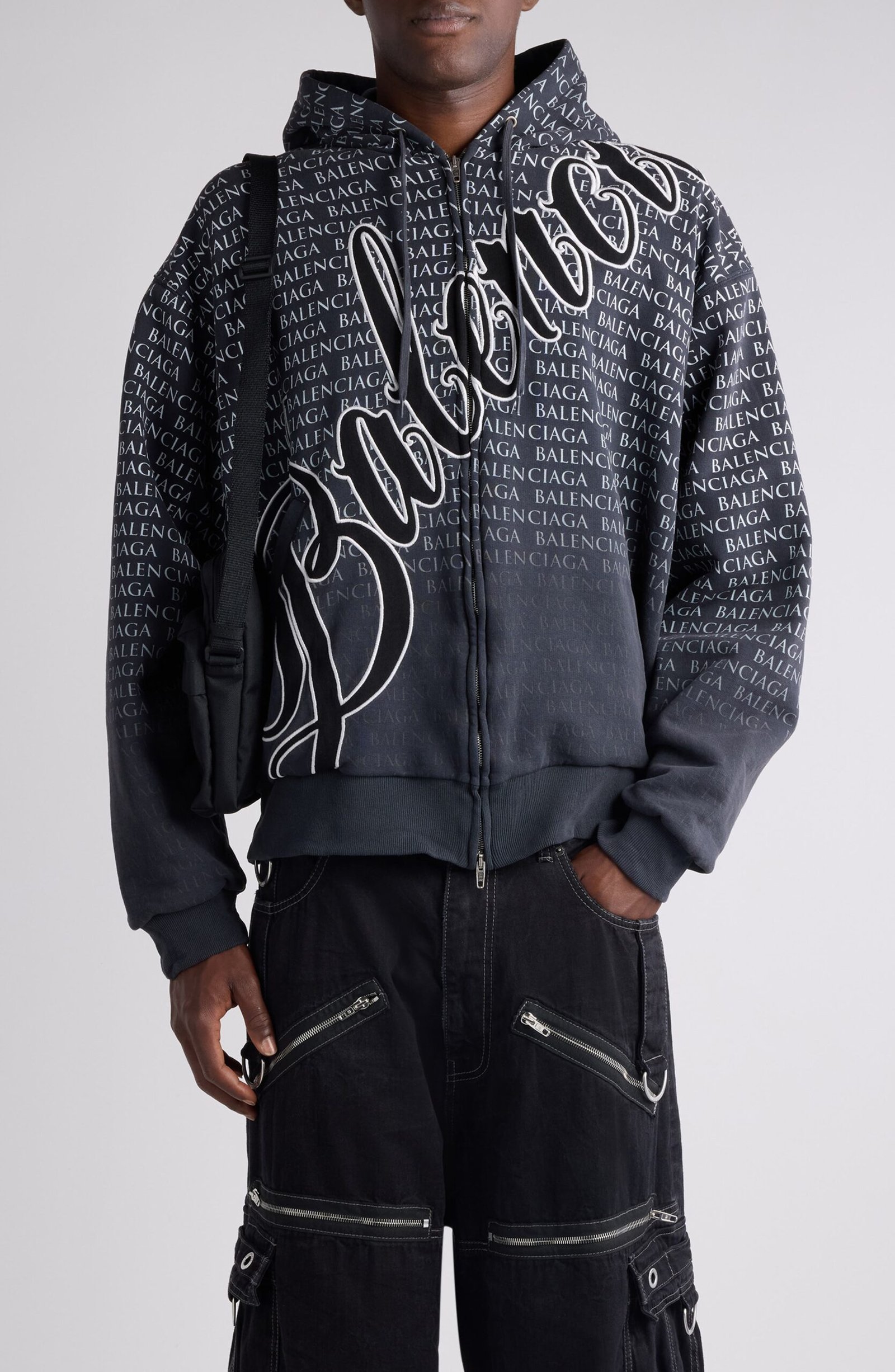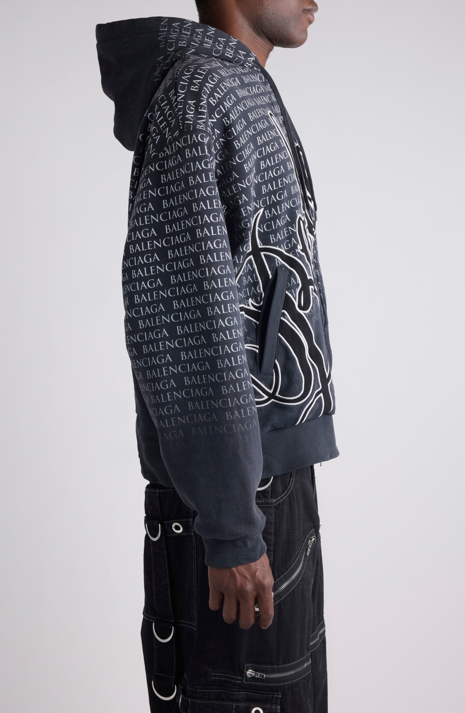 Balenciaga rewrites the rules of branding with this lightweight cotton-fleece hoodie featuring graphic logos in a faded repeat overlaid with the maison’s cursive Big B logo in tact