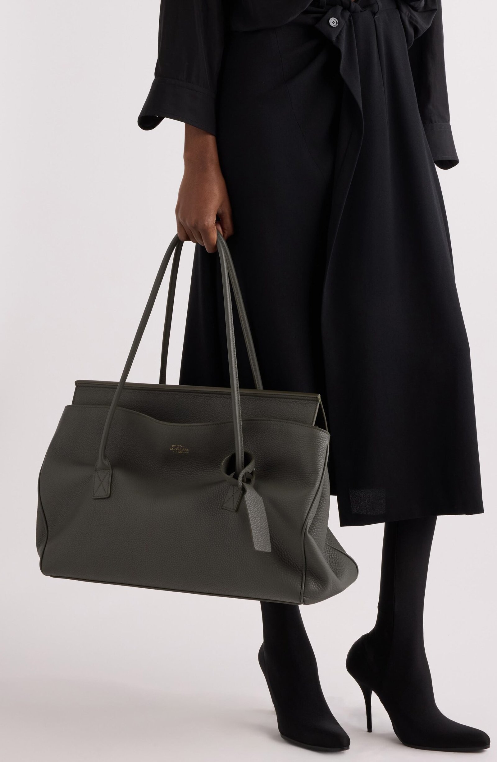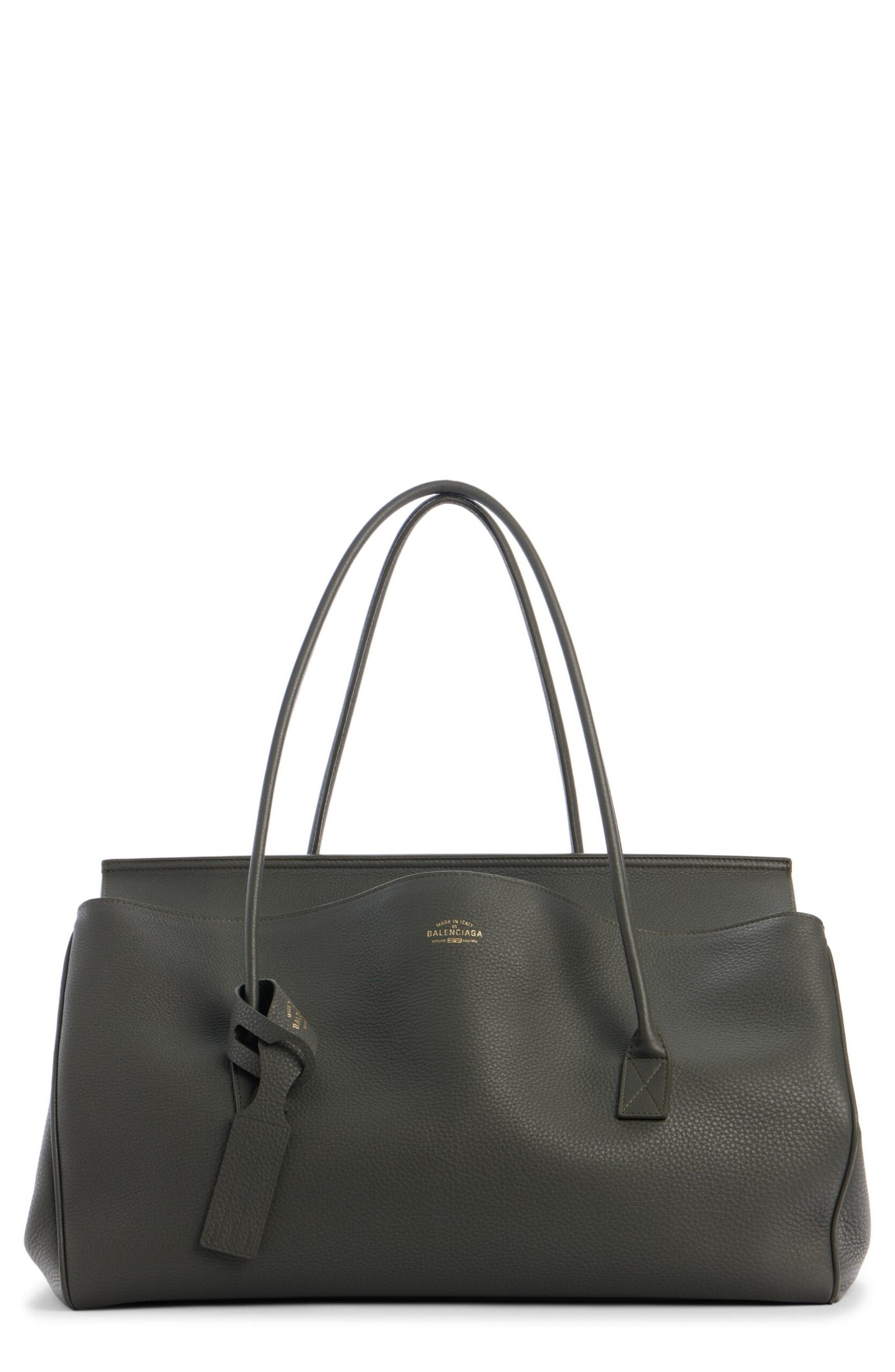 A slouchy bowling-bag-inspired silhouette defines this refined carryall made of grained calfskin leather and topped with rolled handles long enough to sling over your shoulder.