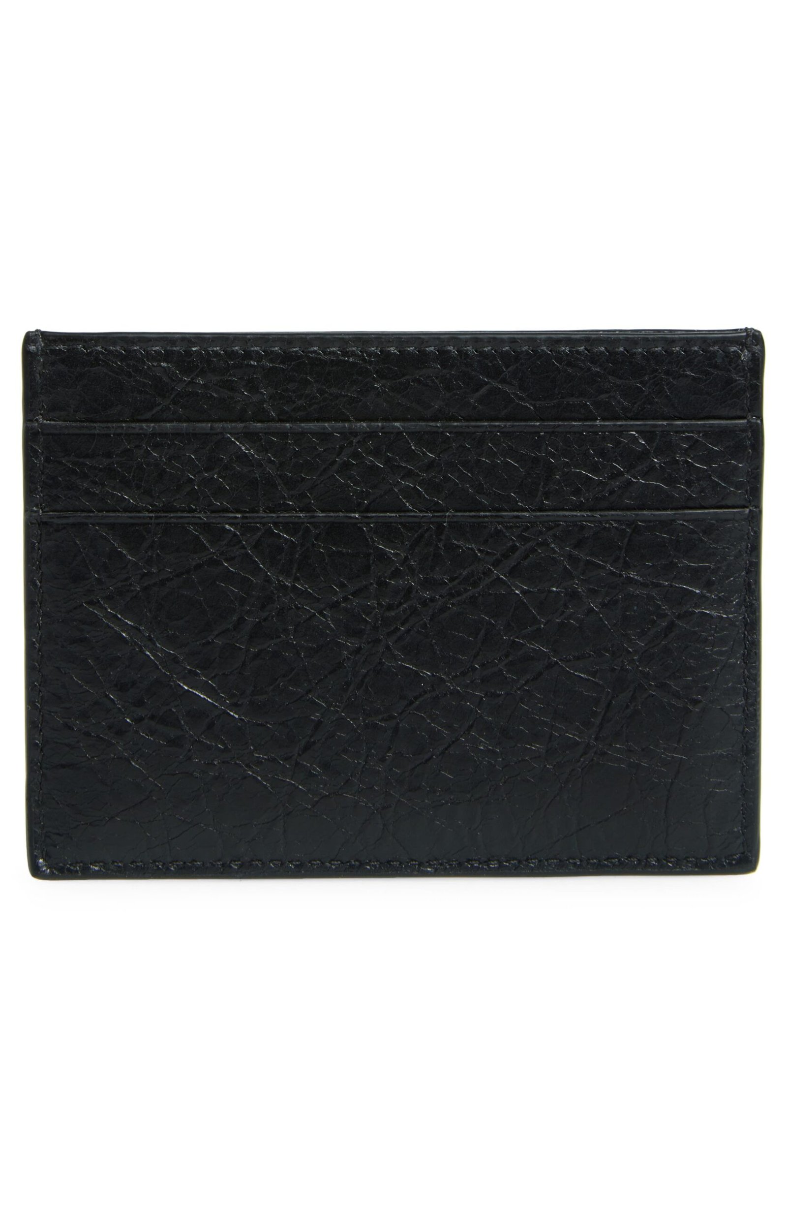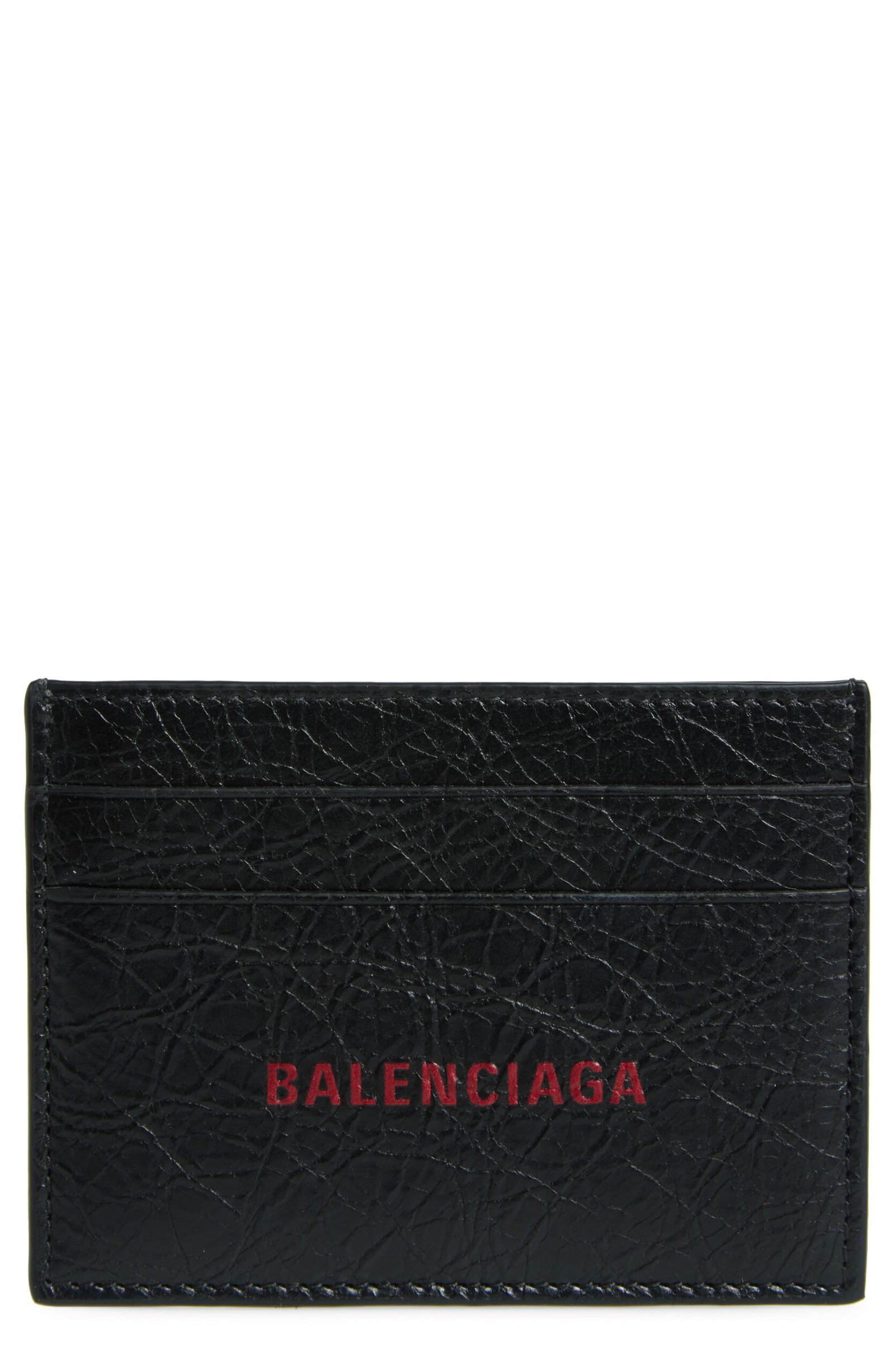 Bold logotype pops against the grainy leather of this Italian card case with a handy center slip pocket for securing cash.