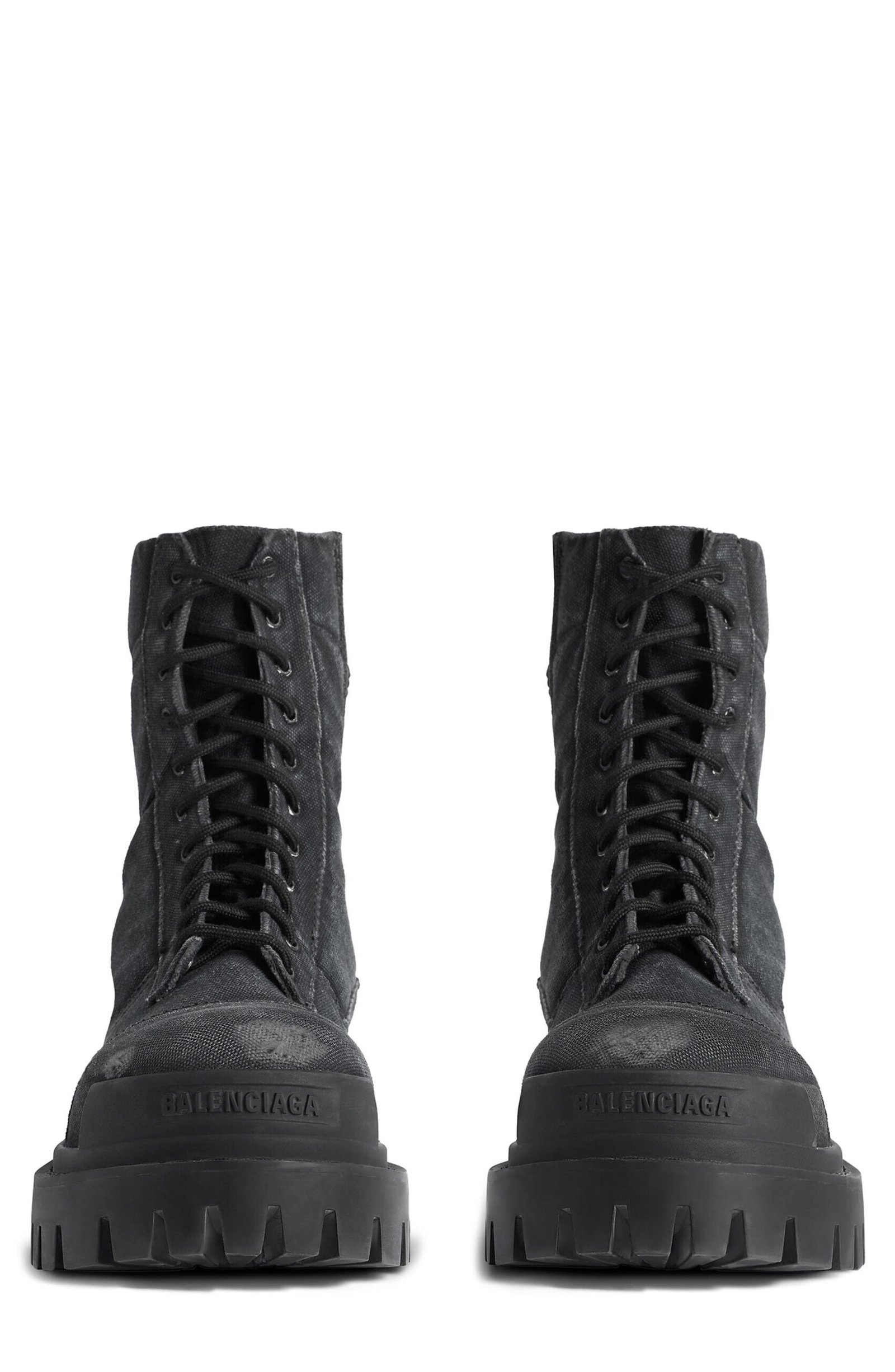 A bulbous toe and superchunky lug sole amplify the no-nonsense attitude of this lace-up combat boot crafted from faded canvas for a battle-worn look.