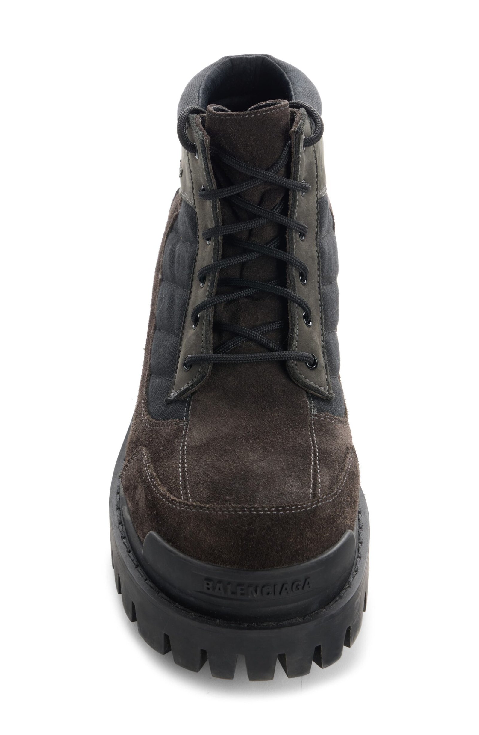 A bulbous toe and superchunky lug sole amplify the no-nonsense attitude of this low-profile combat boot crafted for a battle-worn look from canvas and distressed suede.