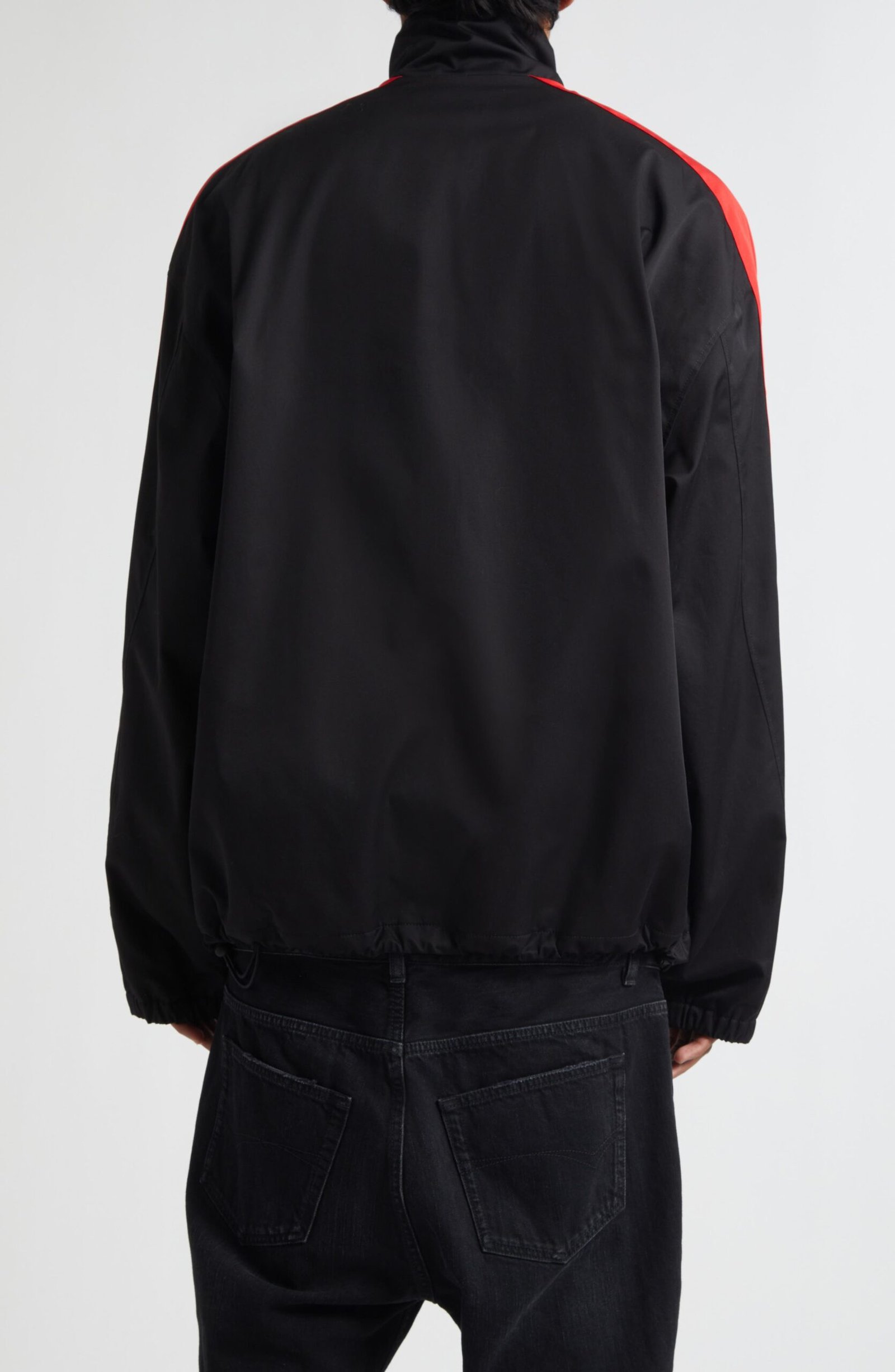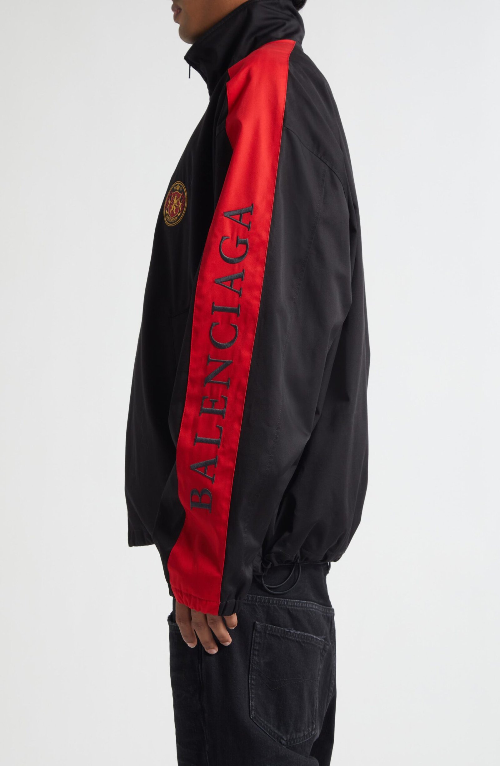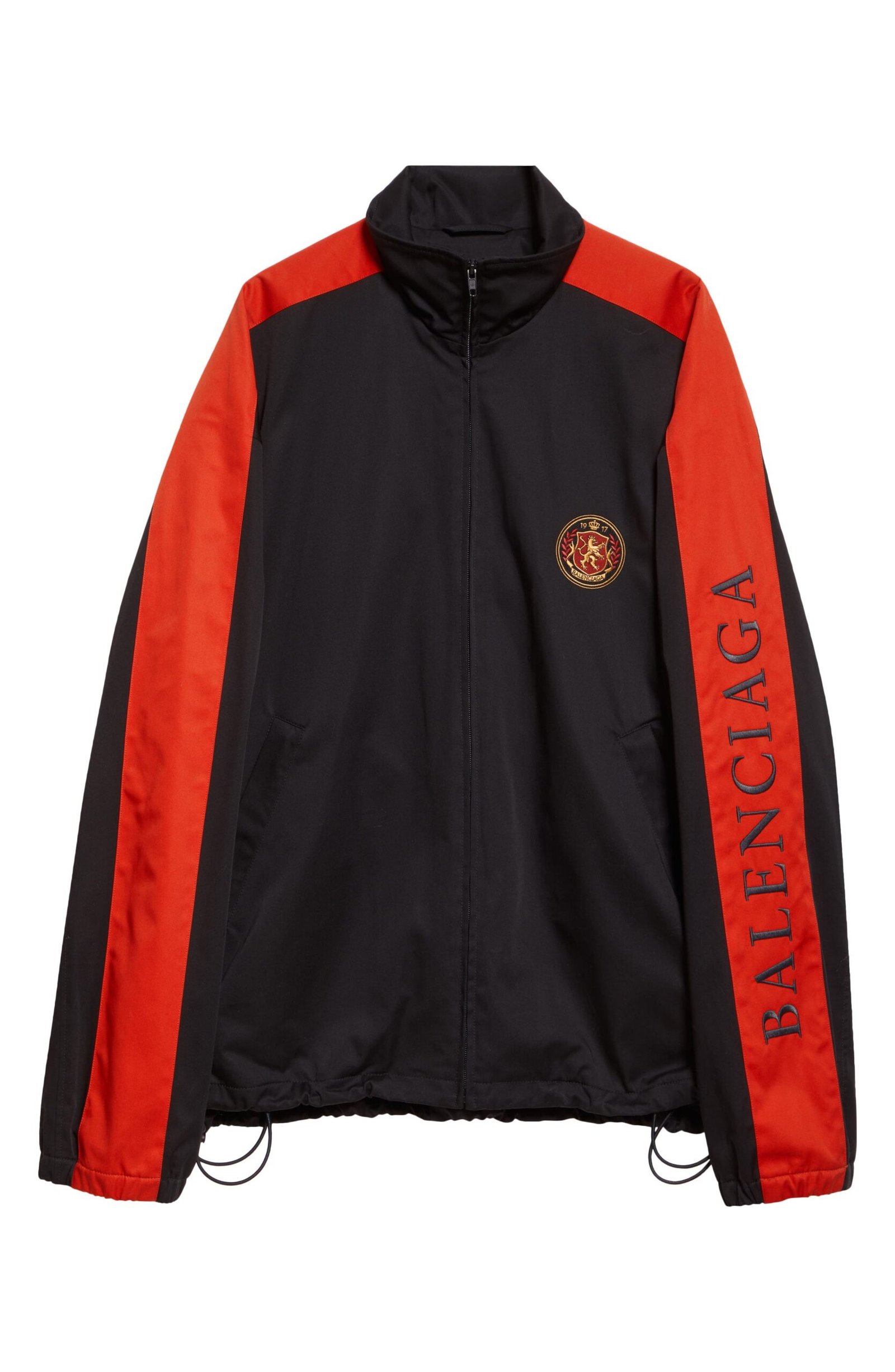An embroidered crest and logo lettering put Balenciaga’s unmistakable stamp on this athleisure-staple track jacket finished with bold stripes.