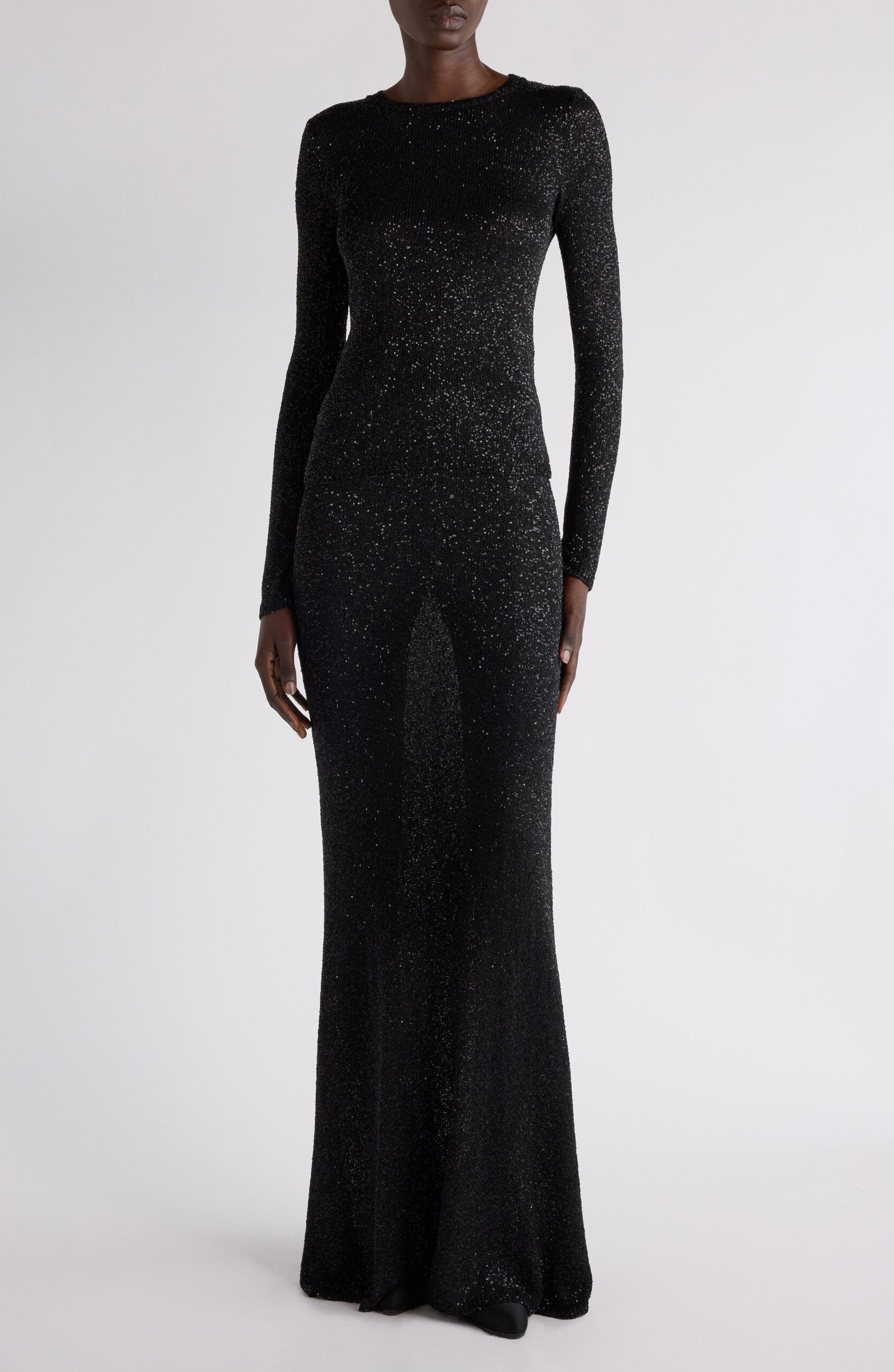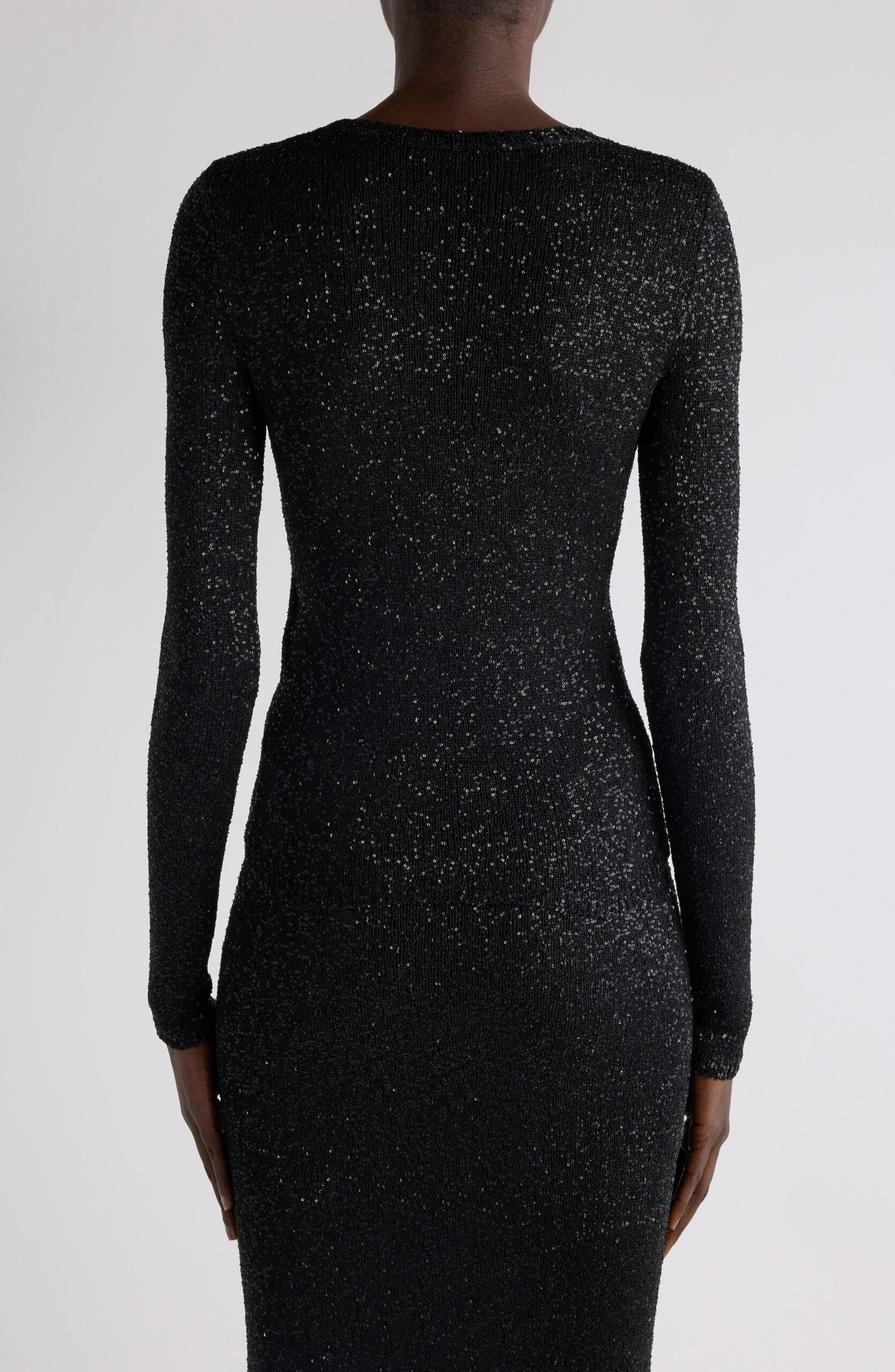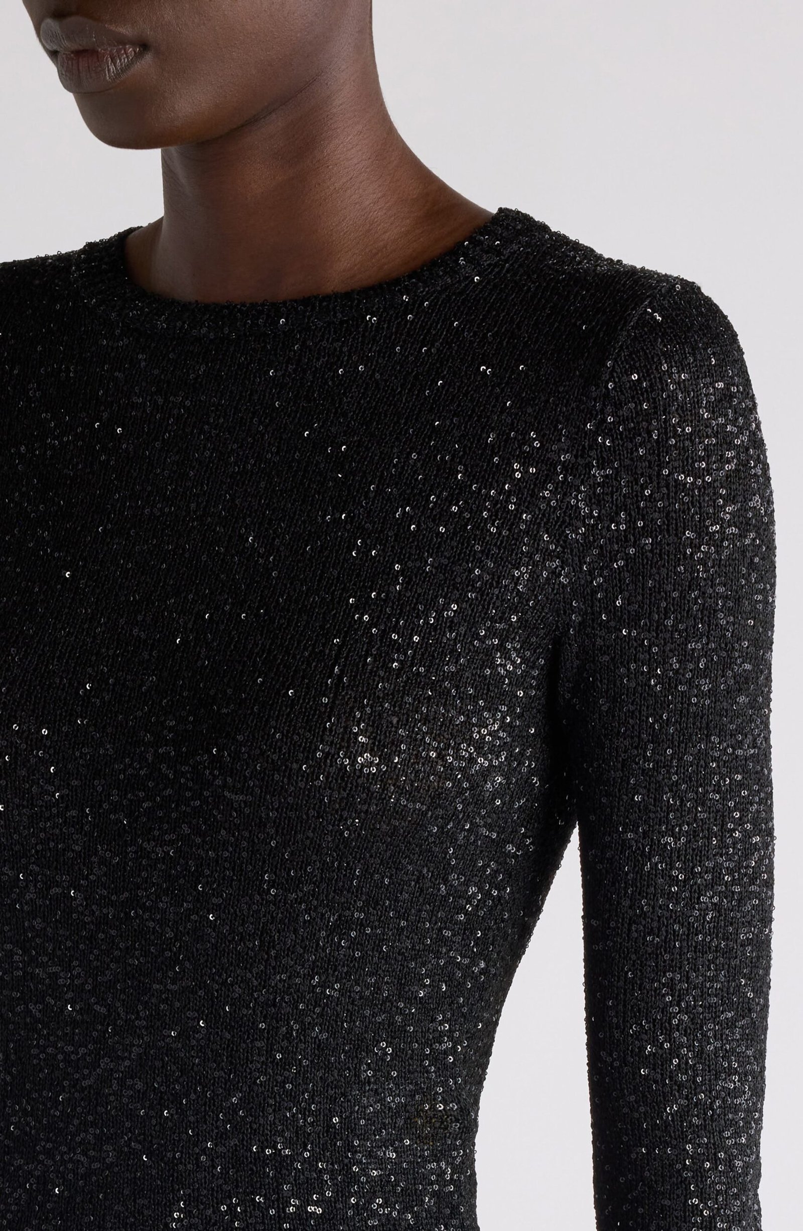Comfort and glamour fuse to fabulous effect in this figure-skimming crewneck sweater decorated in dazzling sequins—a nod to the shimmering skylines of Shanghai, the backdrop for the spring ’25 collection.