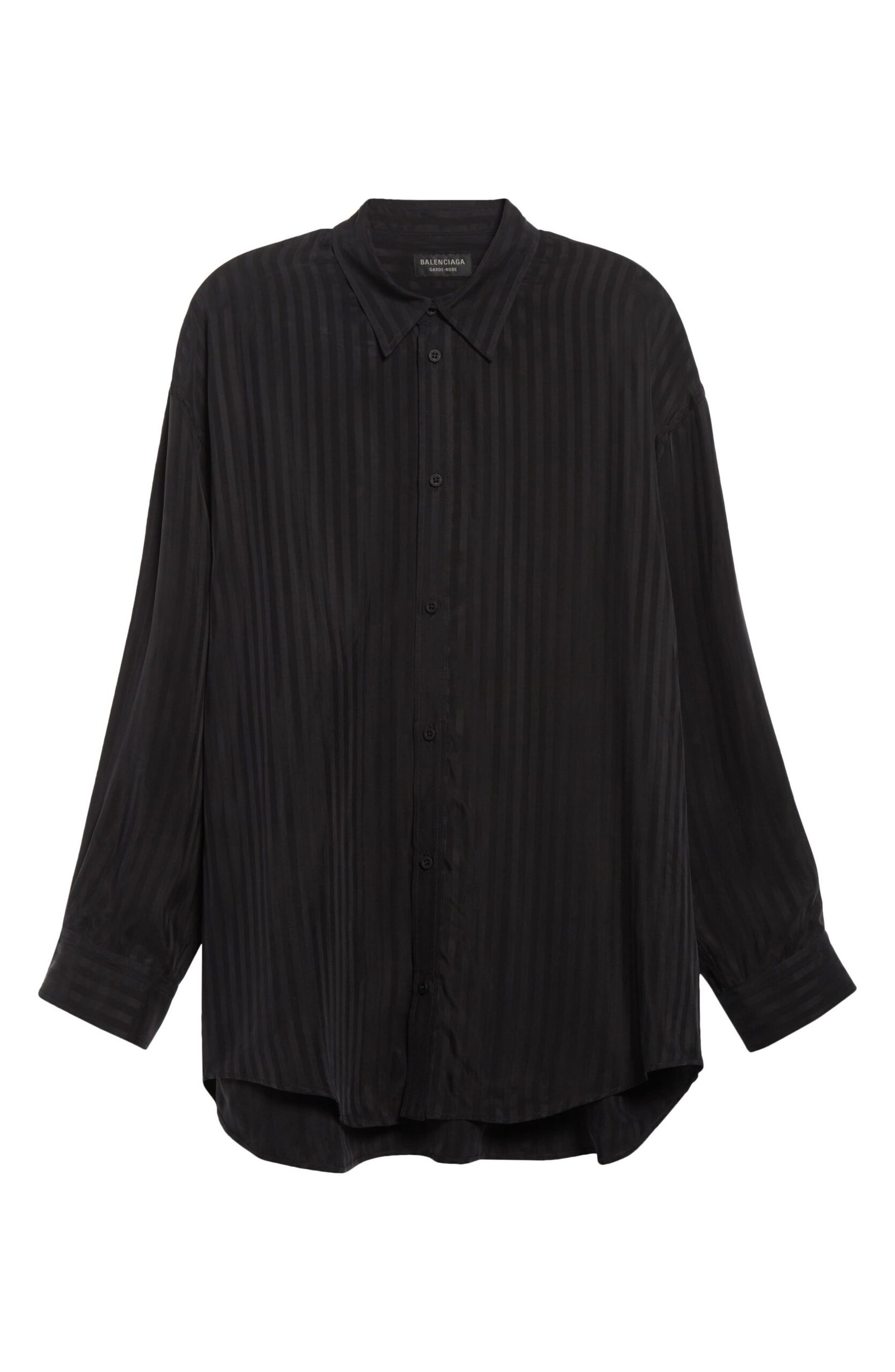 This button-up shirt is pure Balenciaga—bold, unapologetic and dripping with modern edge. Tonal stripes ripple across the silky cupro fabric, while the exaggerated oversized cut tr