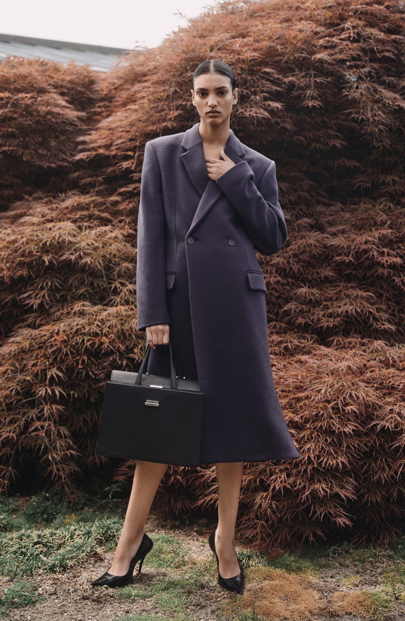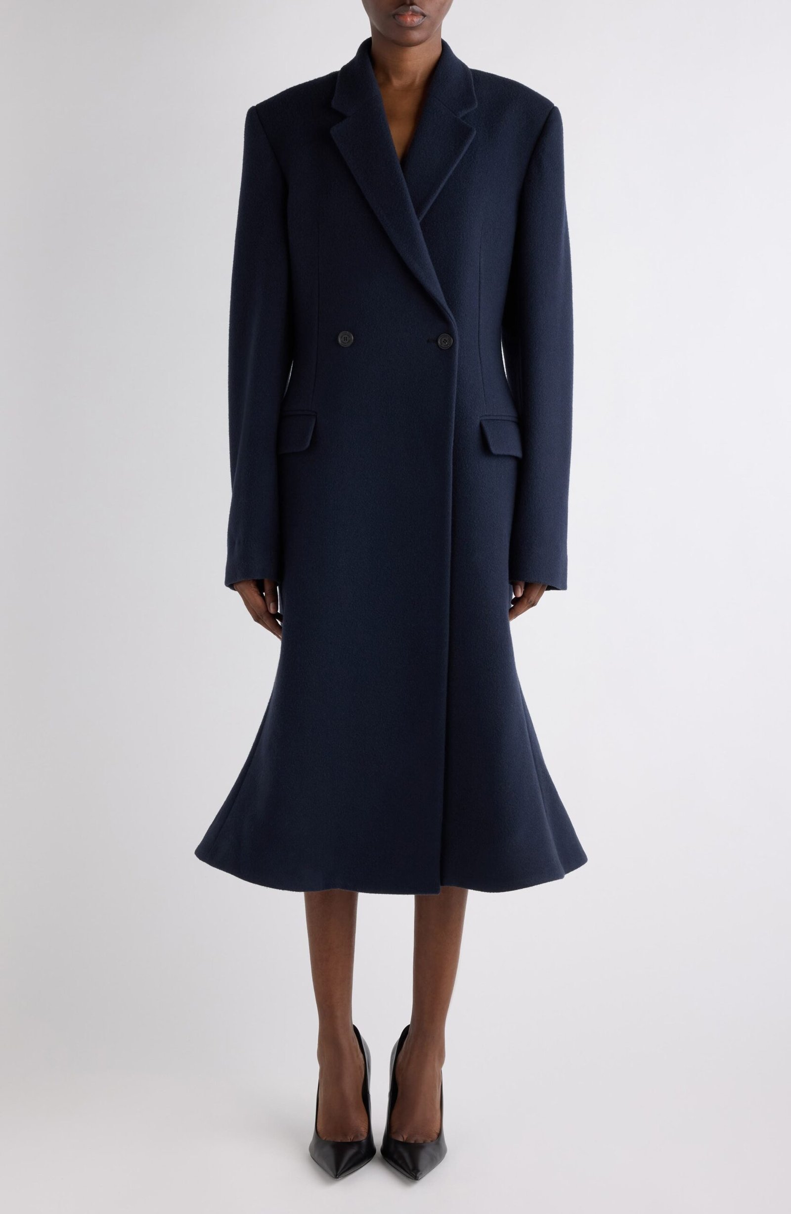 Demna’s signature volume codes find their most commanding expression in this coat, a longline sweep that narrows through the torso then releases into a dramatic flare sculpted by g