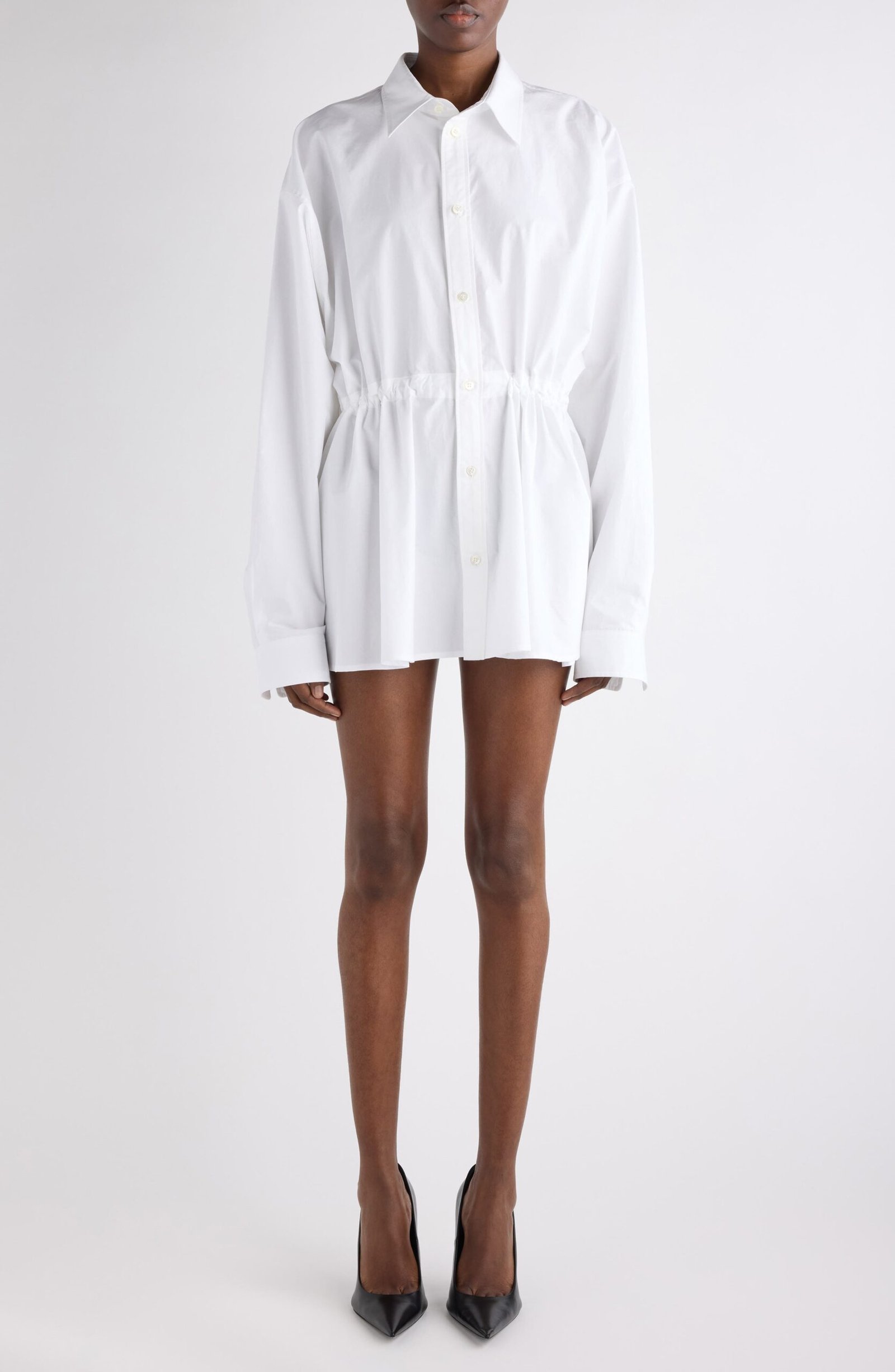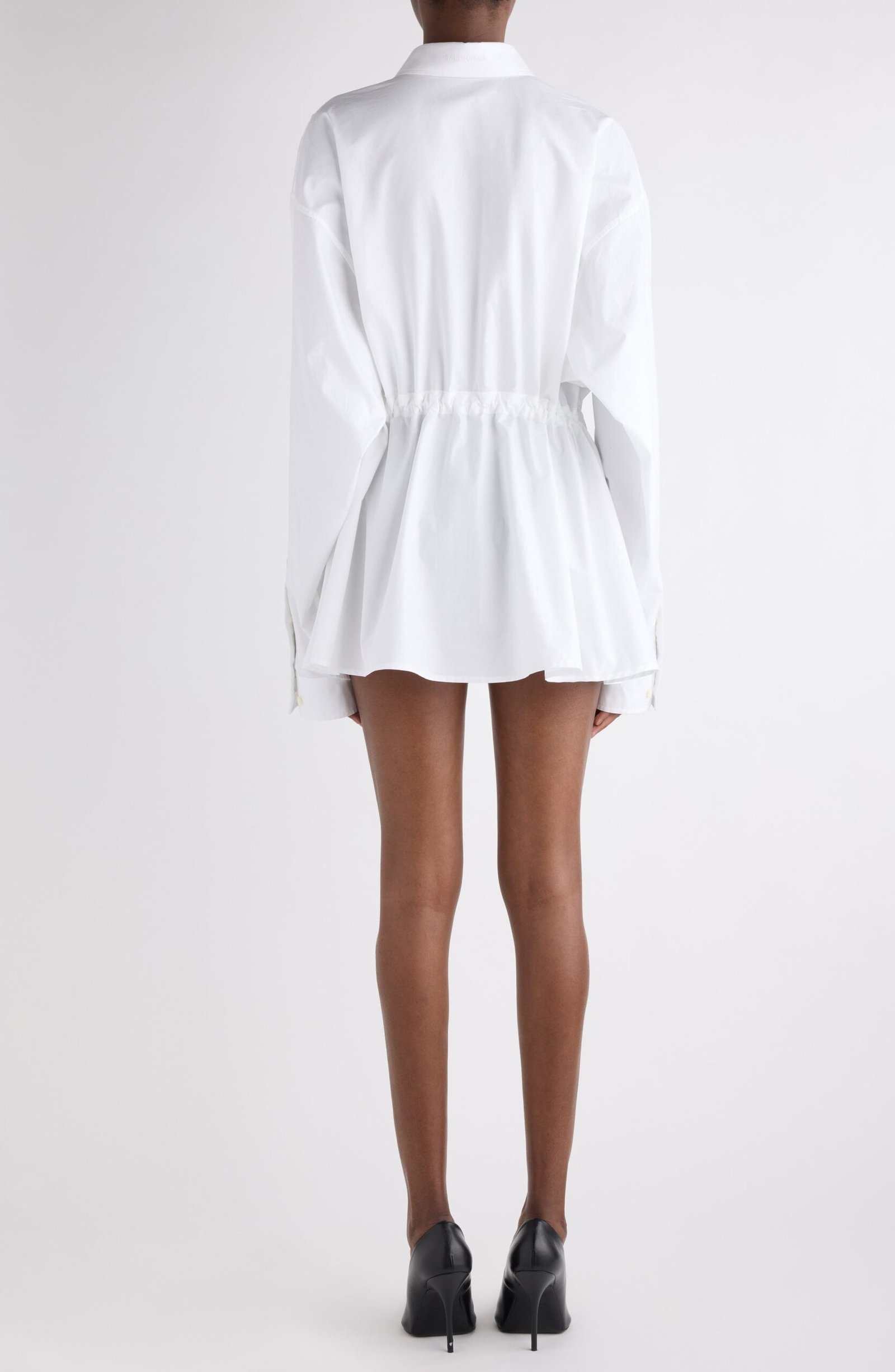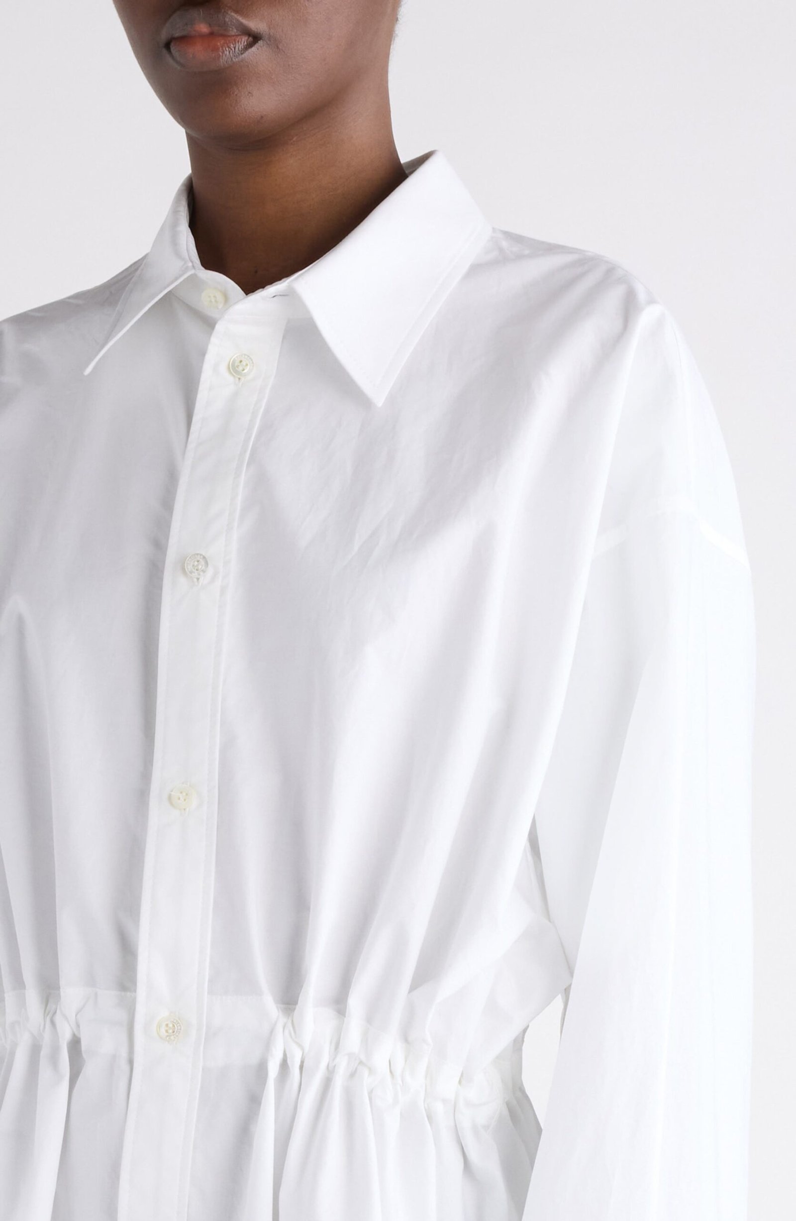 The label revisits the iconic hourglass shape with this cotton-poplin shirt that deftly channels the exaggerated tailoring of master courtier Cristóbal Balenciaga.