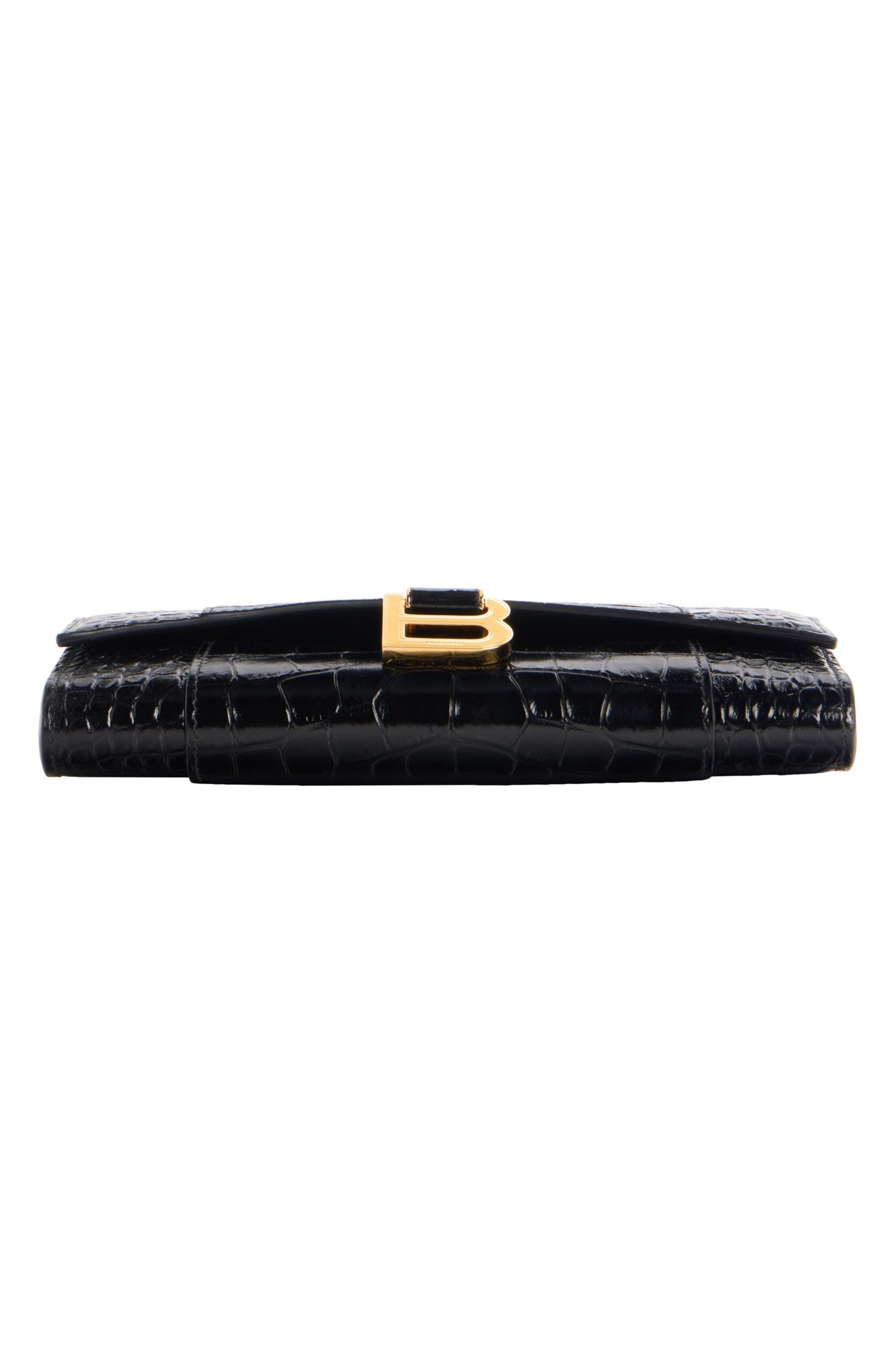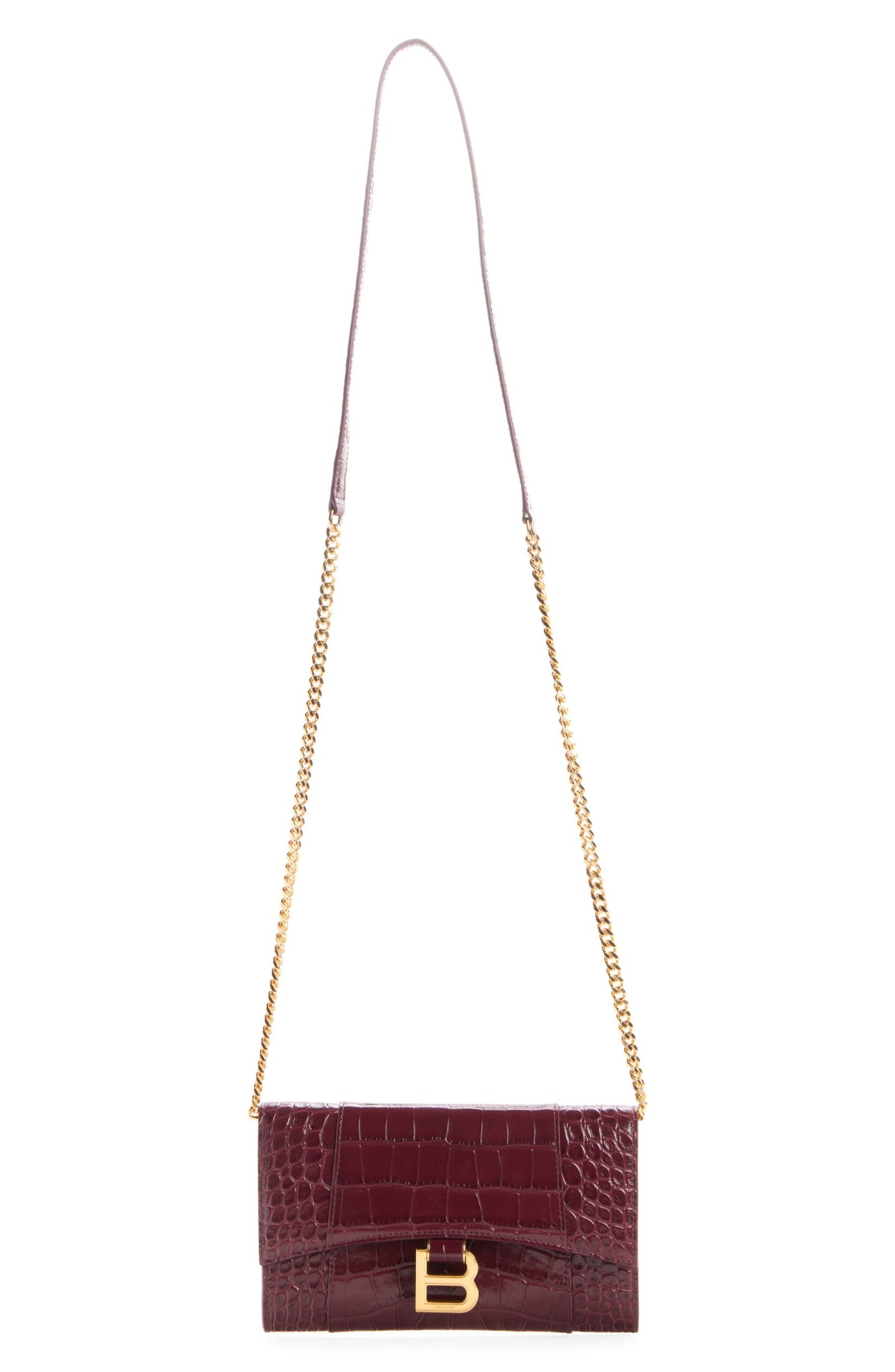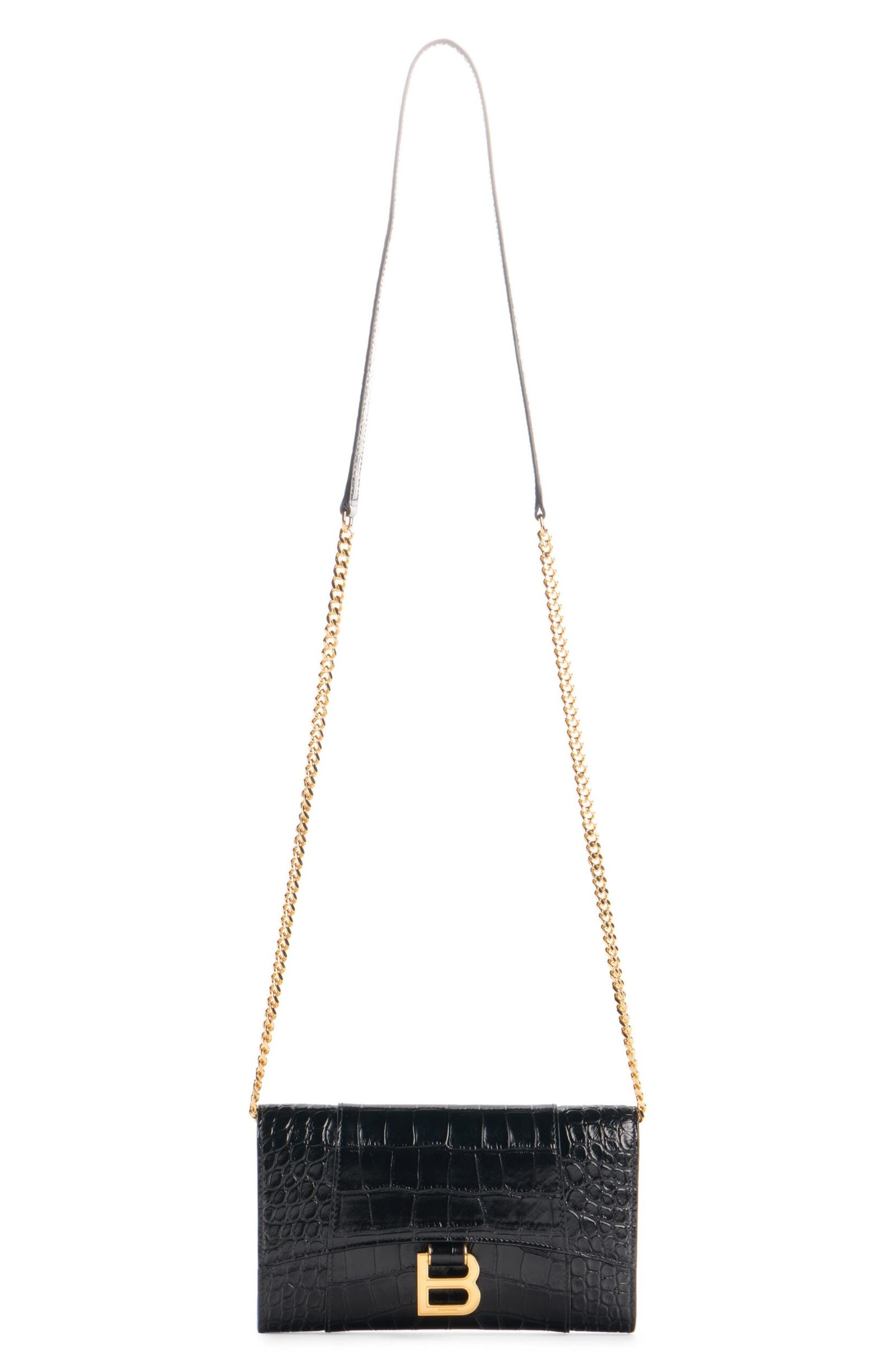 The hourglass silhouettes often used by master couturier Cristóbal Balenciaga inspire the curvilinear silhouette of this croc-embossed leather wallet suspended from a gleaming chain strap. B-shaped hardware reveres the brand’s legacy while offering a refined take on logomania.