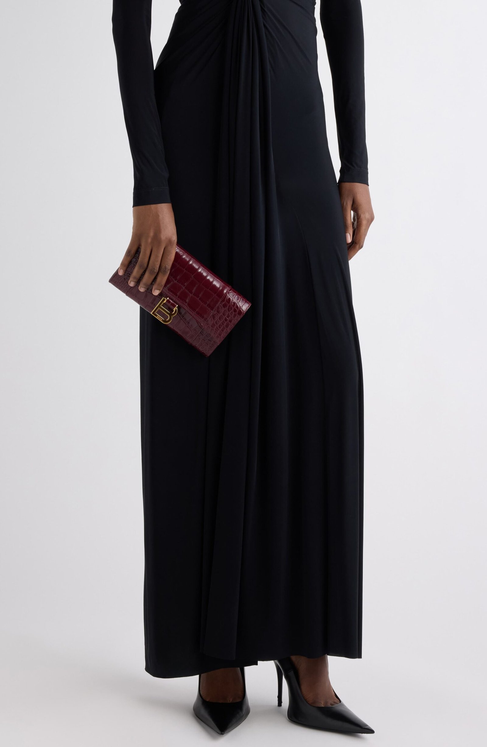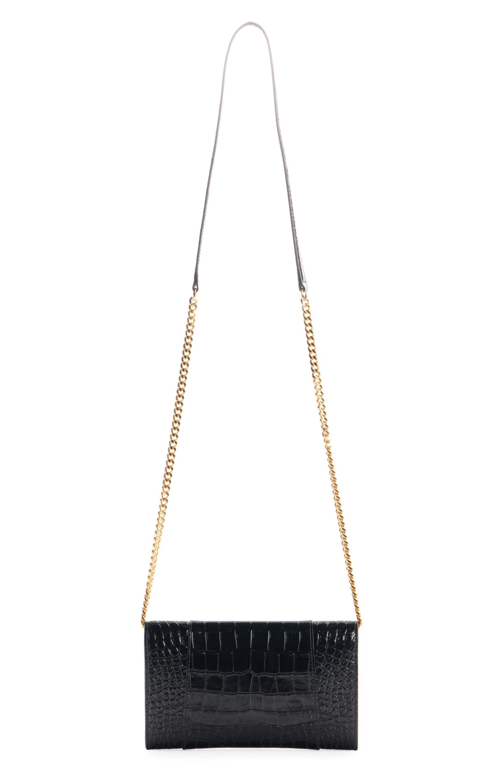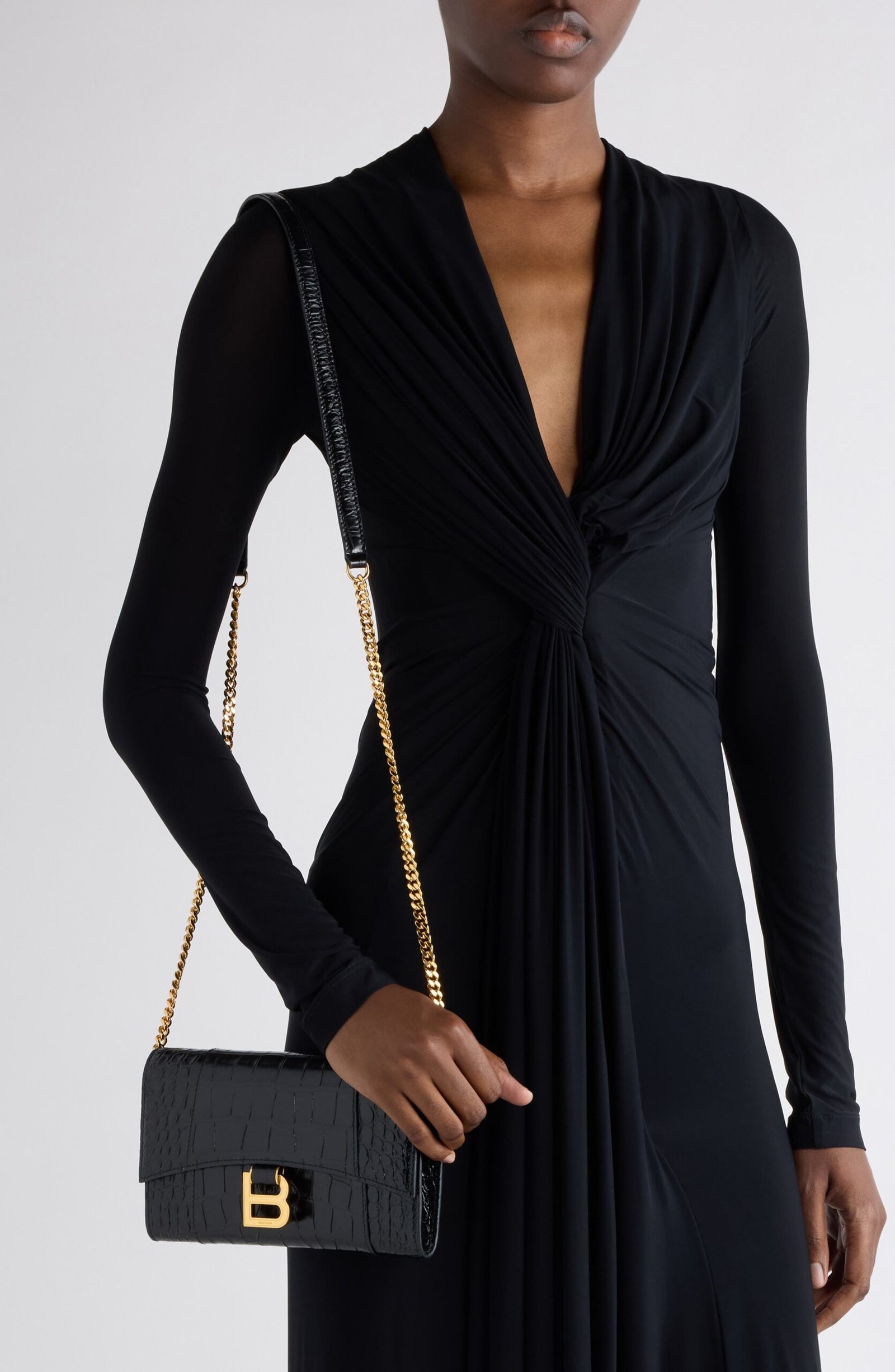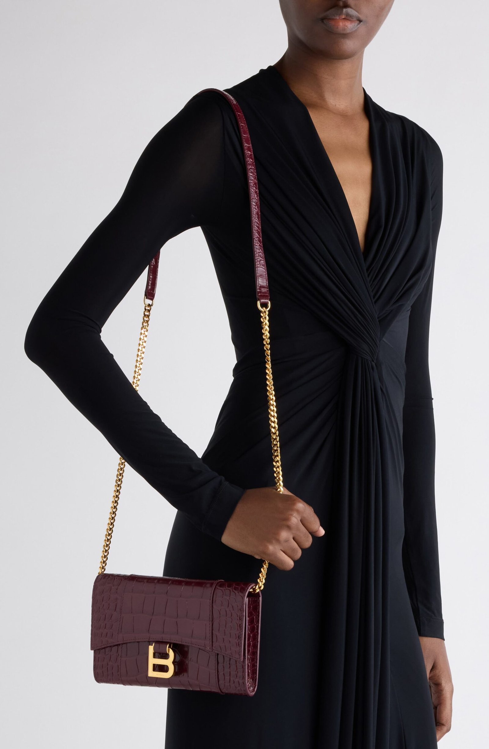 The hourglass silhouettes often used by master couturier Cristóbal Balenciaga inspire the curvilinear silhouette of this croc-embossed leather wallet suspended from a gleaming chain strap. B-shaped hardware reveres the brand’s legacy while offering a refined take on logomania.