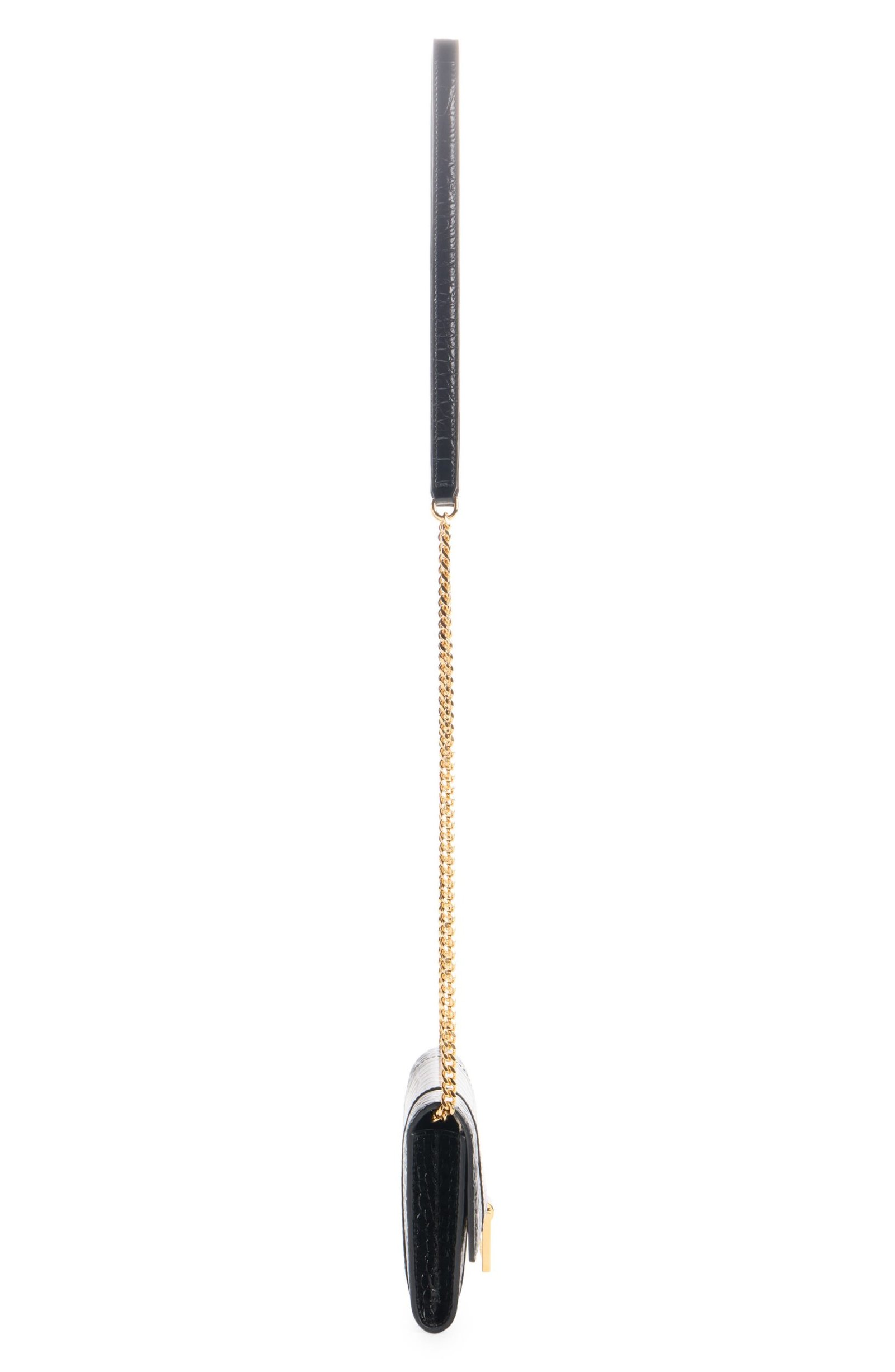The hourglass silhouettes often used by master couturier Cristóbal Balenciaga inspire the curvilinear silhouette of this croc-embossed leather wallet suspended from a gleaming chai