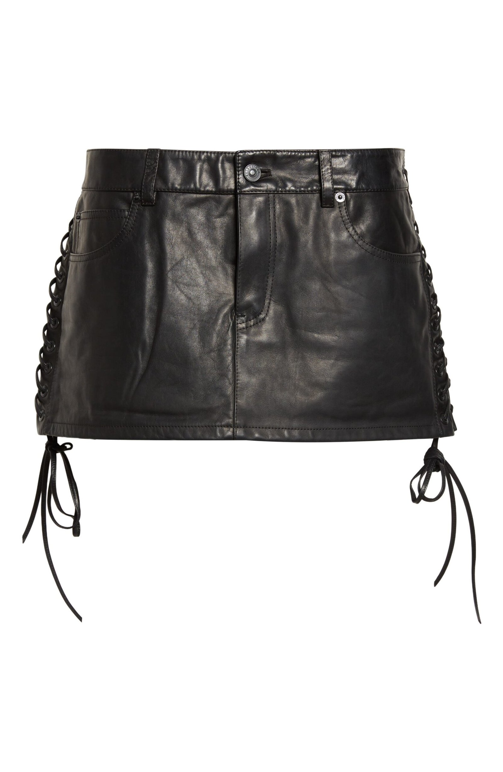 Known for his cheeky sartorial send-ups, Demna elevates underpinnings for nights out in this glossy Italian-leather miniskirt with lace-up accents borrowed from lingerie styles.
