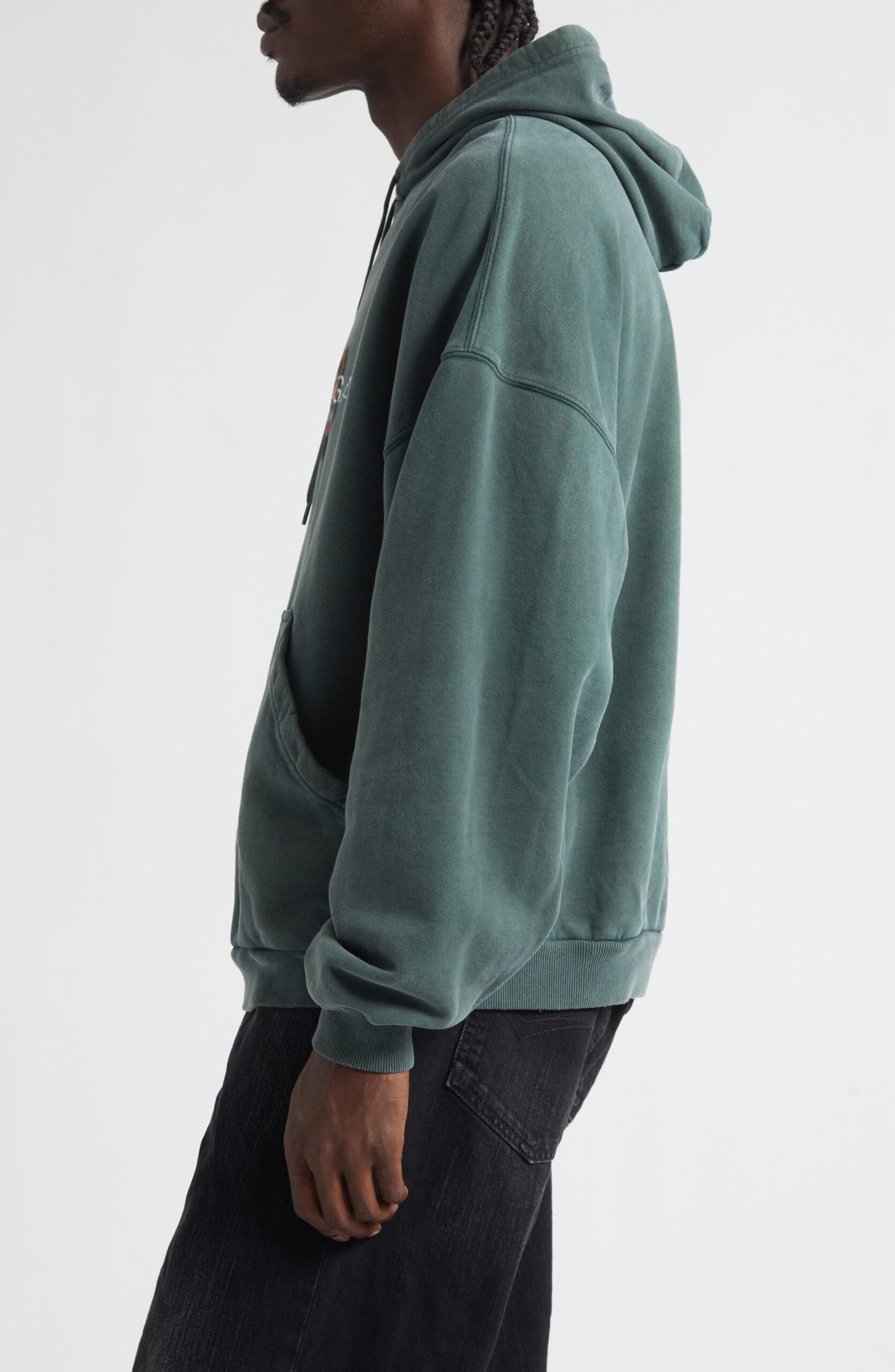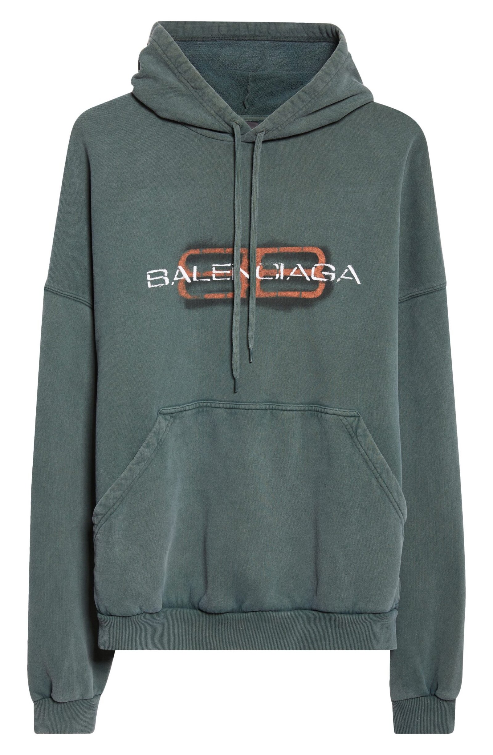 Loaded with art-house swagger, this faded cotton hoodie showcases layered logos that look spray-painted across the chest in a moderately oversized frame.