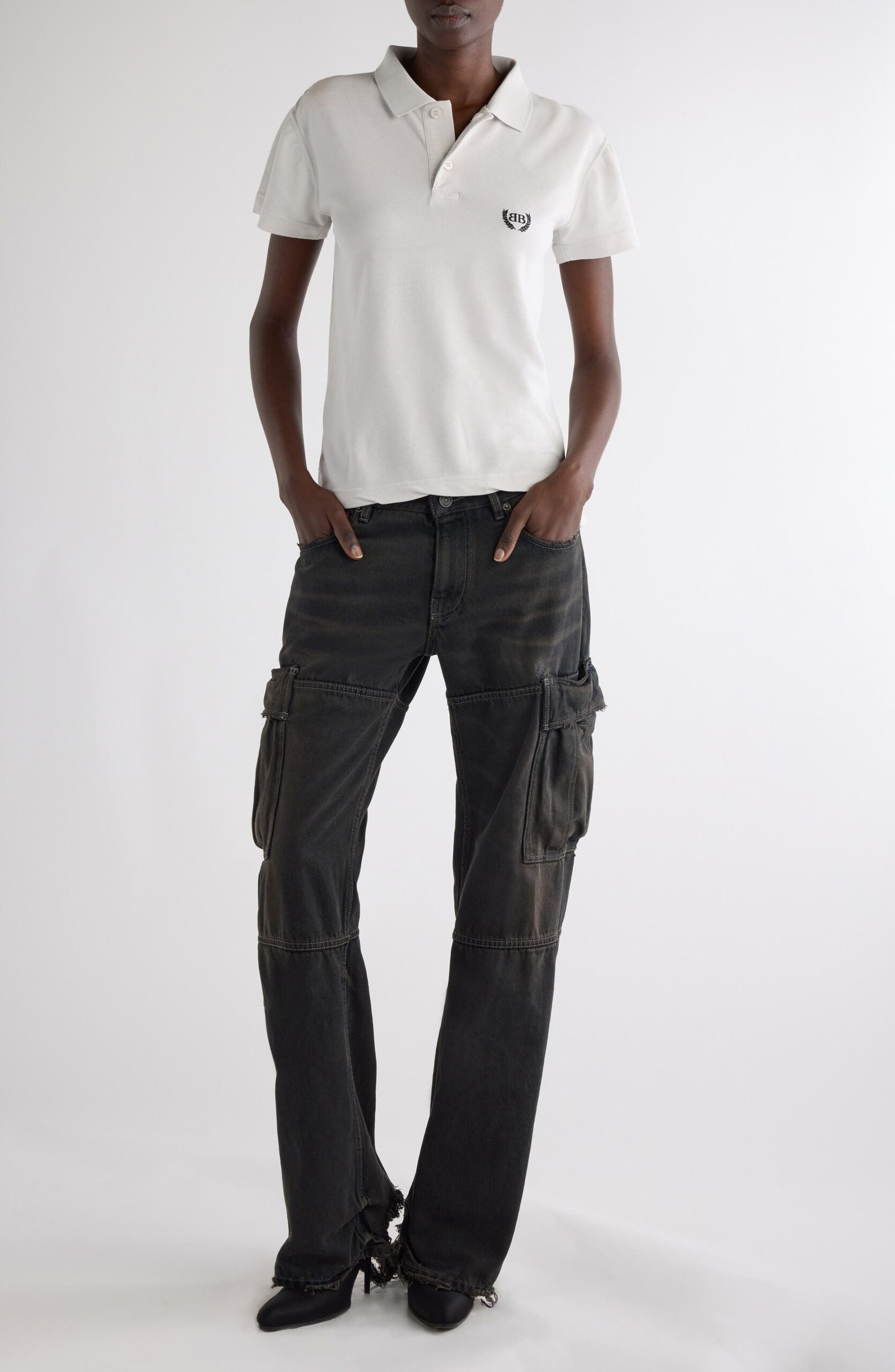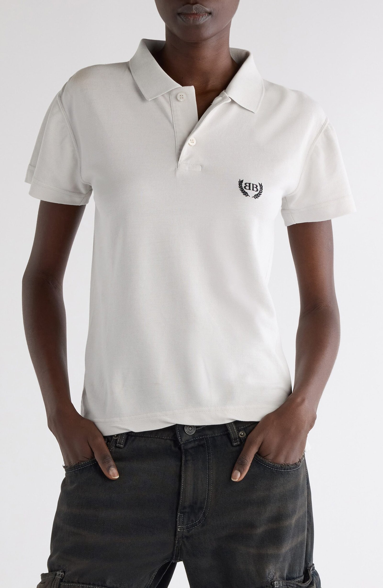 Laurel embroidery hints at preppy provenance on this fitted cotton-piqué polo, but even collegiate classics turn subversive under Demna’s supervision—hence the rumpled asymmetric h