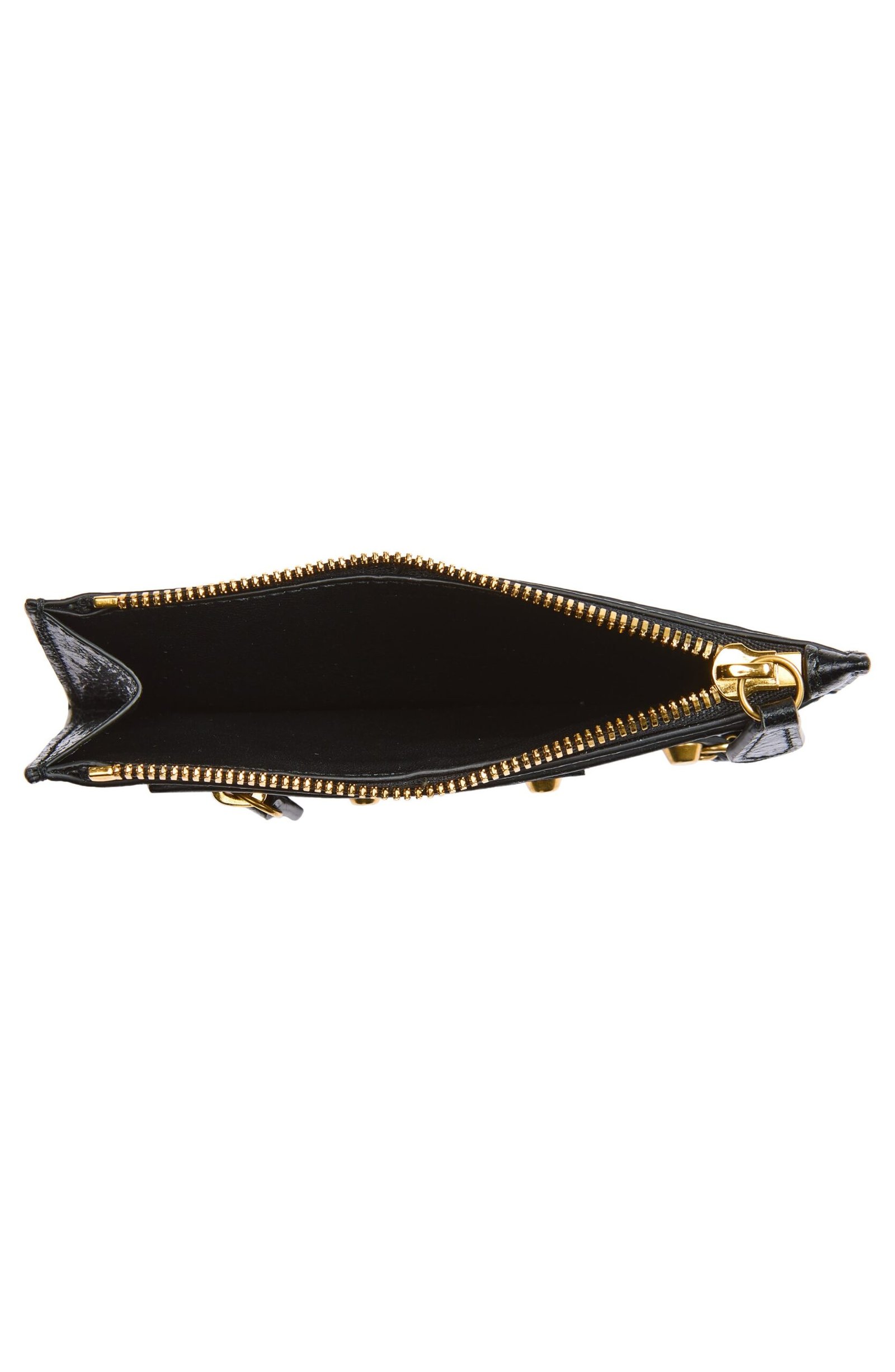 Glossy, crackled lambskin leather and antiqued stud hardware from Balenciaga’s Y2K-coded Le City collection bring high fashion to this scaled-down card case.