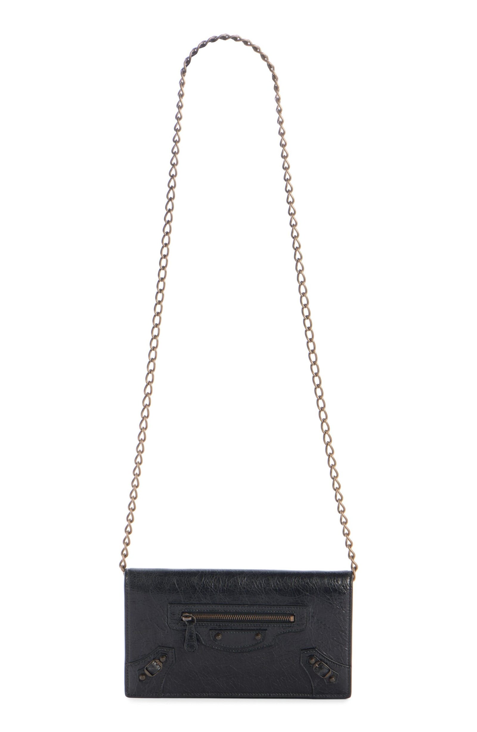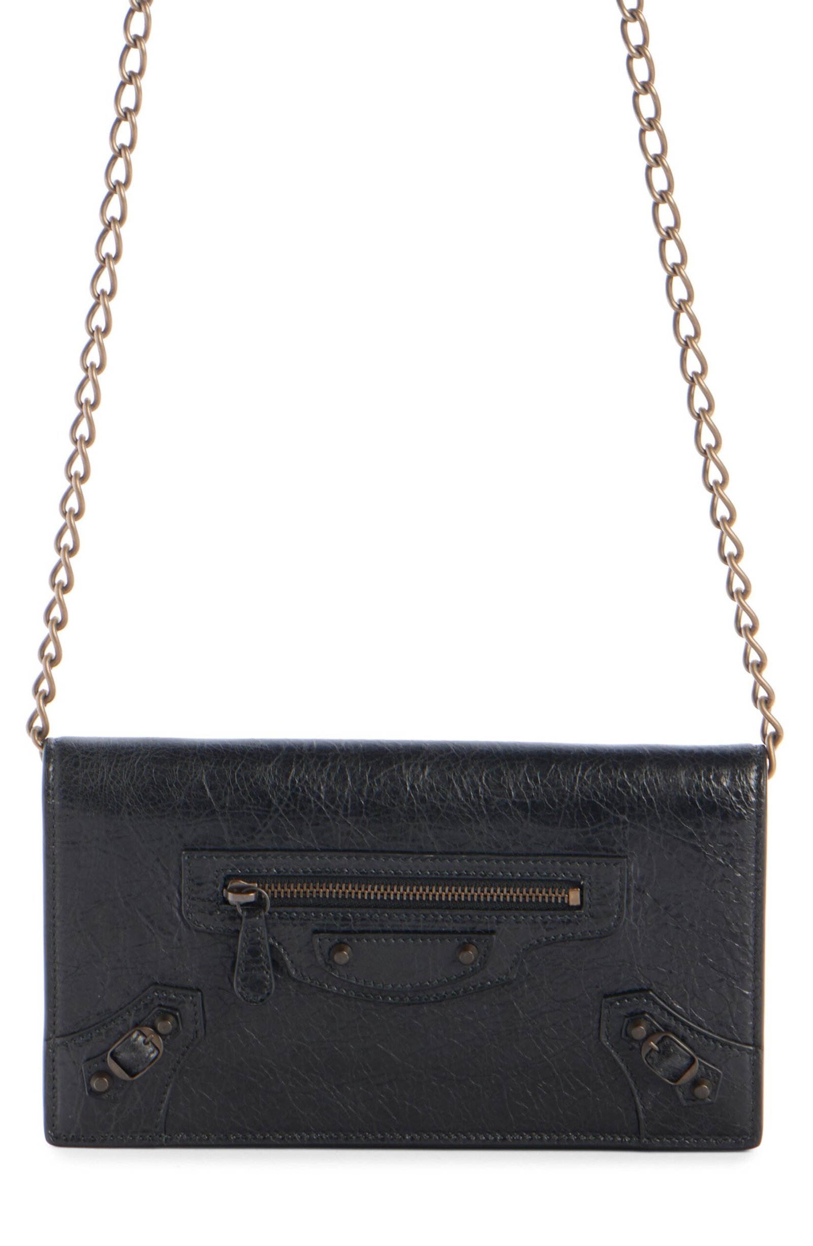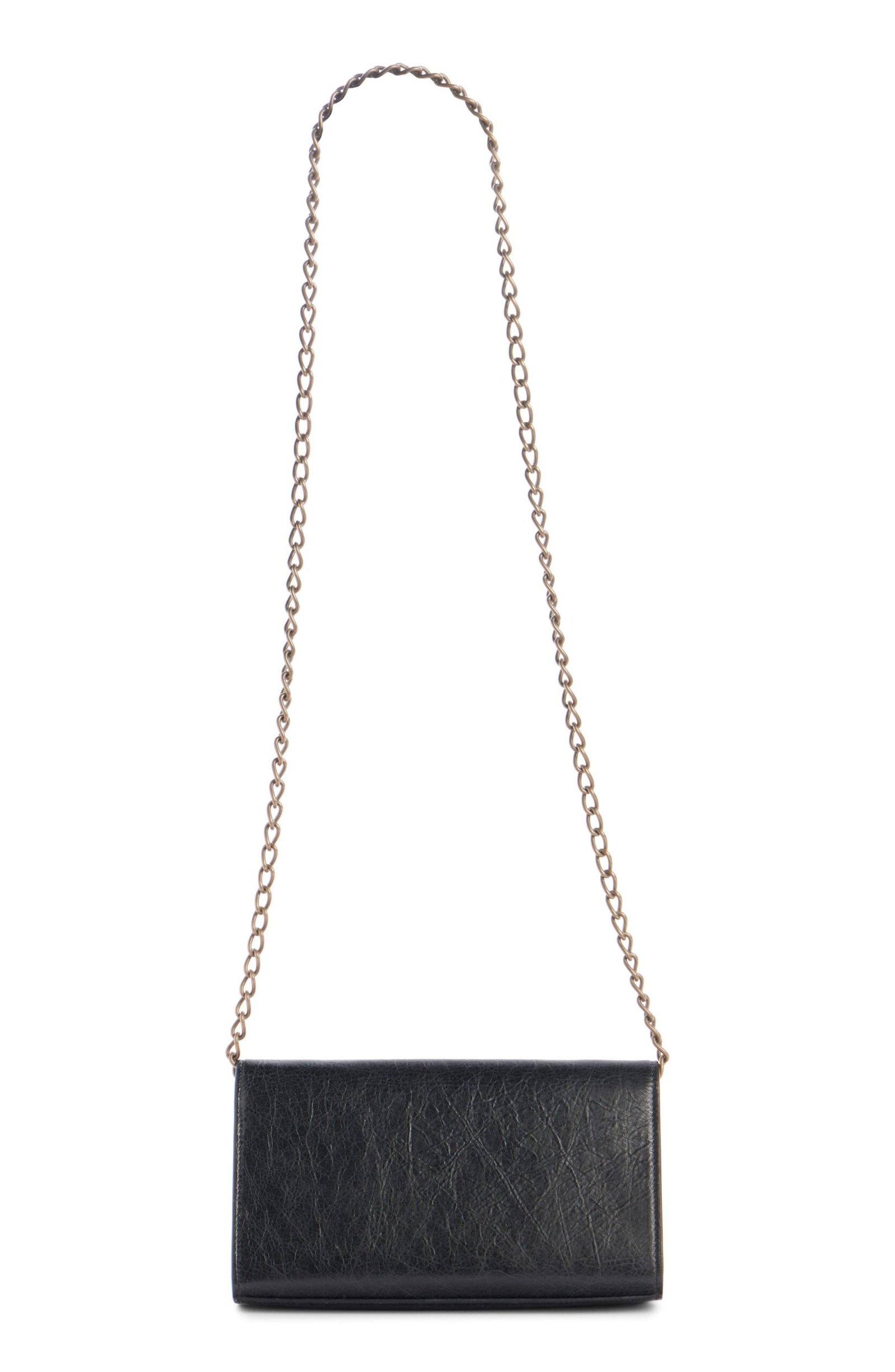 Balenciaga relaunches its metropolitan line with this wallet on a chain crafted from crinkled lambskin leather and kept classic with matte hardware and buckled tabs.