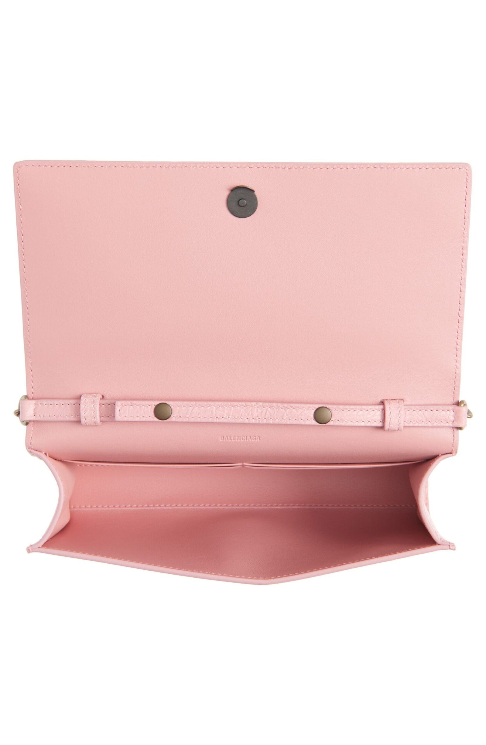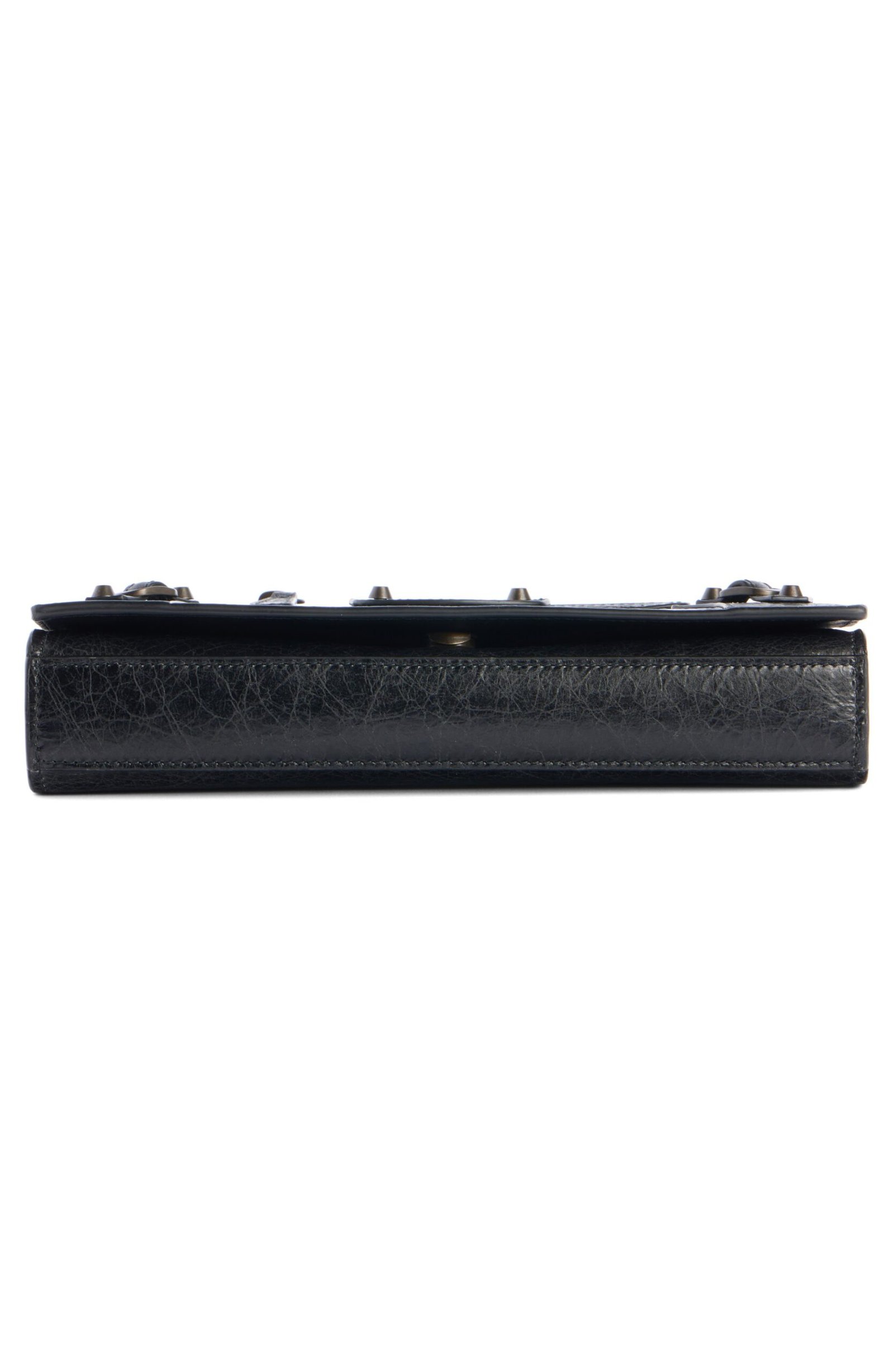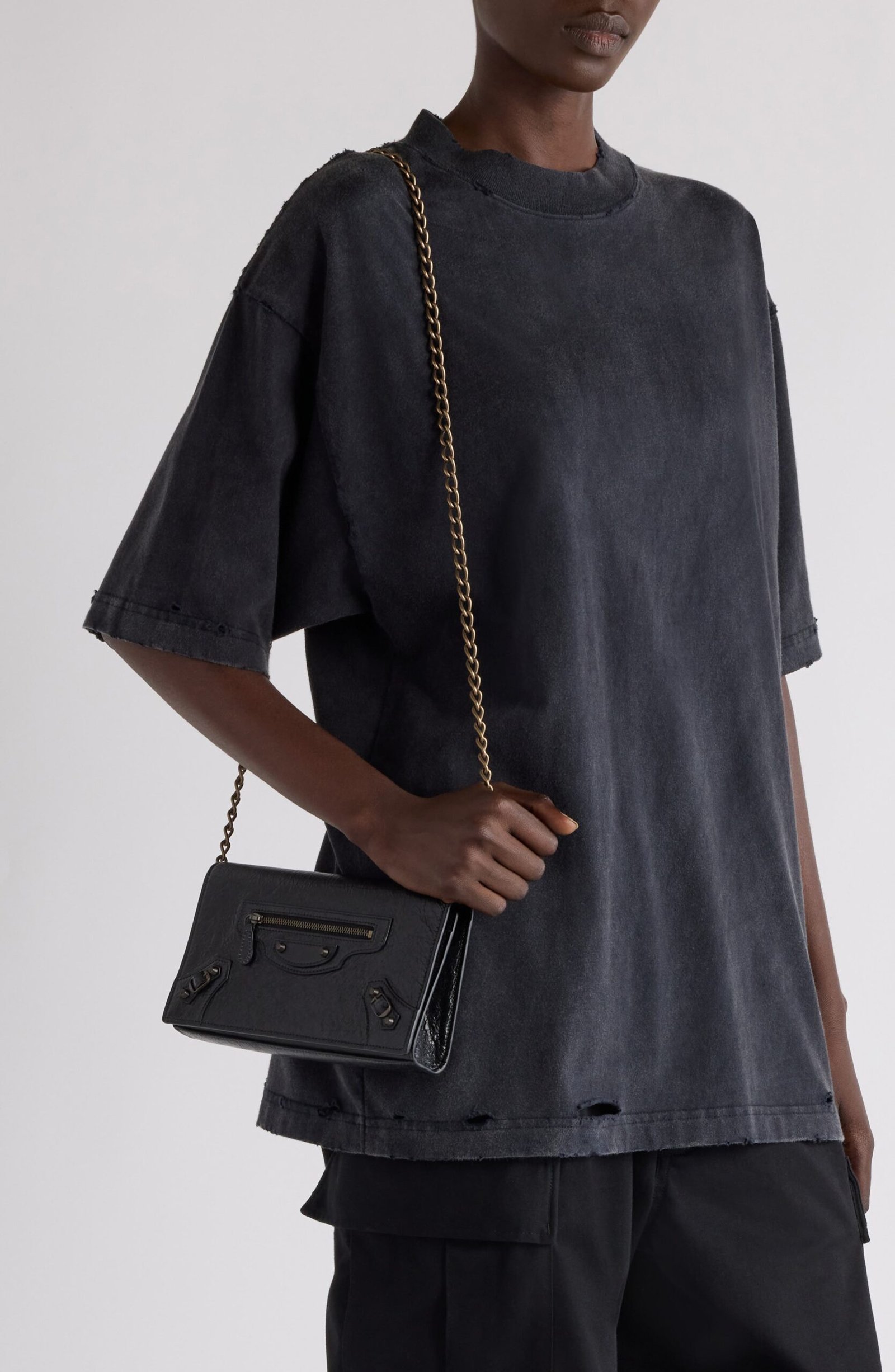 Balenciaga relaunches its metropolitan line with this wallet on a chain crafted from crinkled lambskin leather and kept classic with matte hardware and buckled tabs.