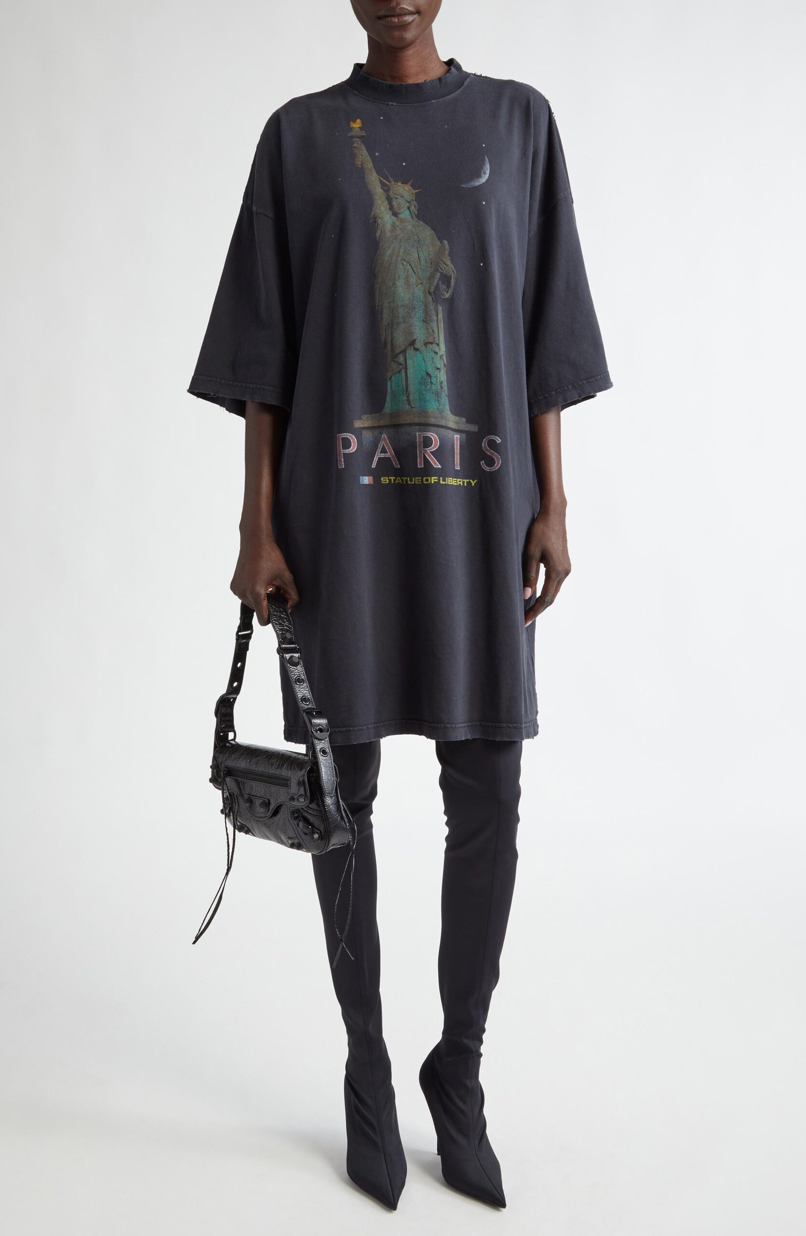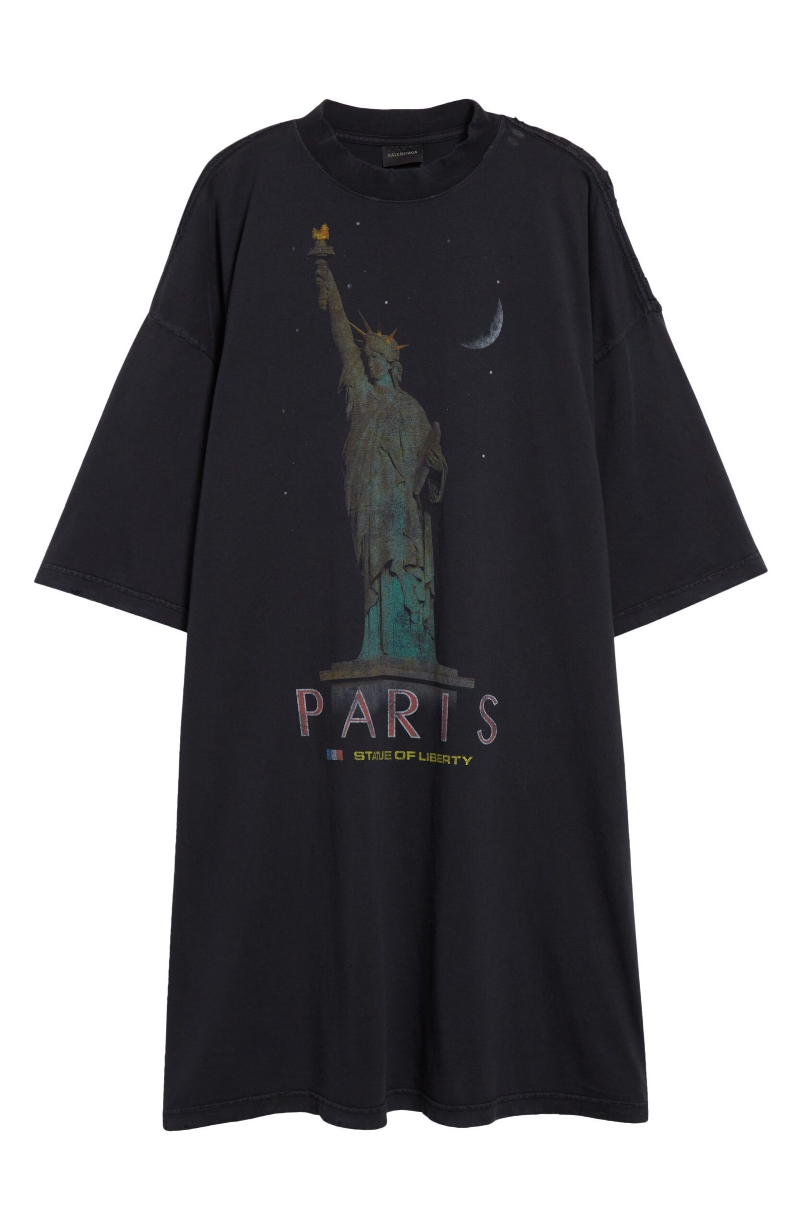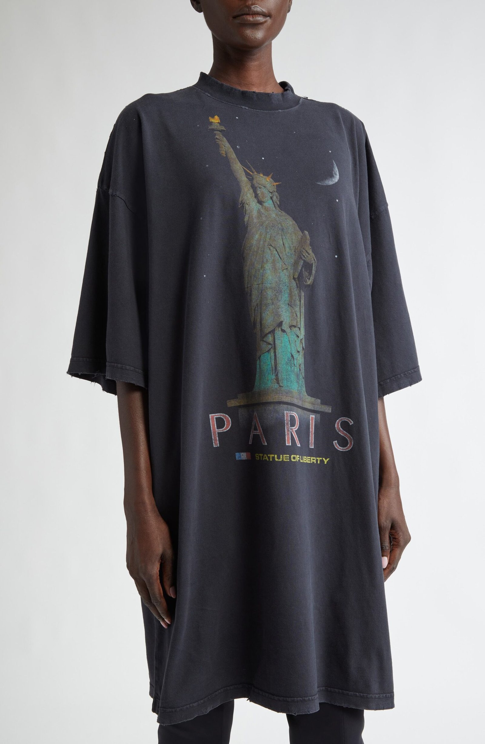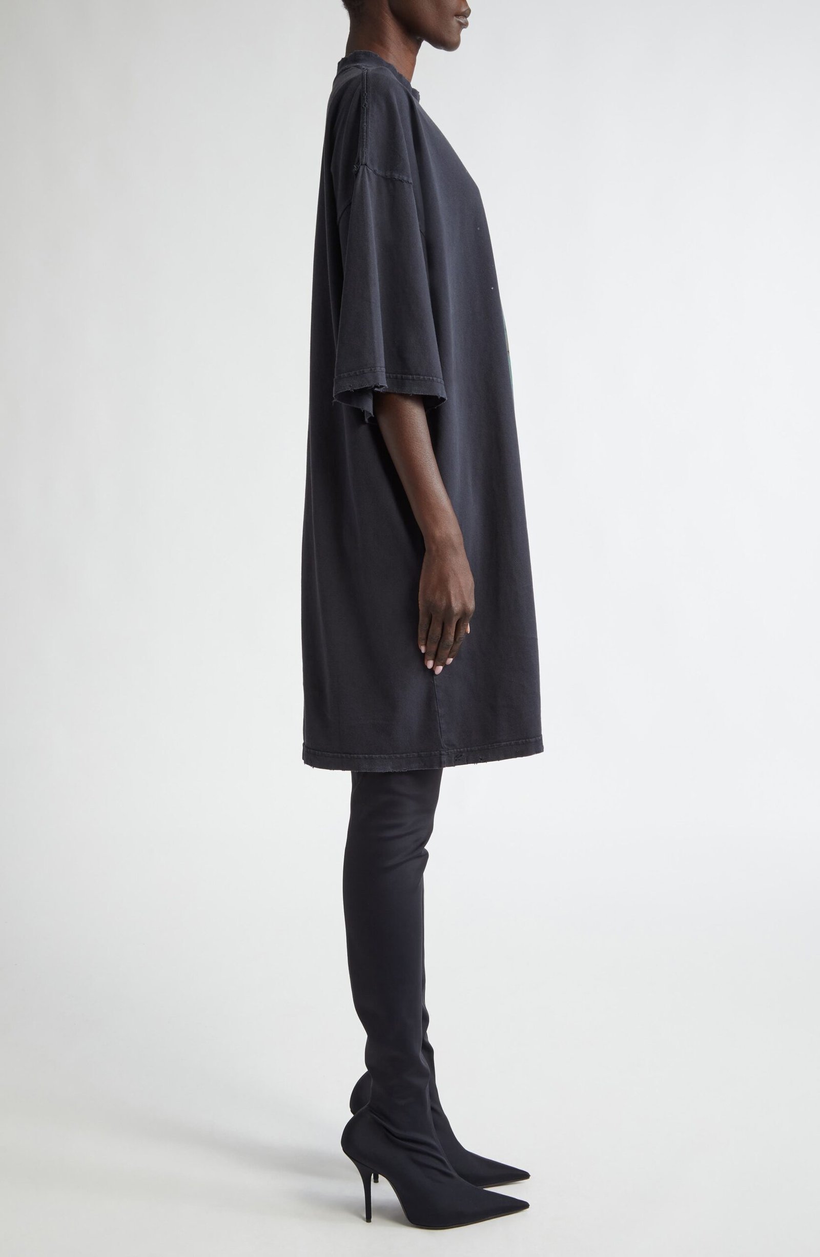 A faded wash, weathered graphic and dashes of destruction lend lots of history to this oversized T-shirt dress cut from soft cotton jersey.
