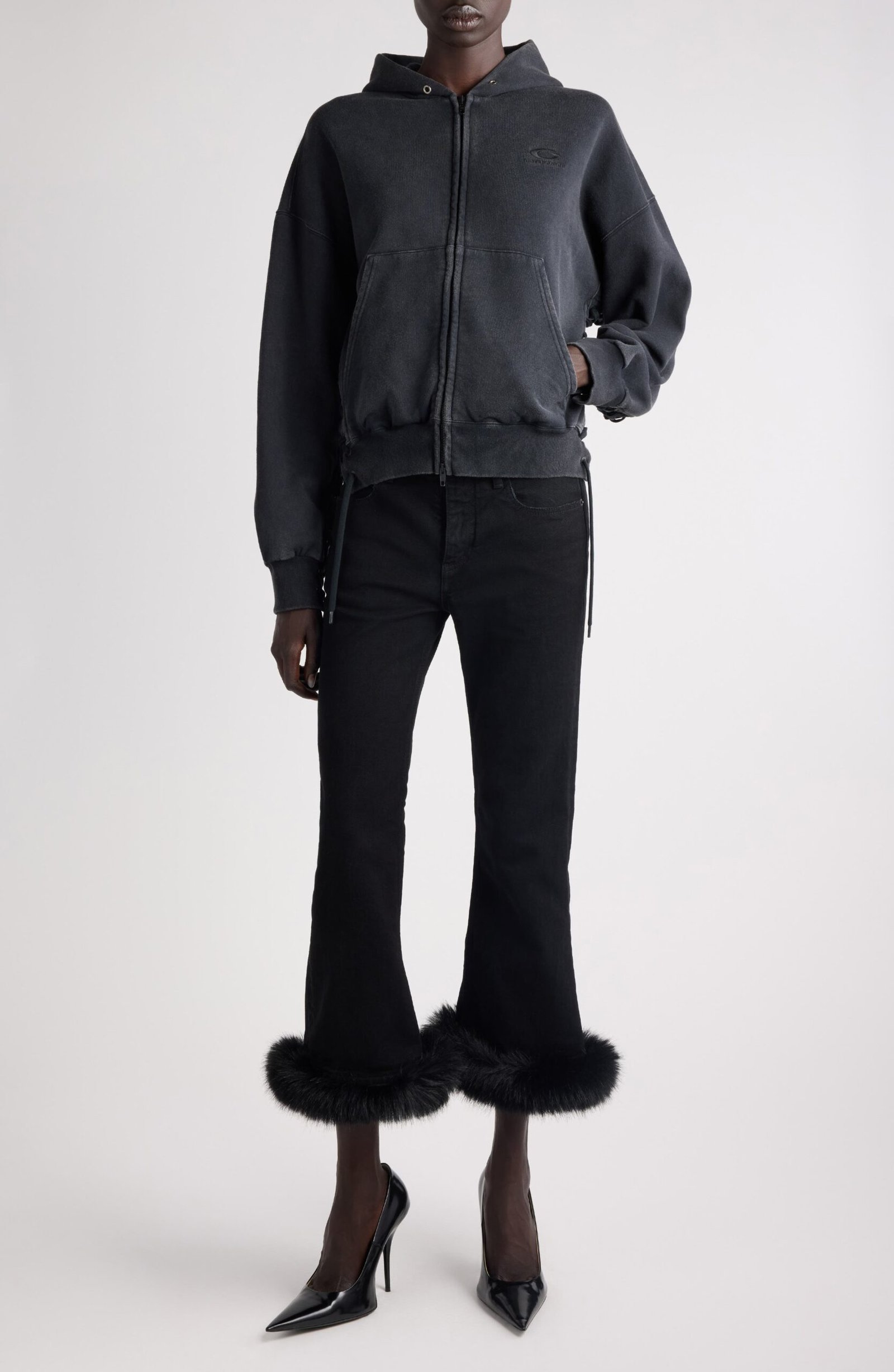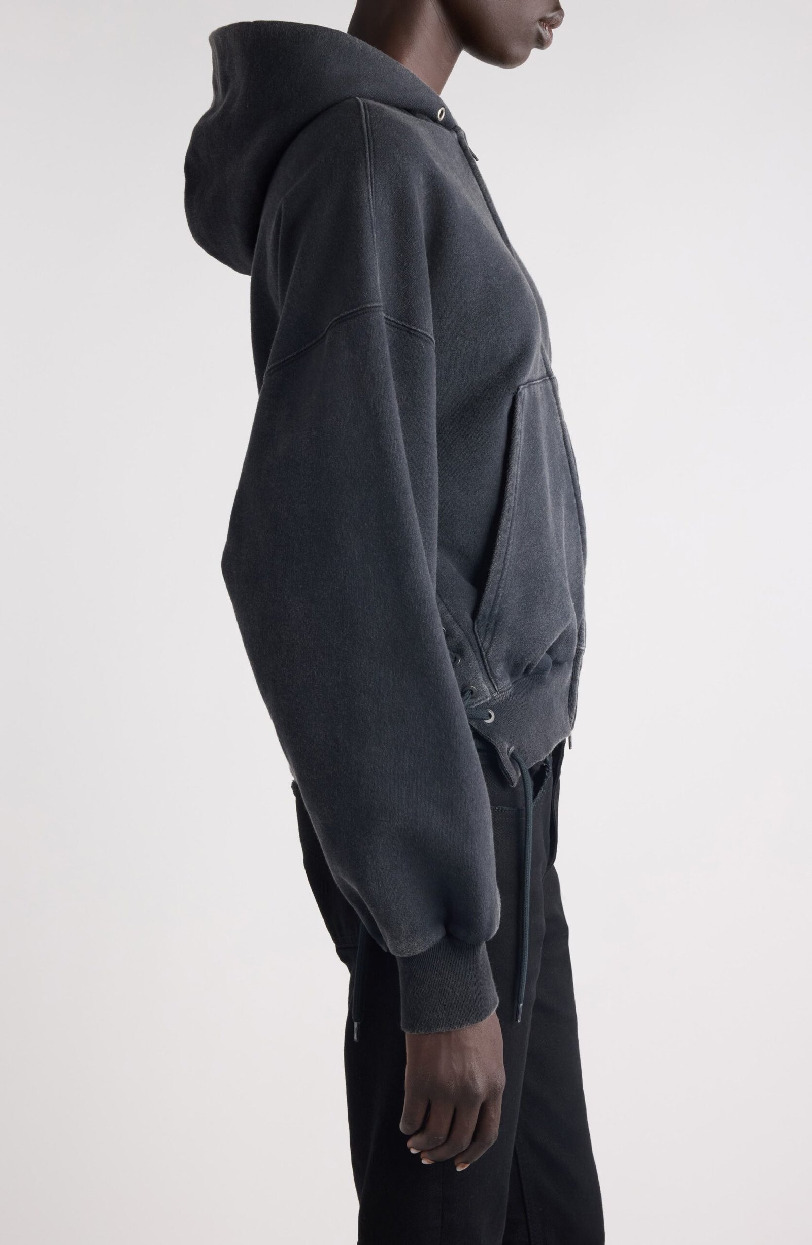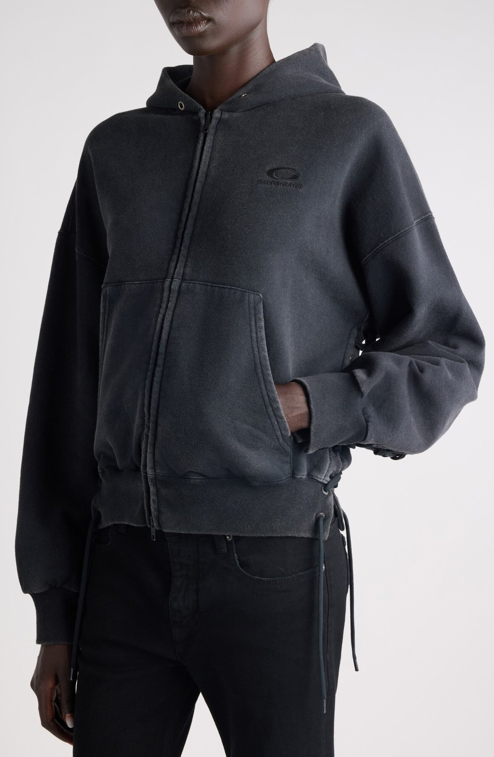 Known for his sartorial send-ups, Demna puts a cheeky twist on sportswear in this shrunken cotton-fleece hoodie with lace-up accents borrowed from lingerie styles. A sporty logo in