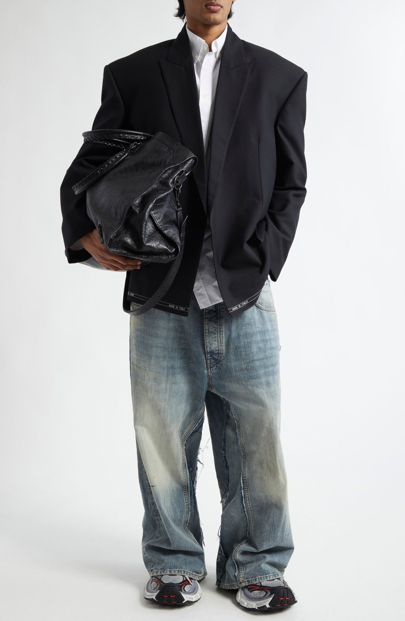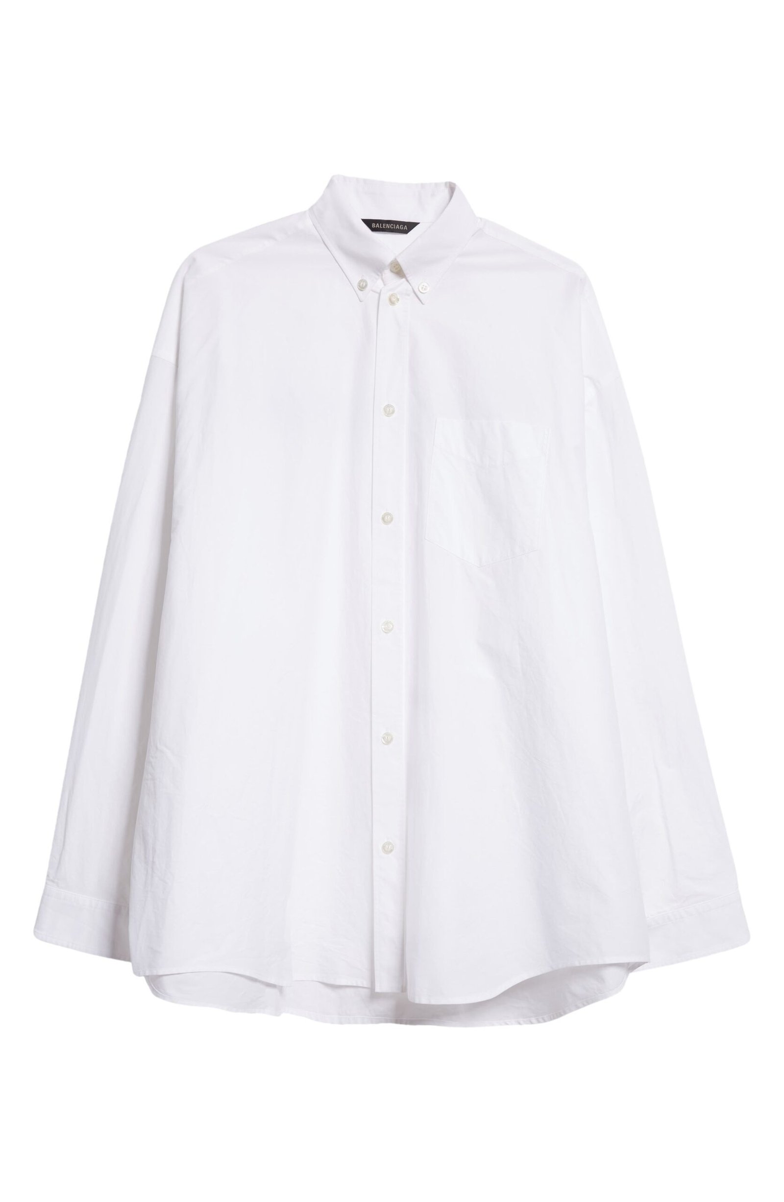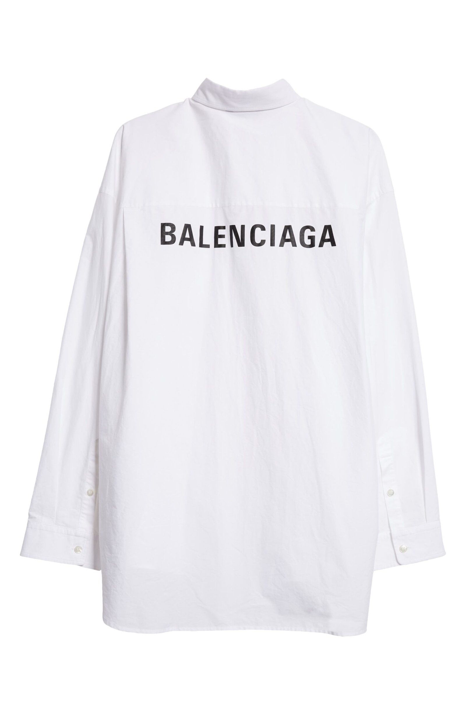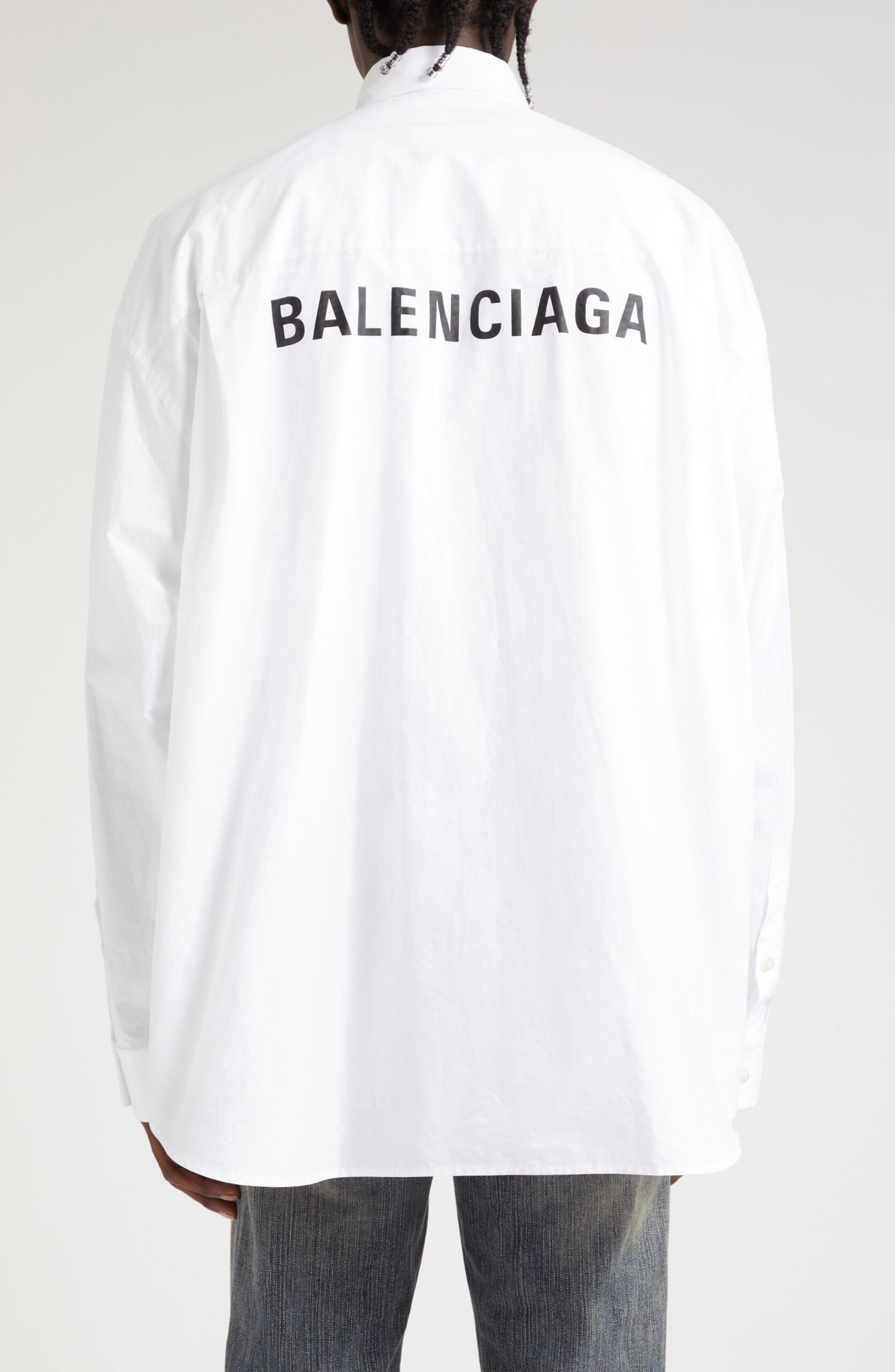 Balenciaga branding spans shoulder to shoulder beneath the back yoke of this button-down shirt cut in an oversized silhouette that befits the logo’s length.