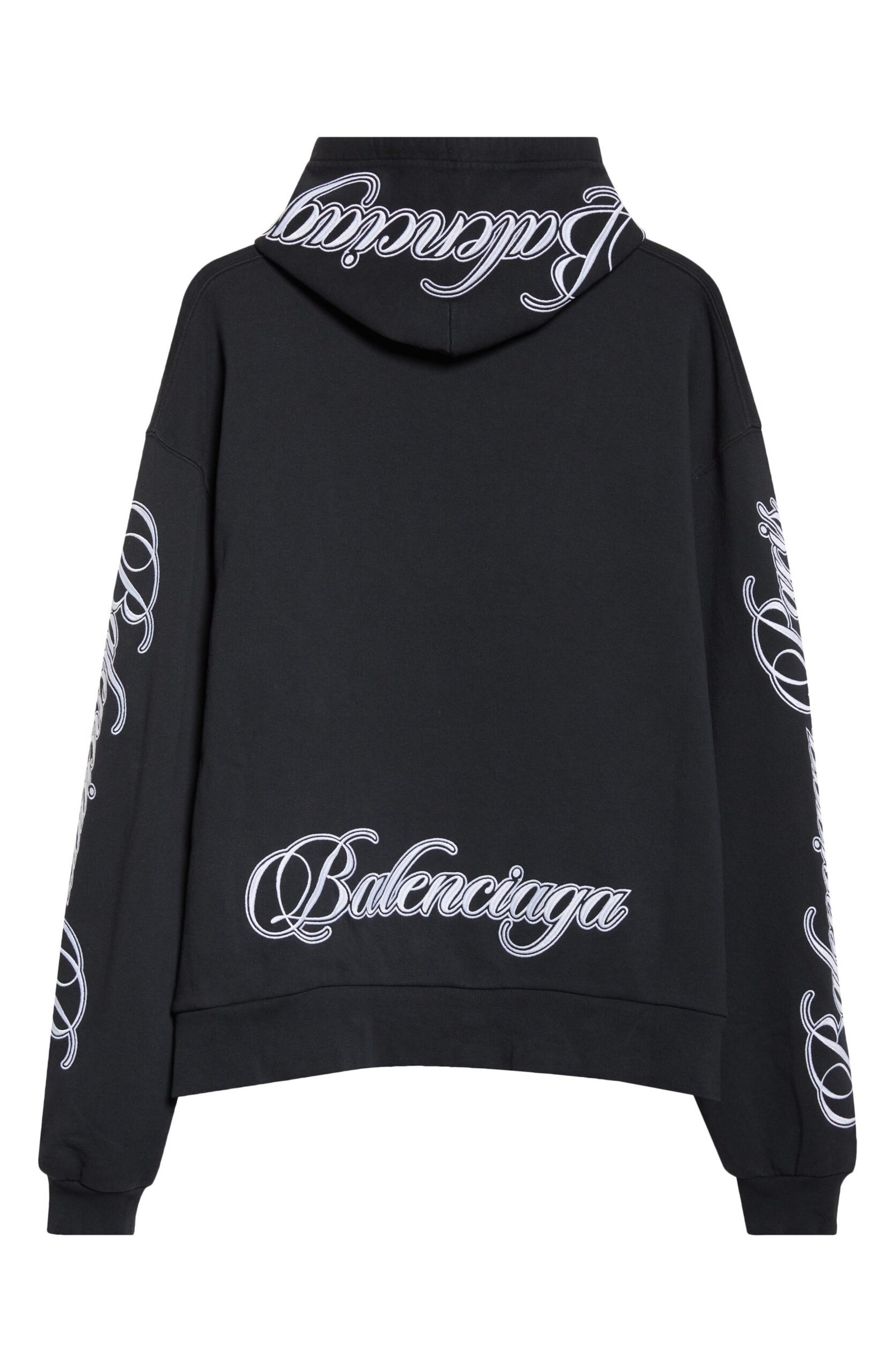 Cursive logo embroidery scrolls across the sleeves and back of an oversized hoodie cut from pure cotton.