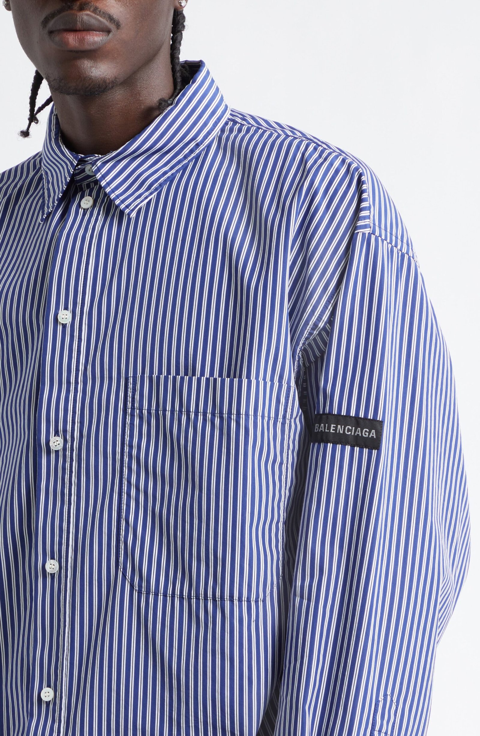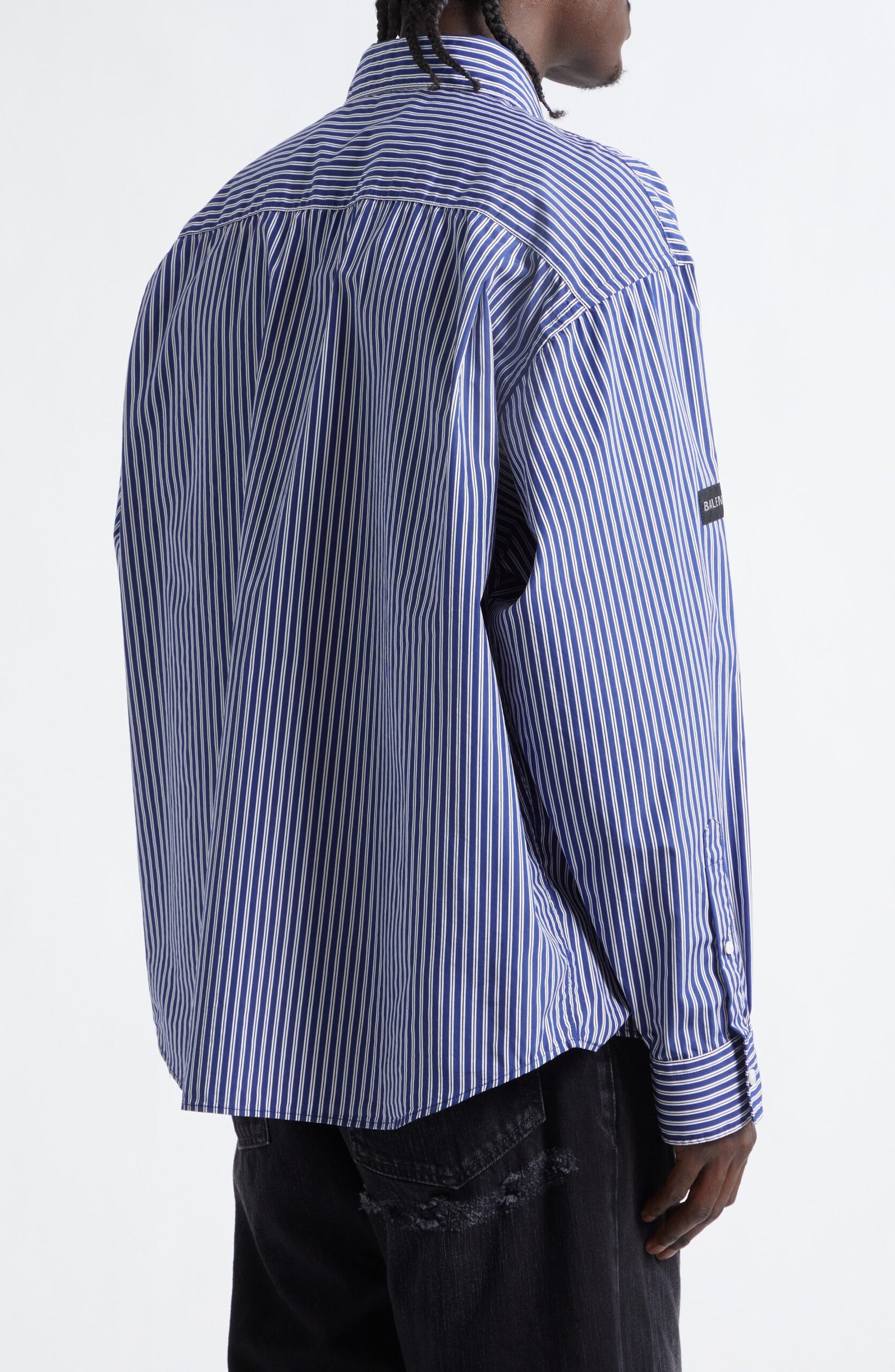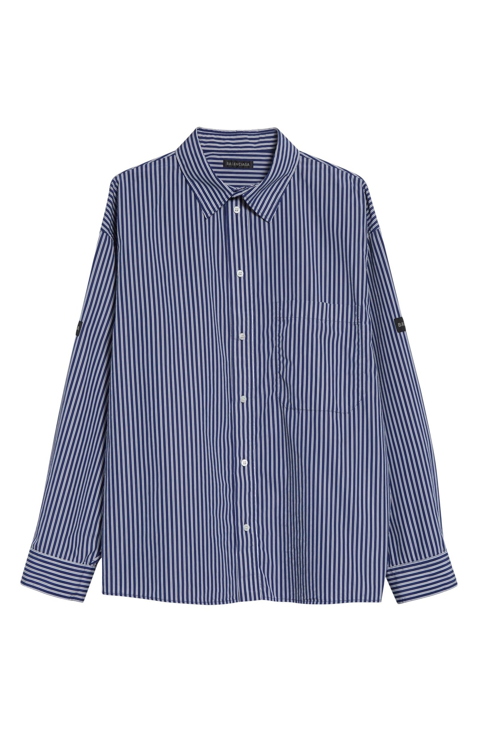 This crisply striped button-up shirt is cut in an oversized fit, branded with Balenciaga logo patches on both sleeves and fastened with pearly engraved logo buttons.