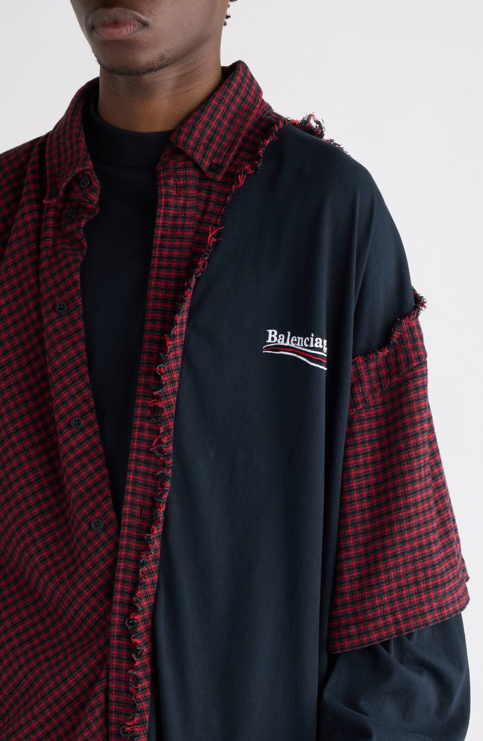 Denma’s subversive vision comes to life in a spliced top that reads layered at a glance yet lands as one precise piece. Soft jersey meets plaid flannel so the body carries two text