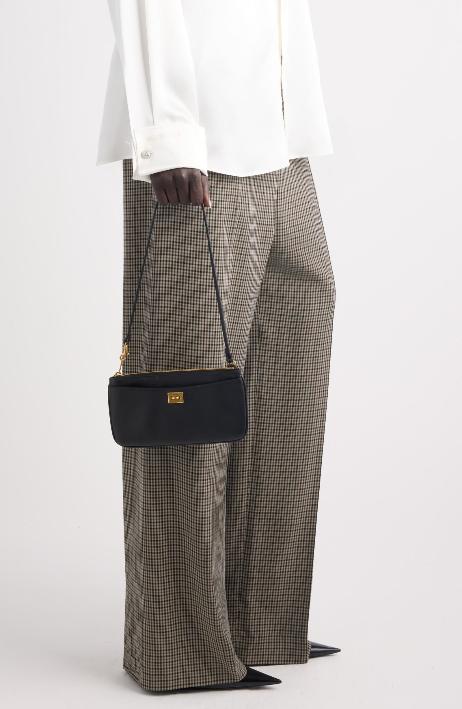 The epitome of understated luxury, this slender shoulder bag crafted of supple calfskin leather features a compact silhouette and signature hardware.