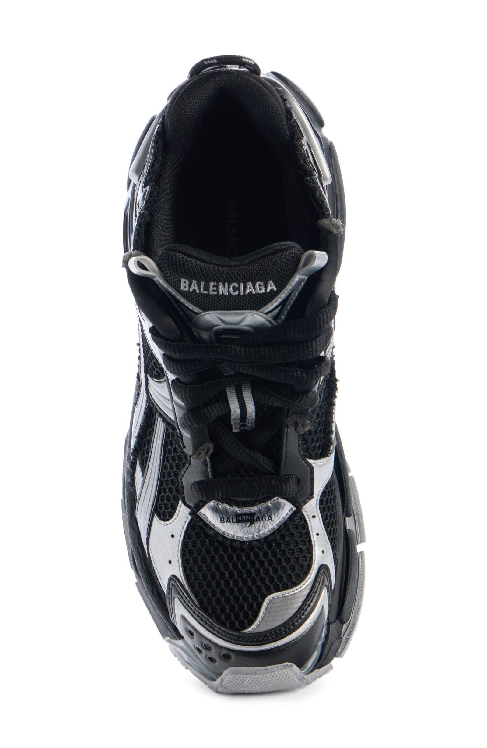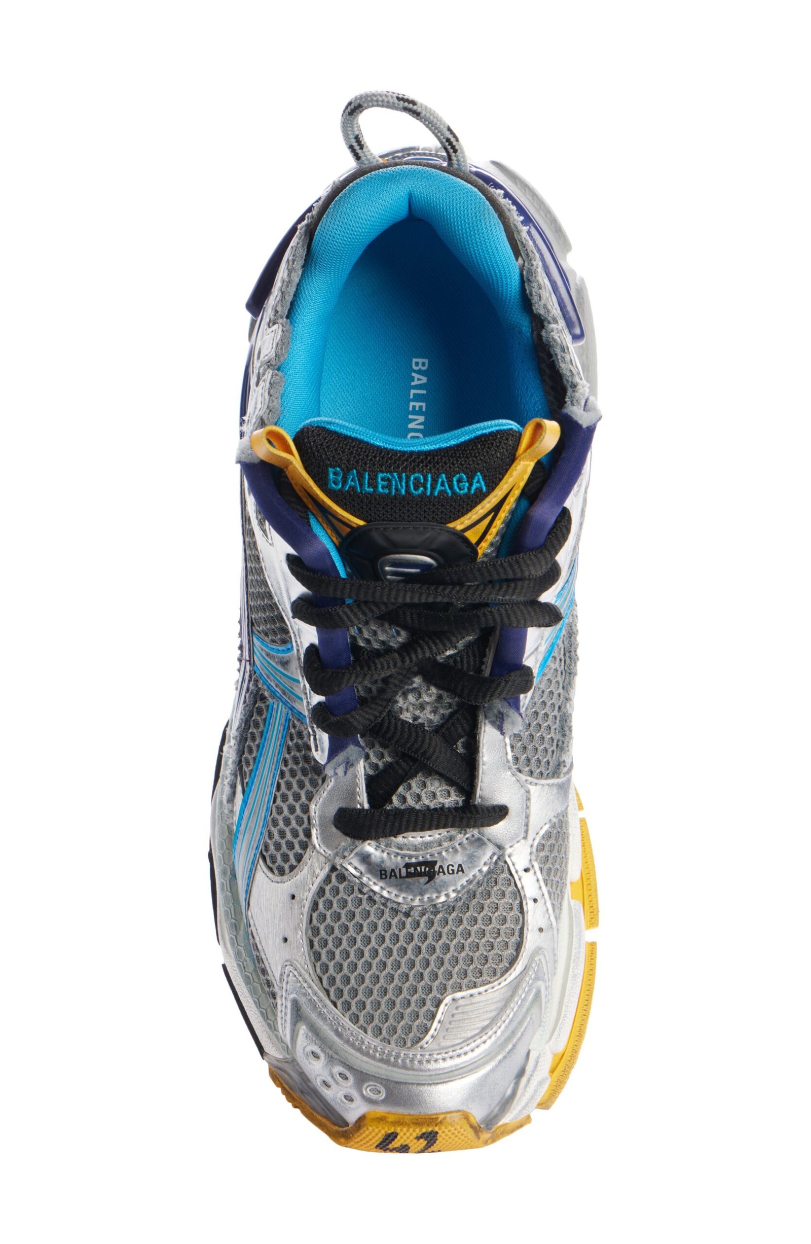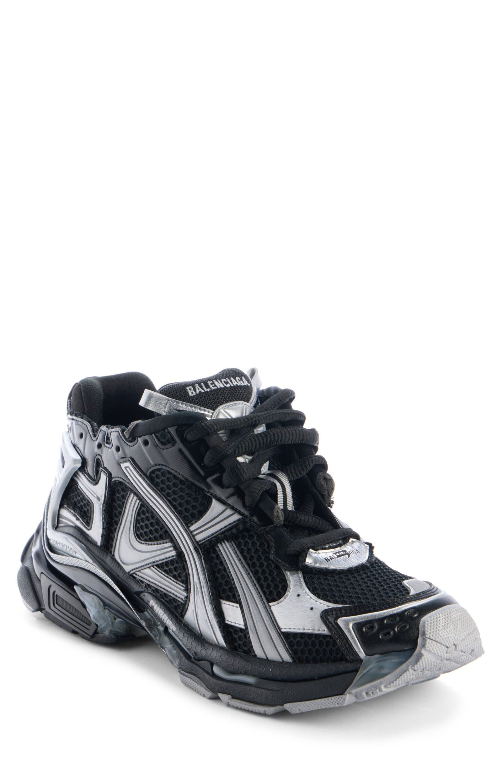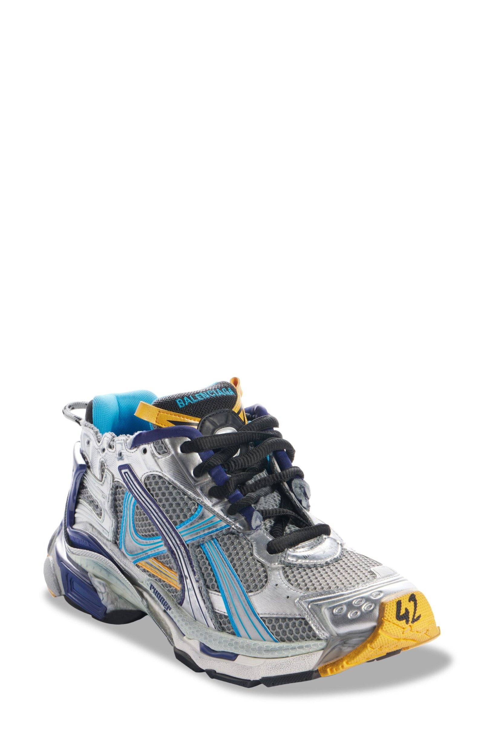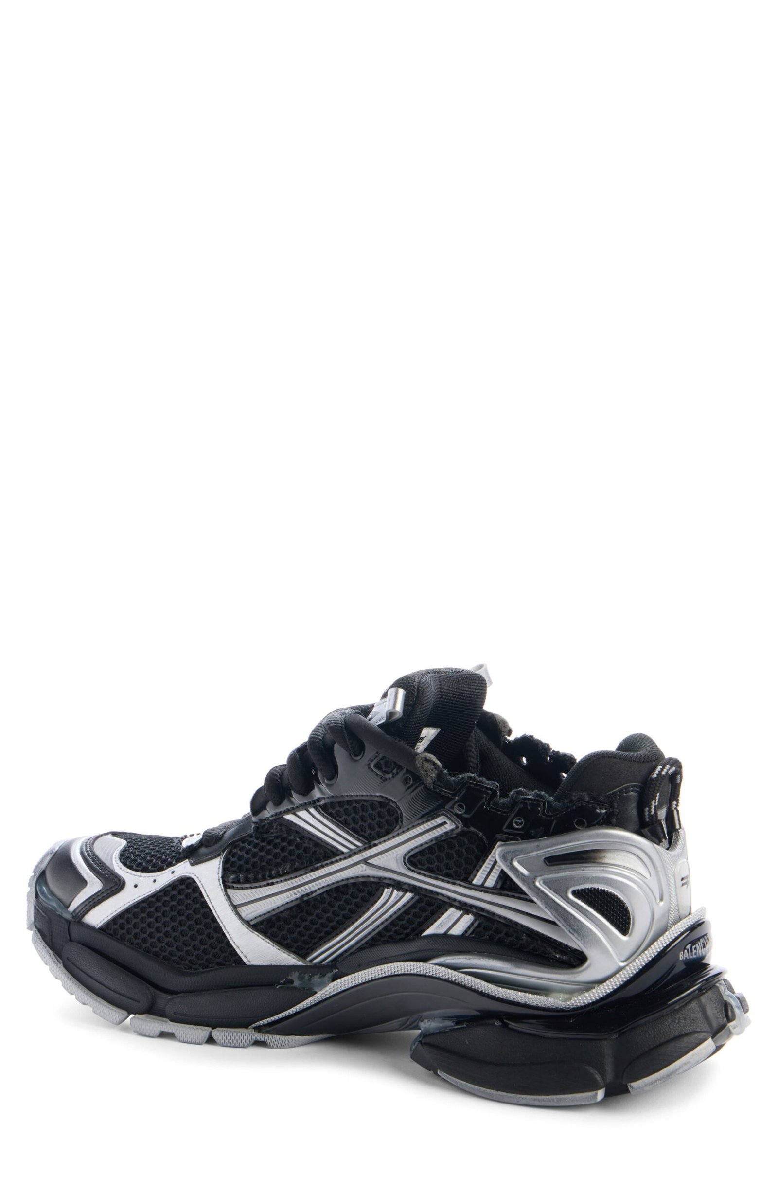 Inspired by ’90s and ’00s running shoes, this overlaid mesh sneaker is given a deconstructed look with rough stitching, seeping glue and a choppy topline. To add to the DIY vibe, the size is scrawled with a marker-like effect at the toe.