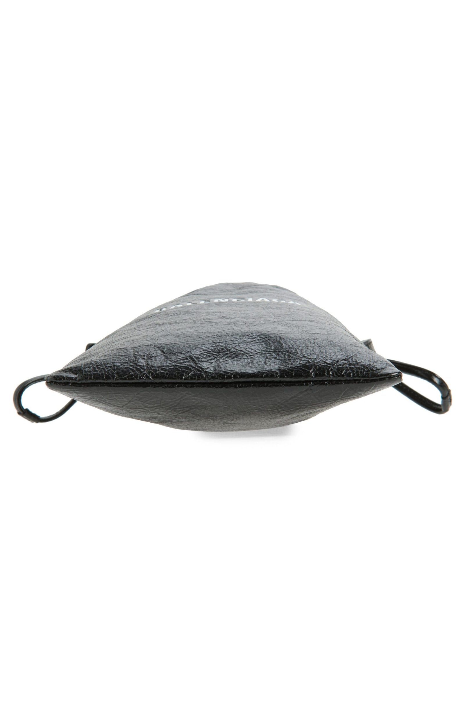 This textured leather phone holder is inspired by dustbags in shape and cinched with a drawstring closure at top. It’s finished with antiqued silvertone hardware and fitted with an