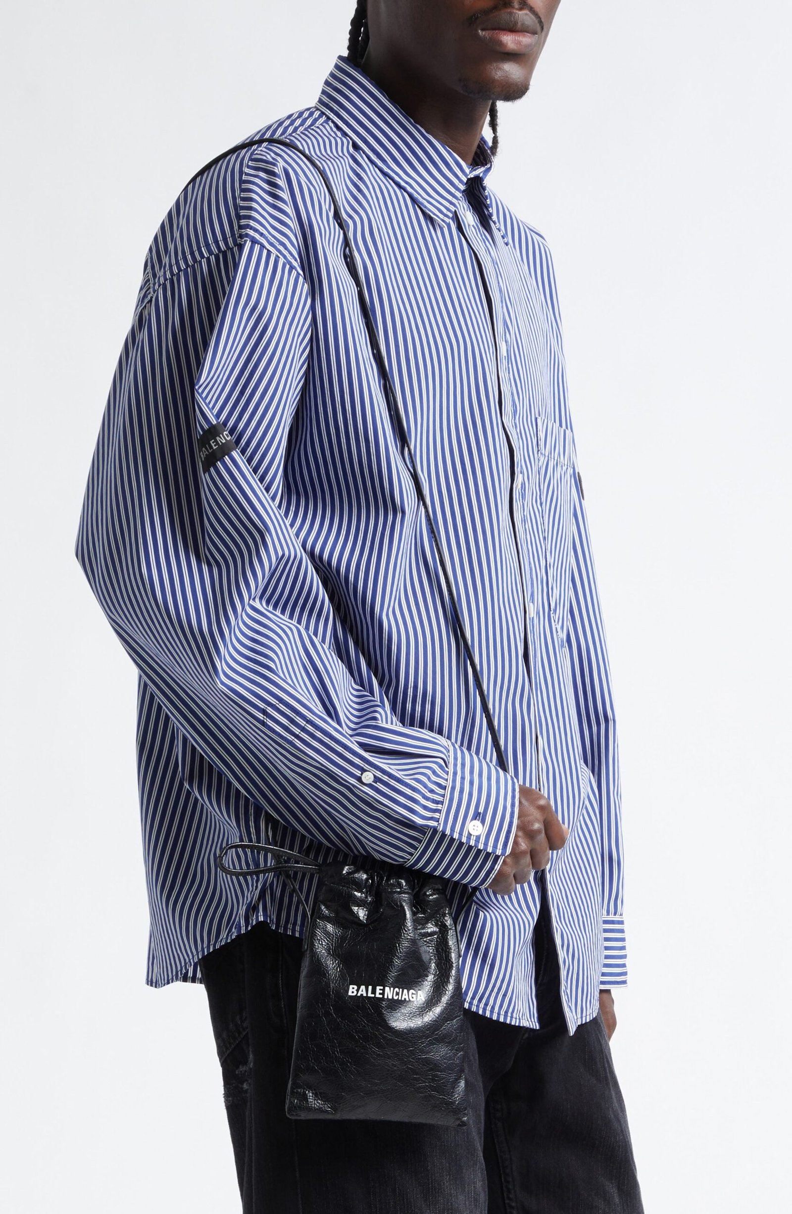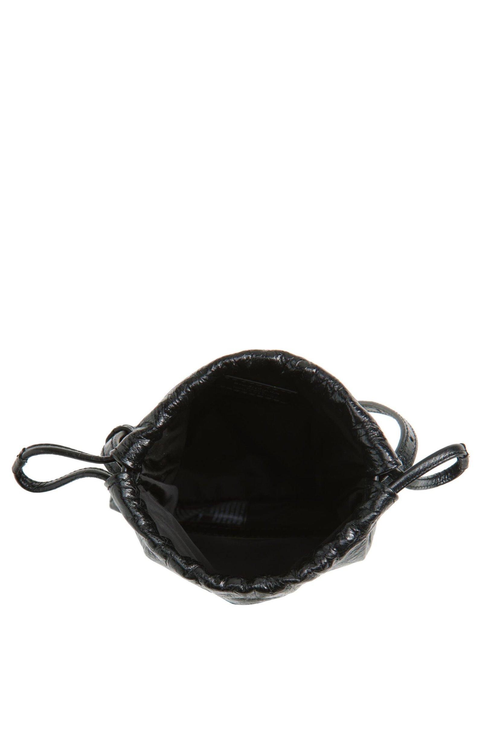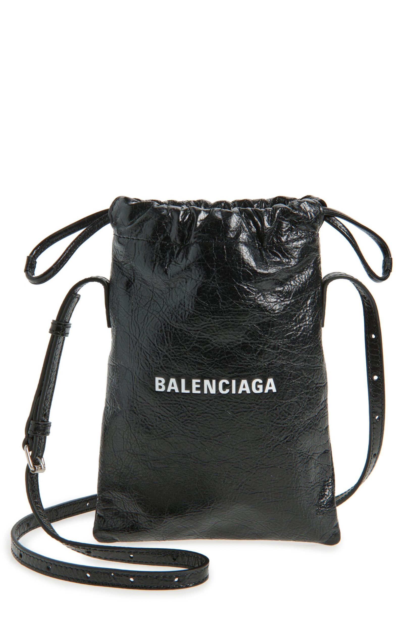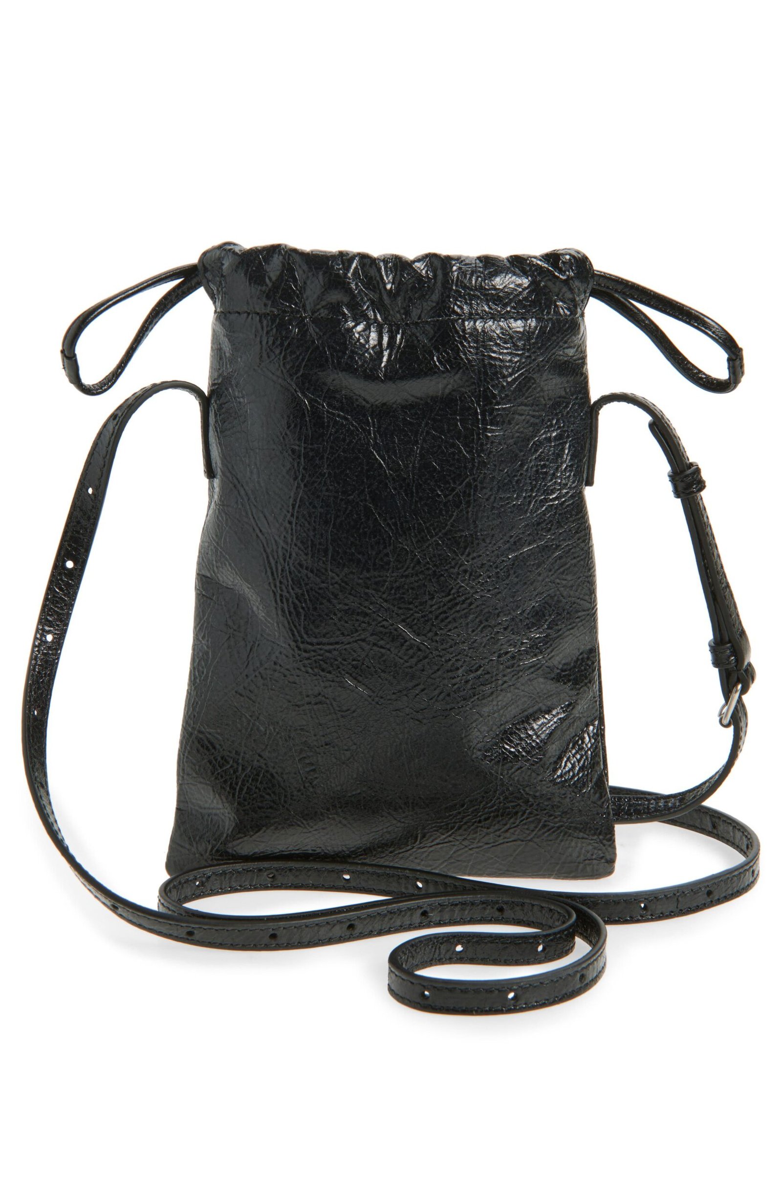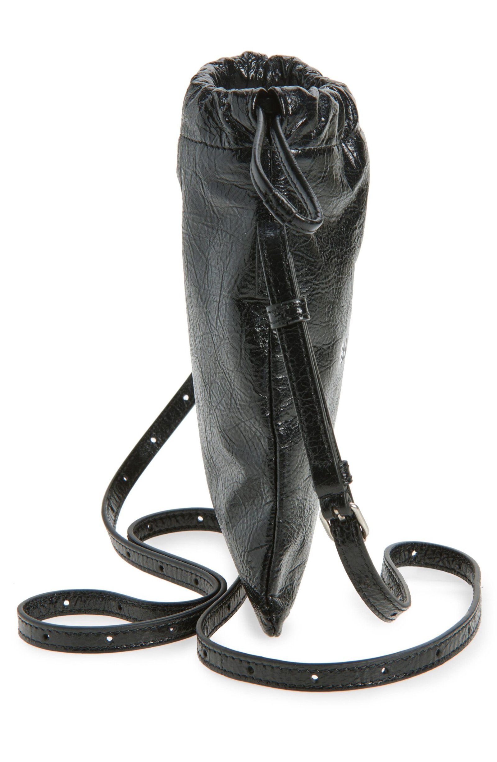 This textured leather phone holder is inspired by dustbags in shape and cinched with a drawstring closure at top. It’s finished with antiqued silvertone hardware and fitted with an adjustable crossbody strap for versatile carry.