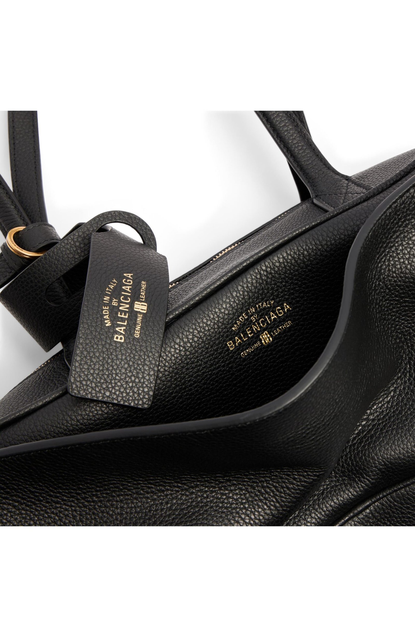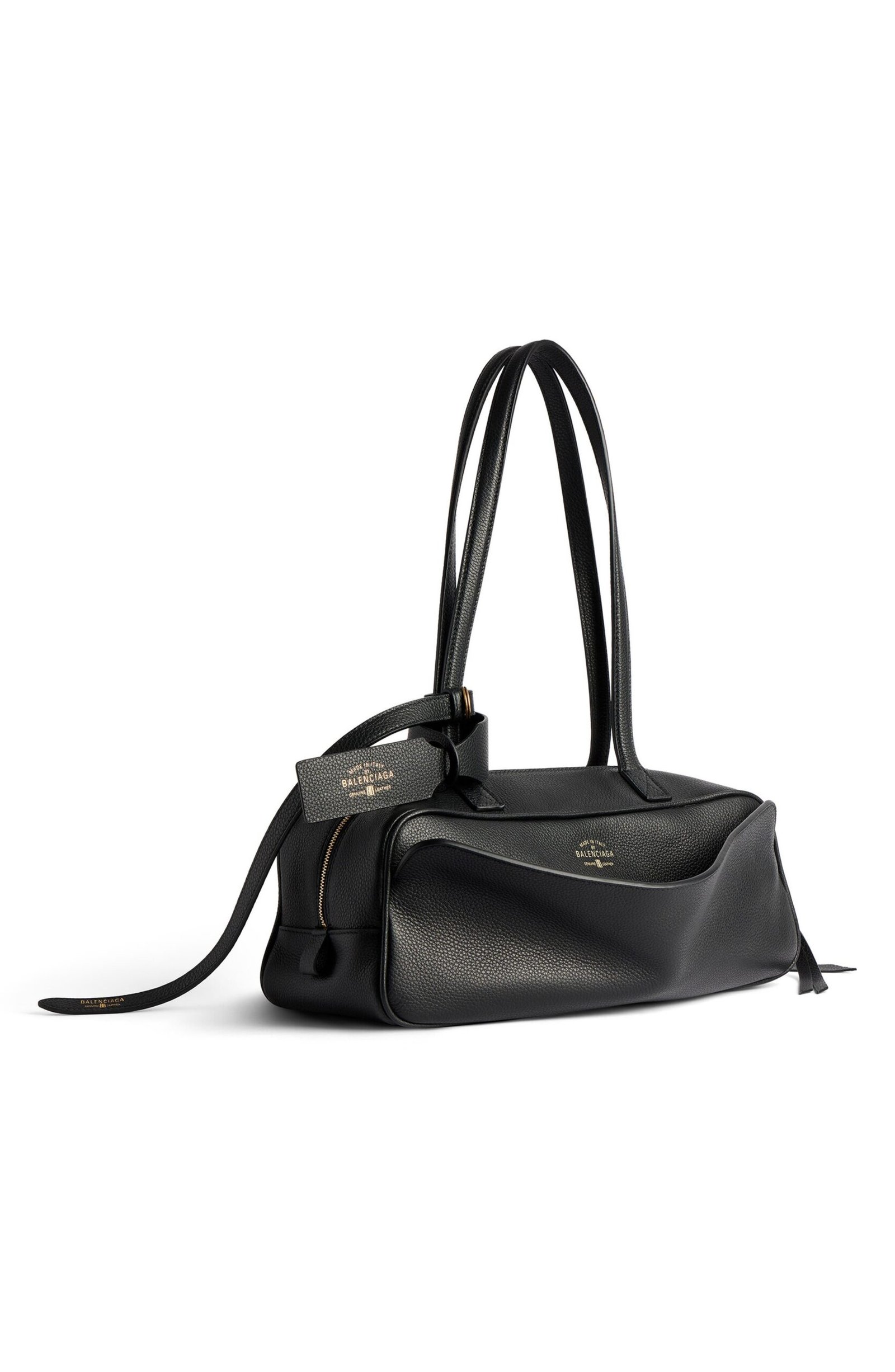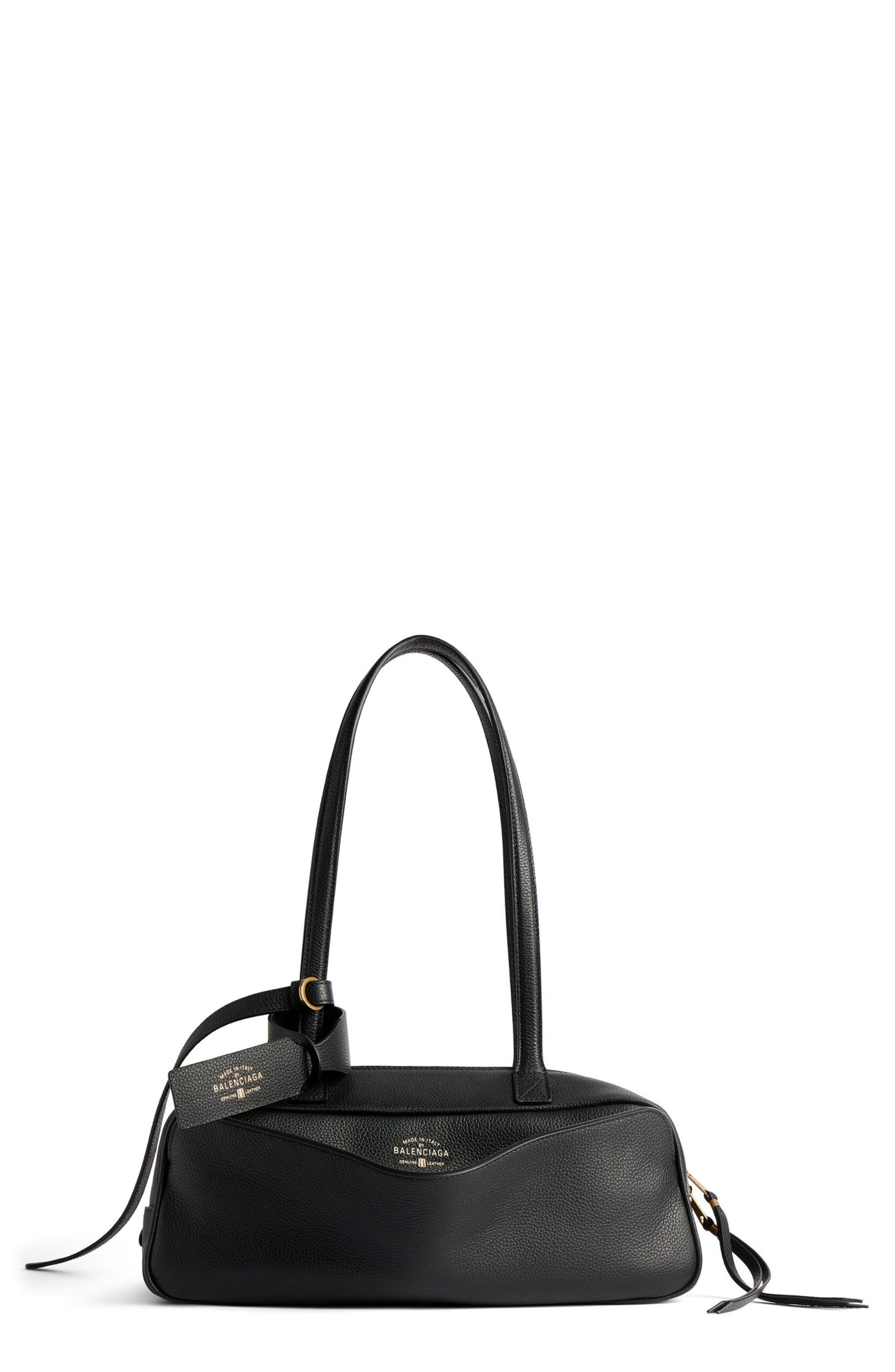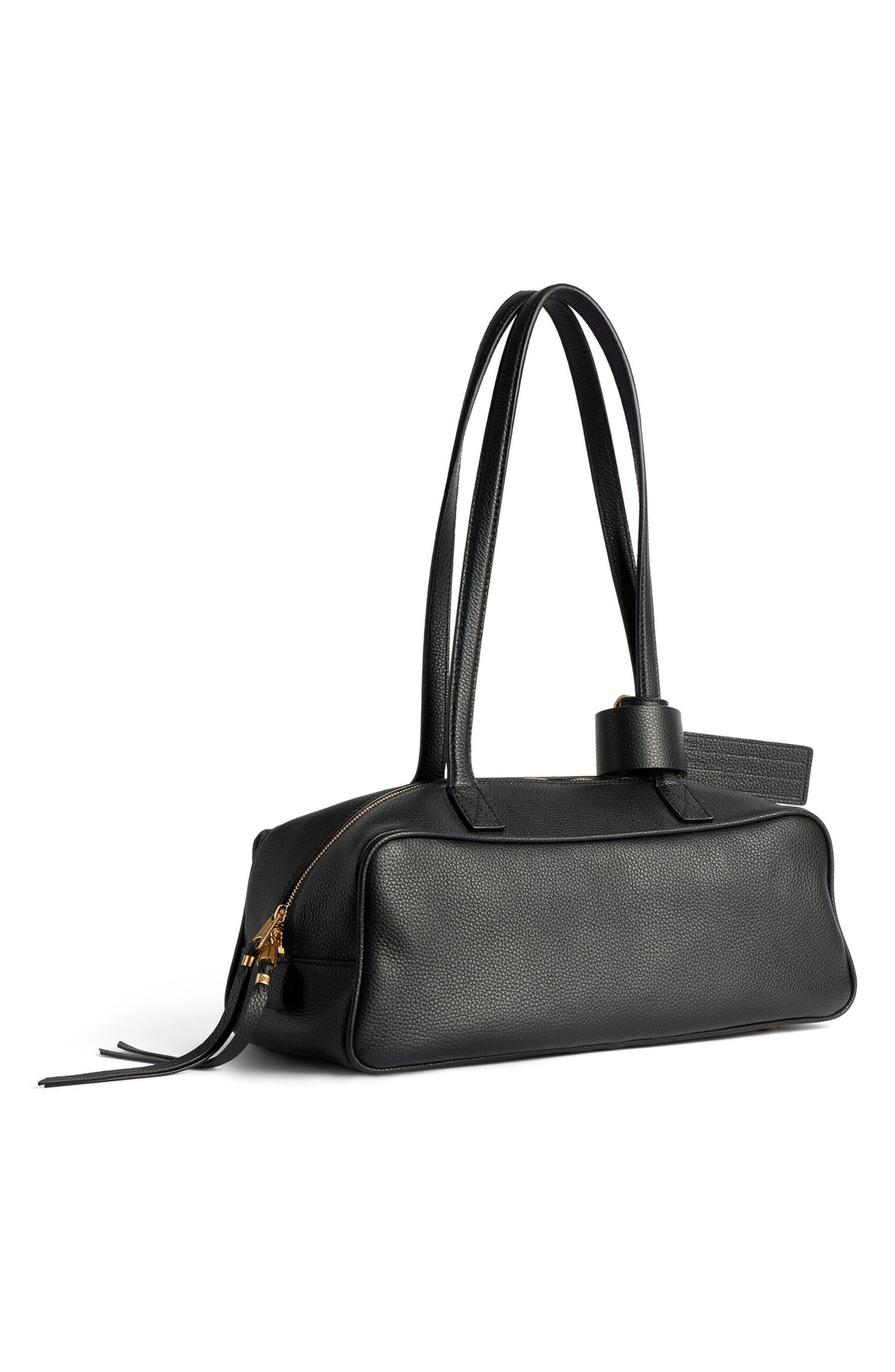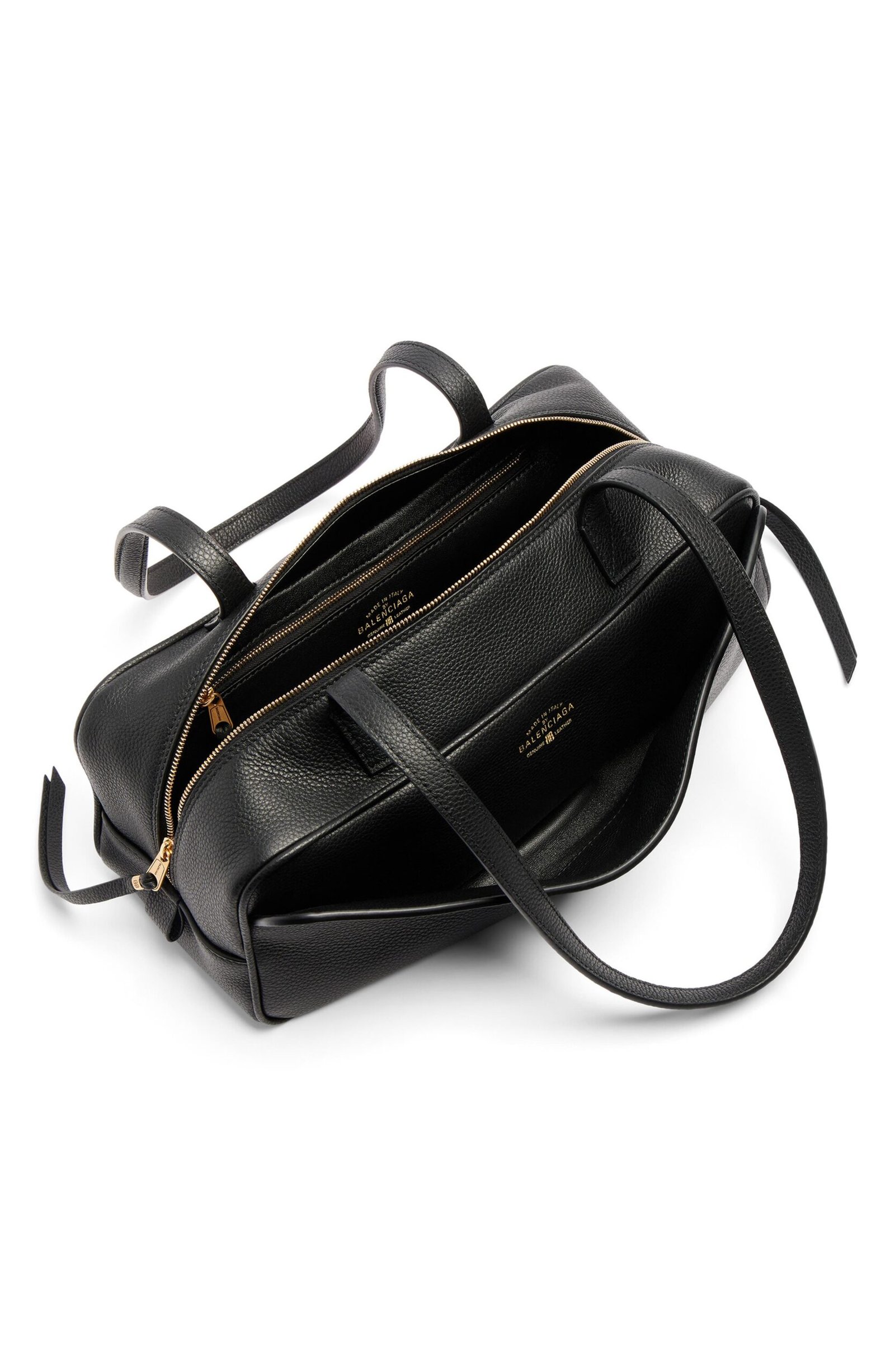 A slouchy silhouette inspired by vintage bowling bags defines this calfskin-leather satchel topped with handles short enough to carry in hand but long enough to sling over your sho