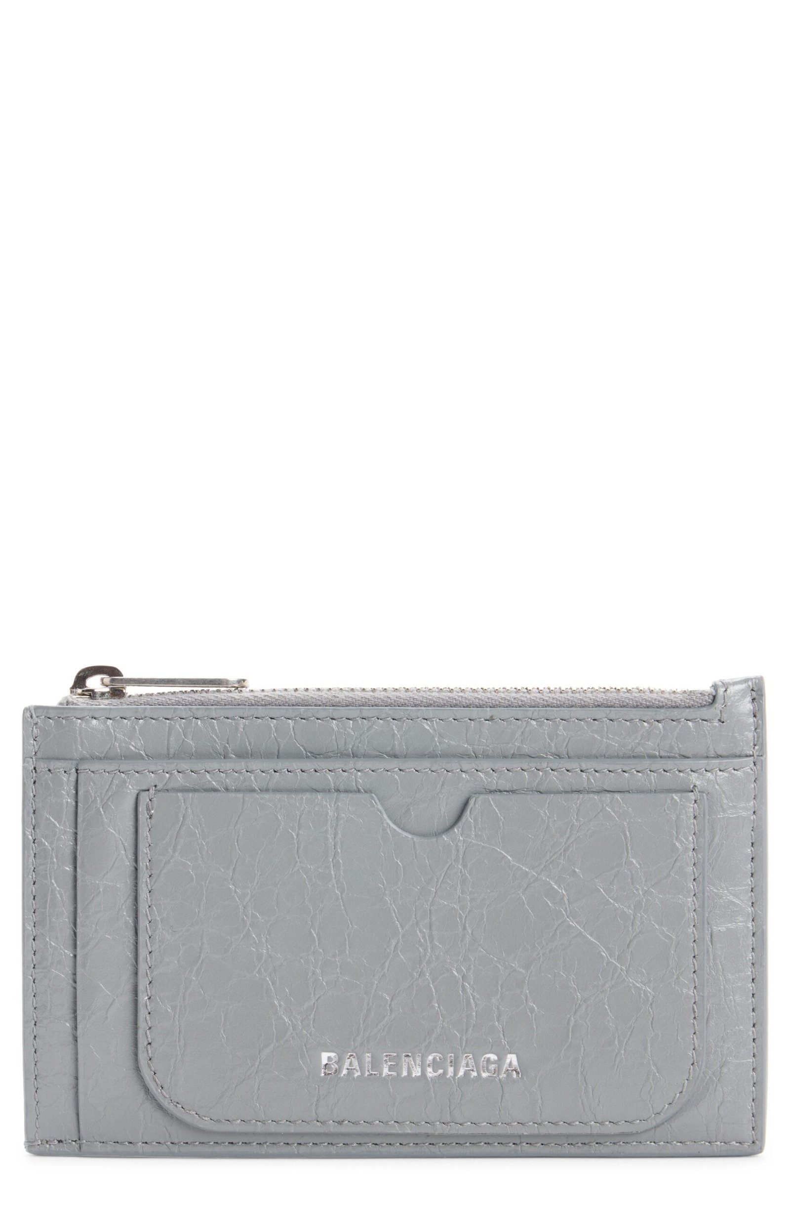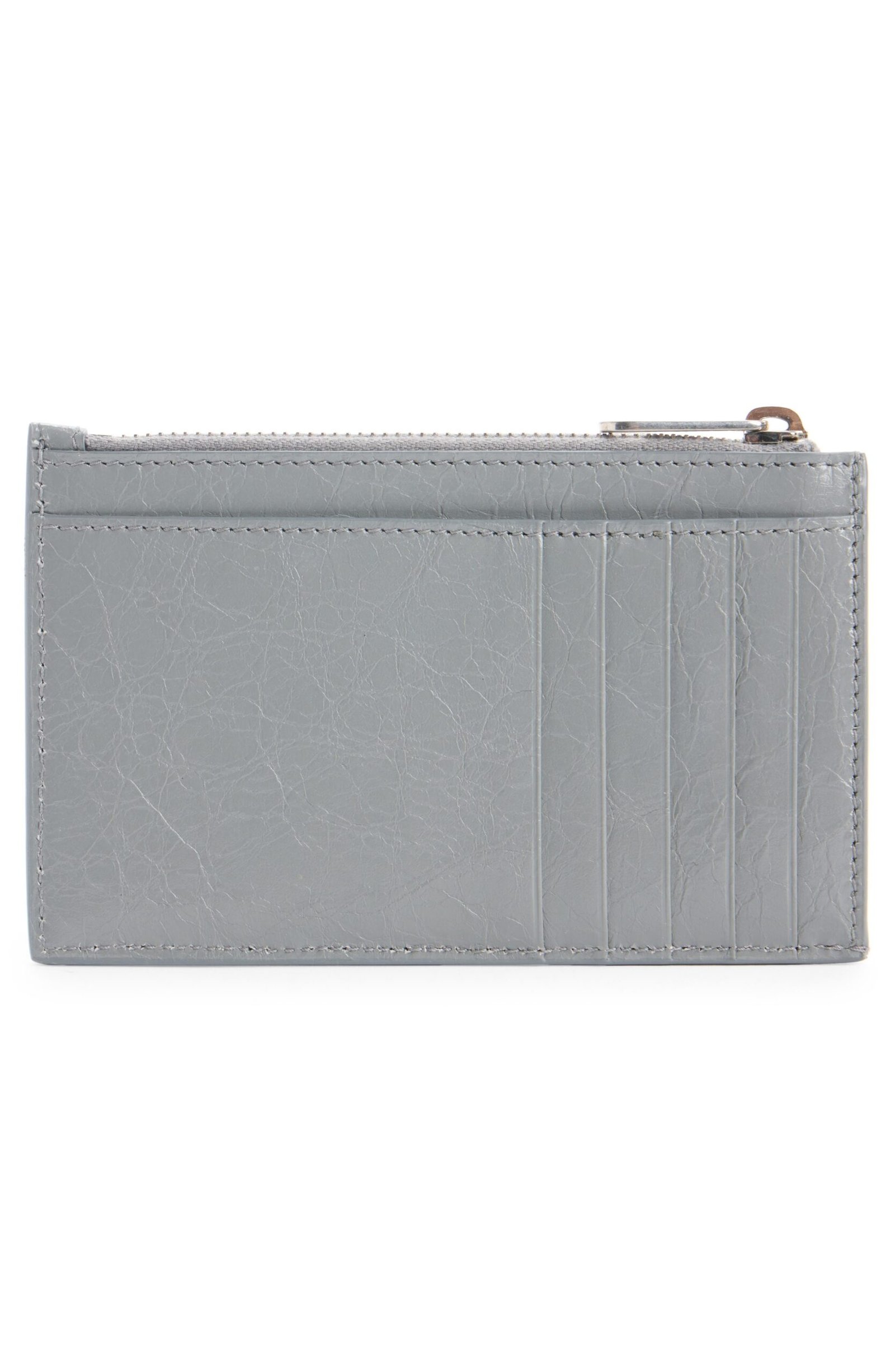 A glinting silverfoil logo stamps the softly grained lambskin of a zip card case equipped with plenty of pockets and slots.