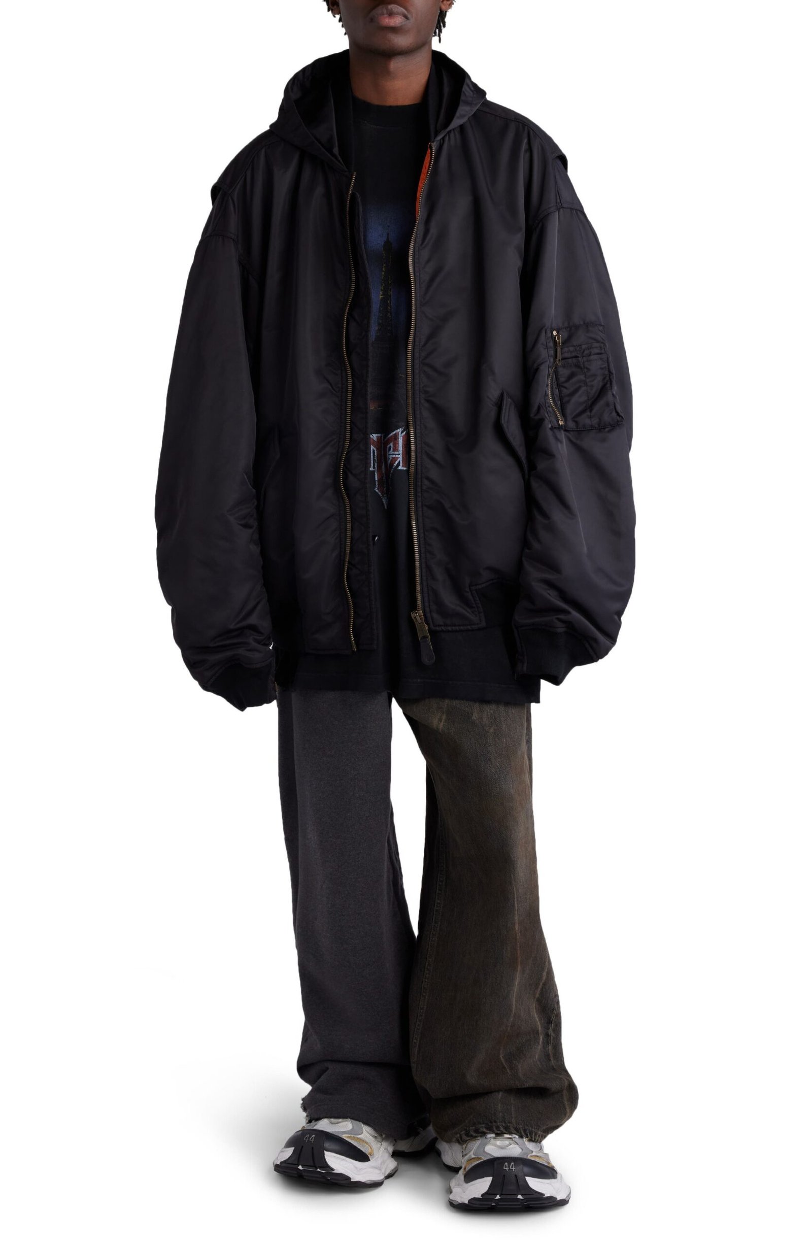 Balenciaga’s streetwear-ready aesthetic is on display with this oversized, hooded bomber jacket branded with taped-up logo lettering for a DIY vibe.
