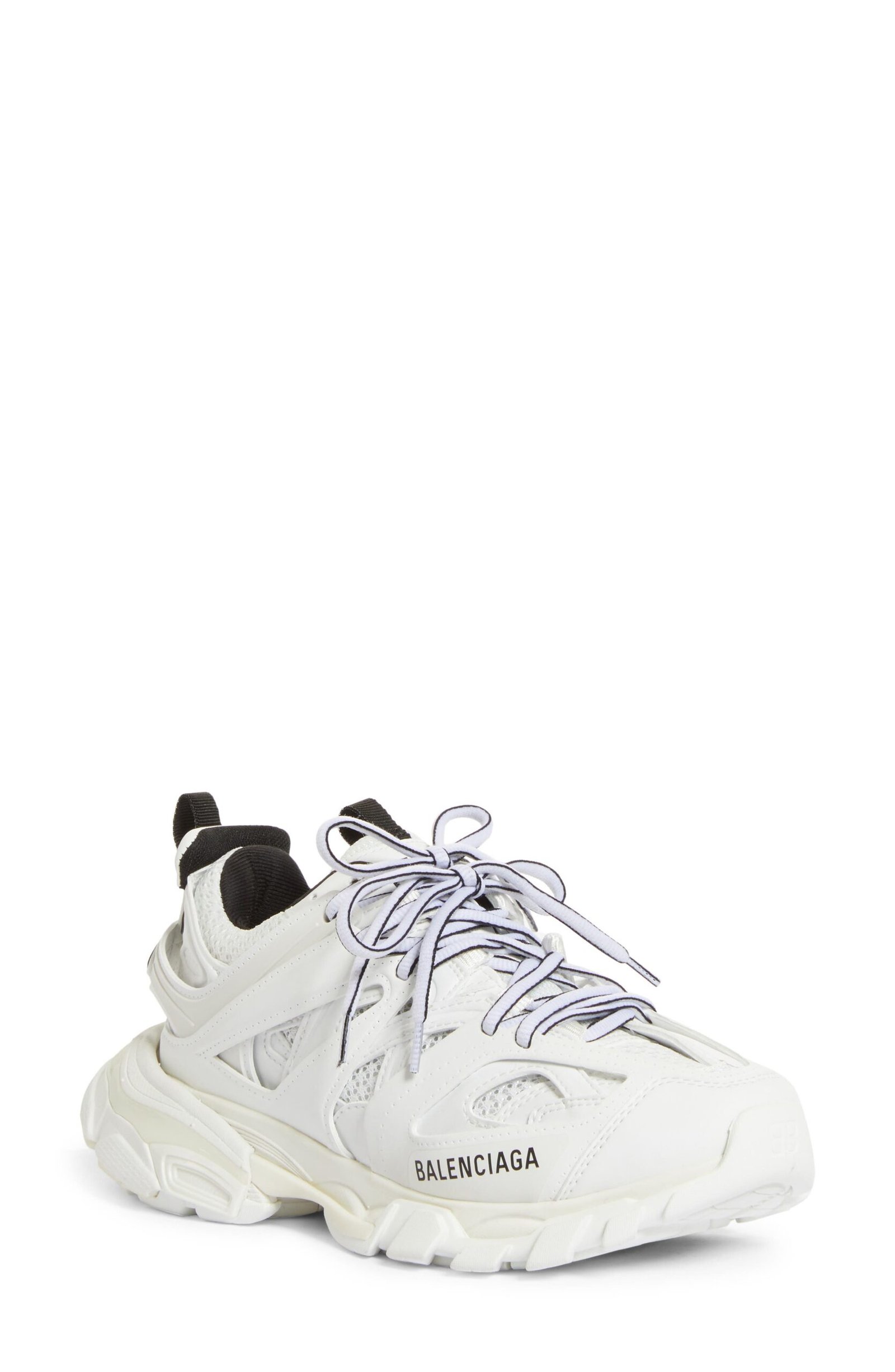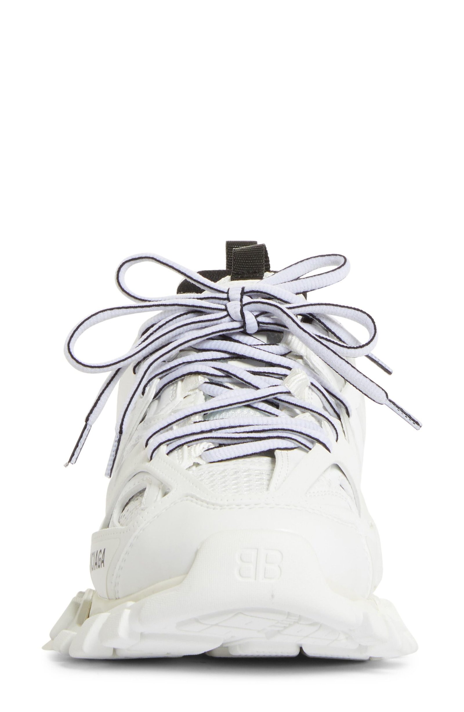 A multilayer lacing cage and contrast accents blend high-tech design with a high-fashion look on a lace-up sneaker set on a chunky, flared heel.