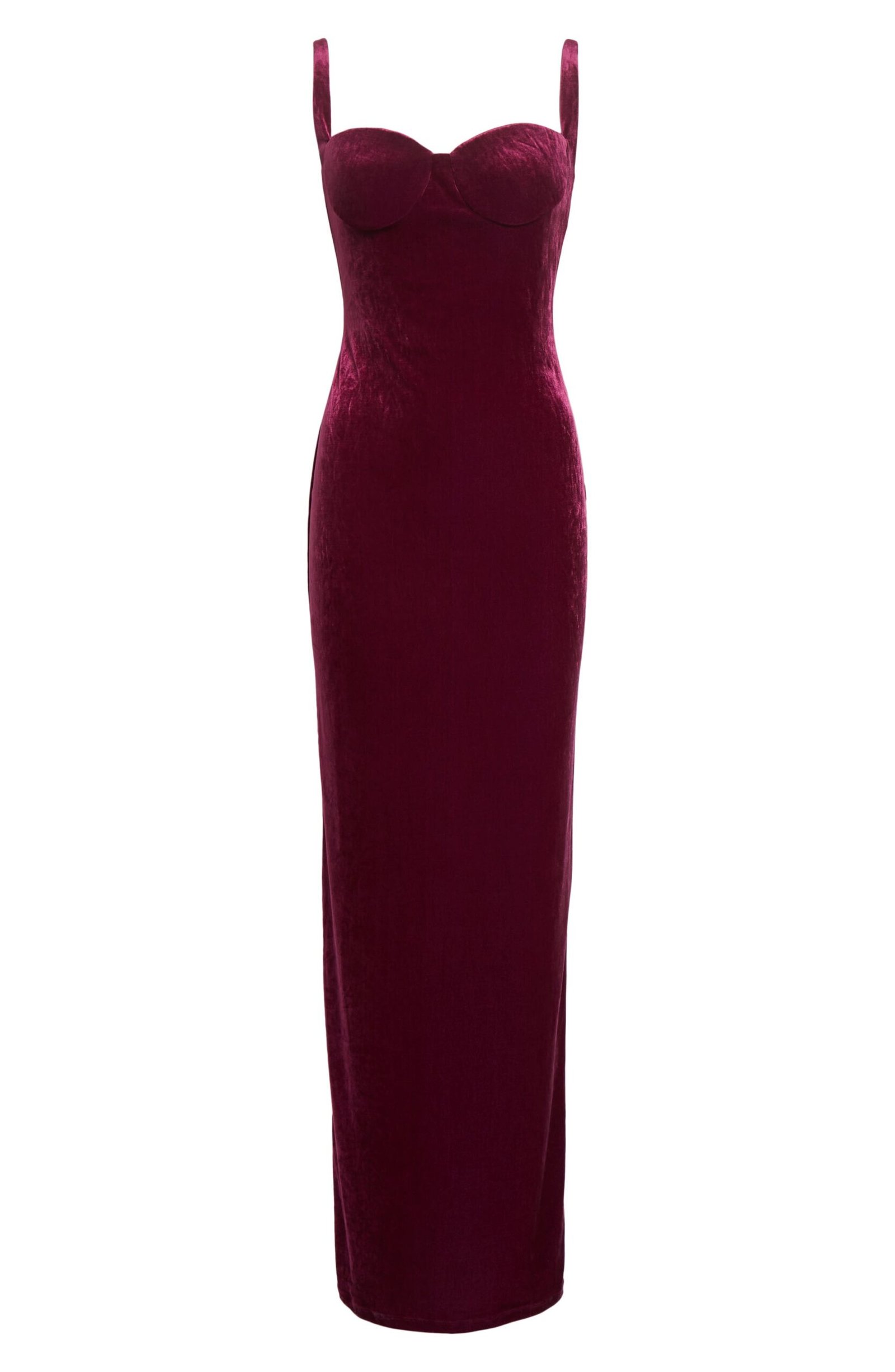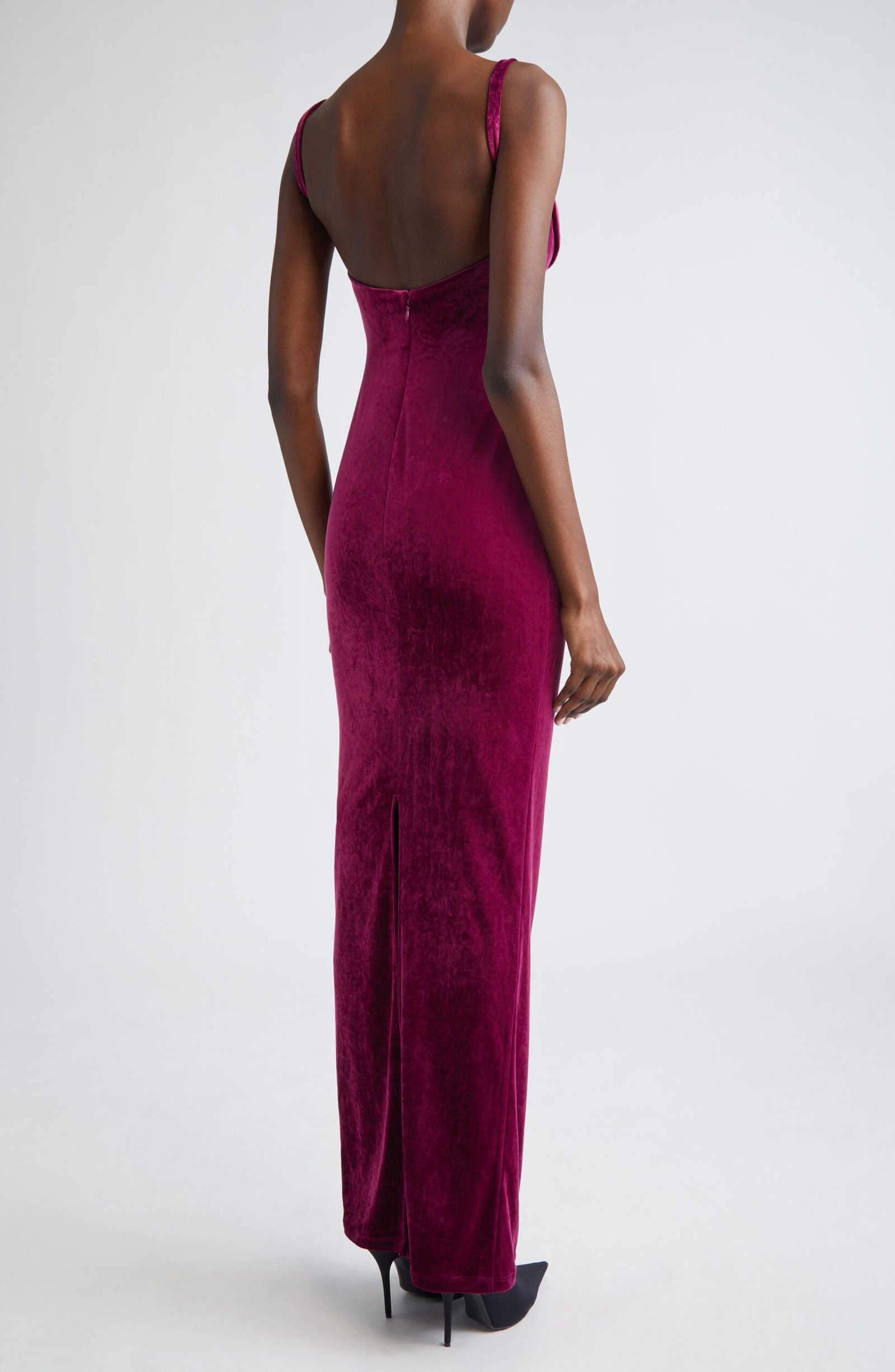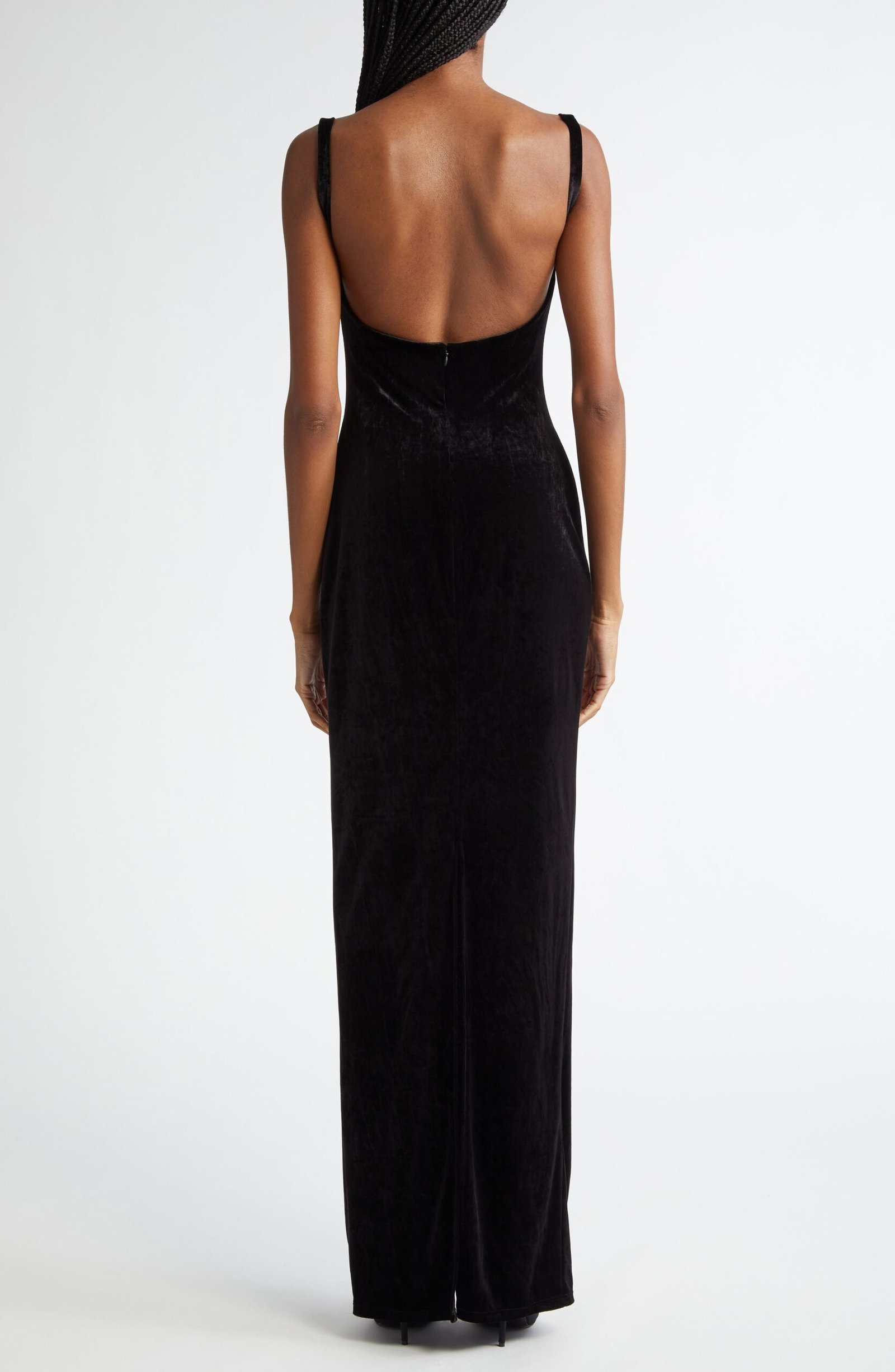 Make an entrance in this svelte velvet gown in a figure-hugging silhouette with an open back that ensures an equally memorable exit.
