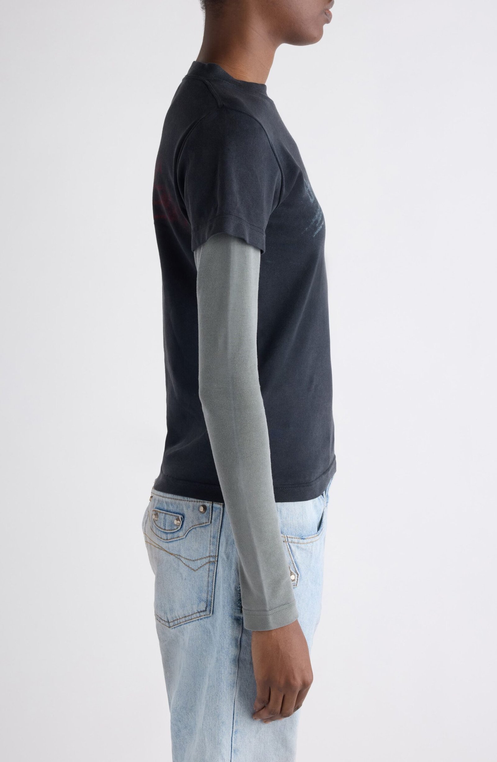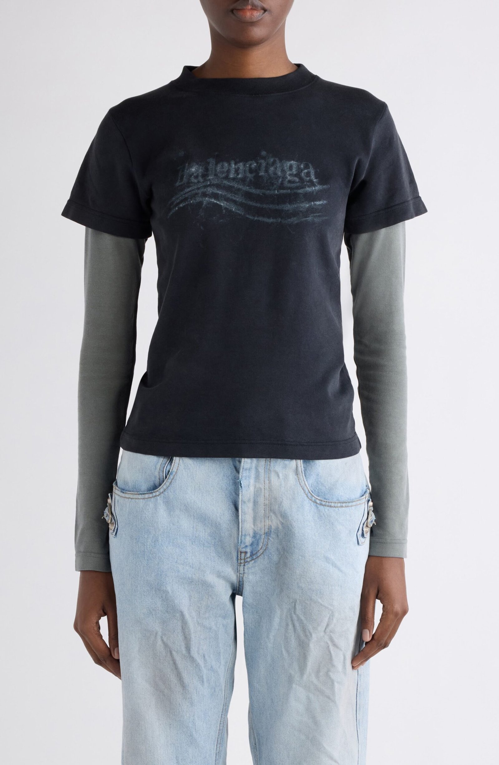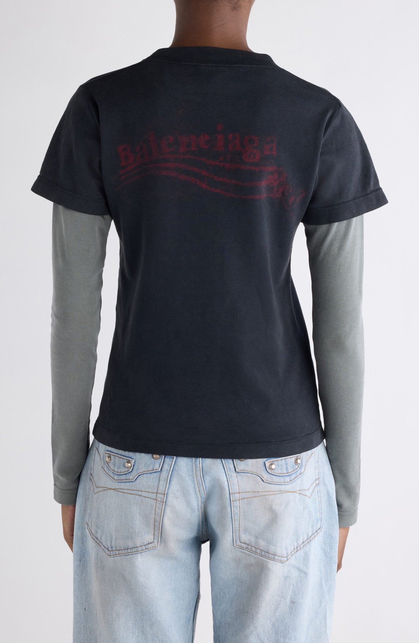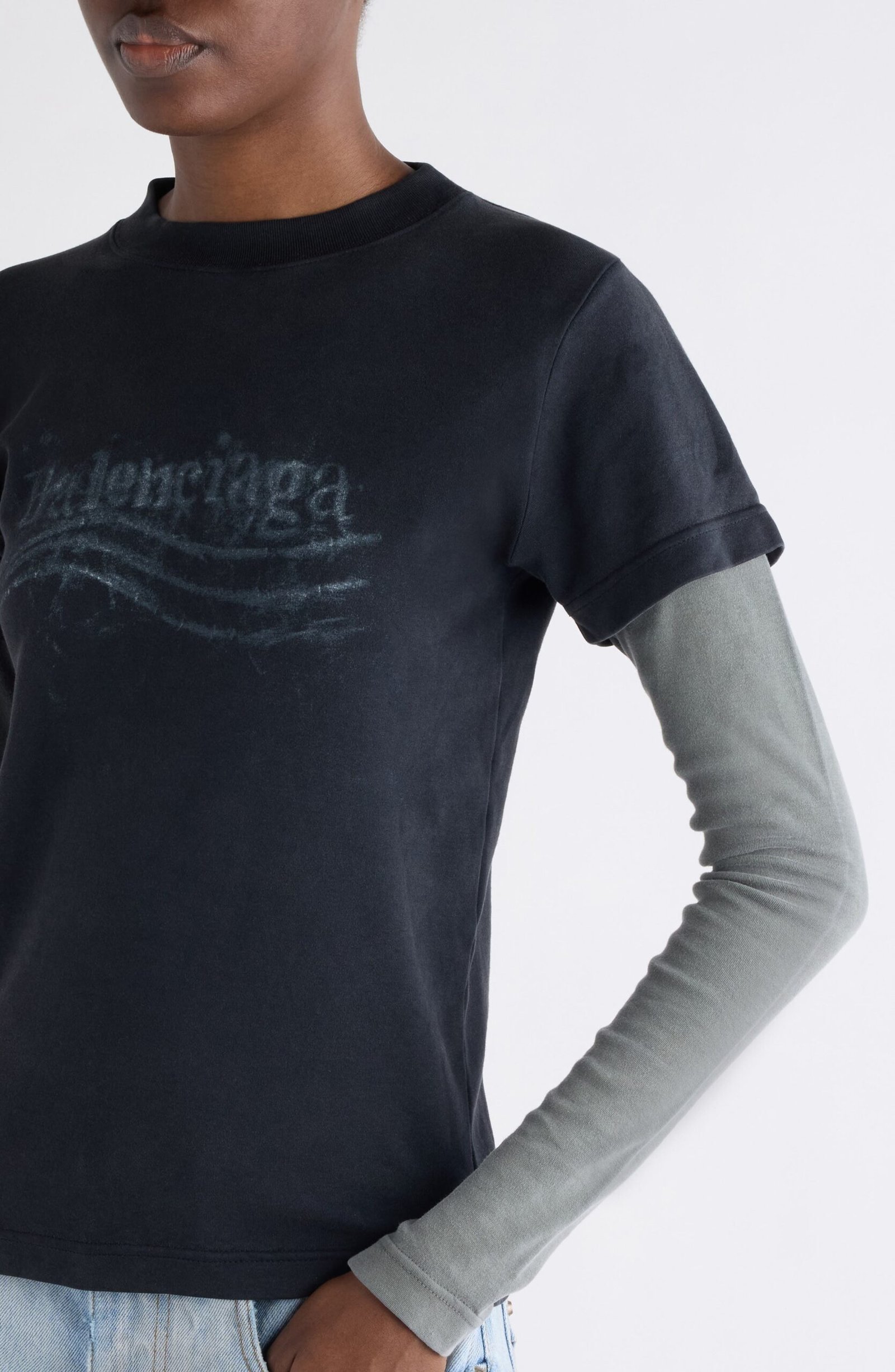 Balenciaga’s political logo goes grassroots in chalky, crayon-scrawled art campaigning across the chest of this layered cotton T-shirt that’s got our vote for comfort.