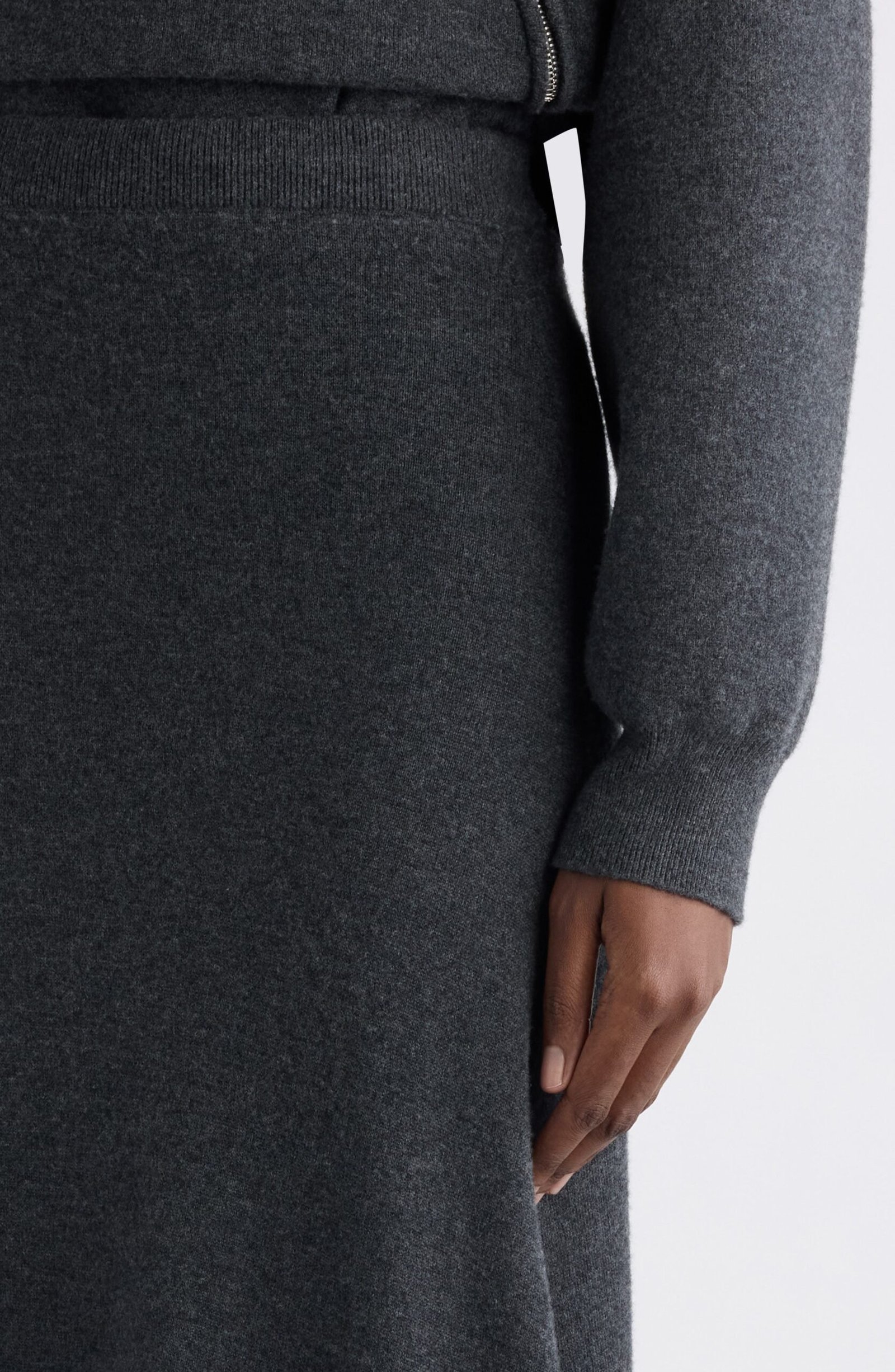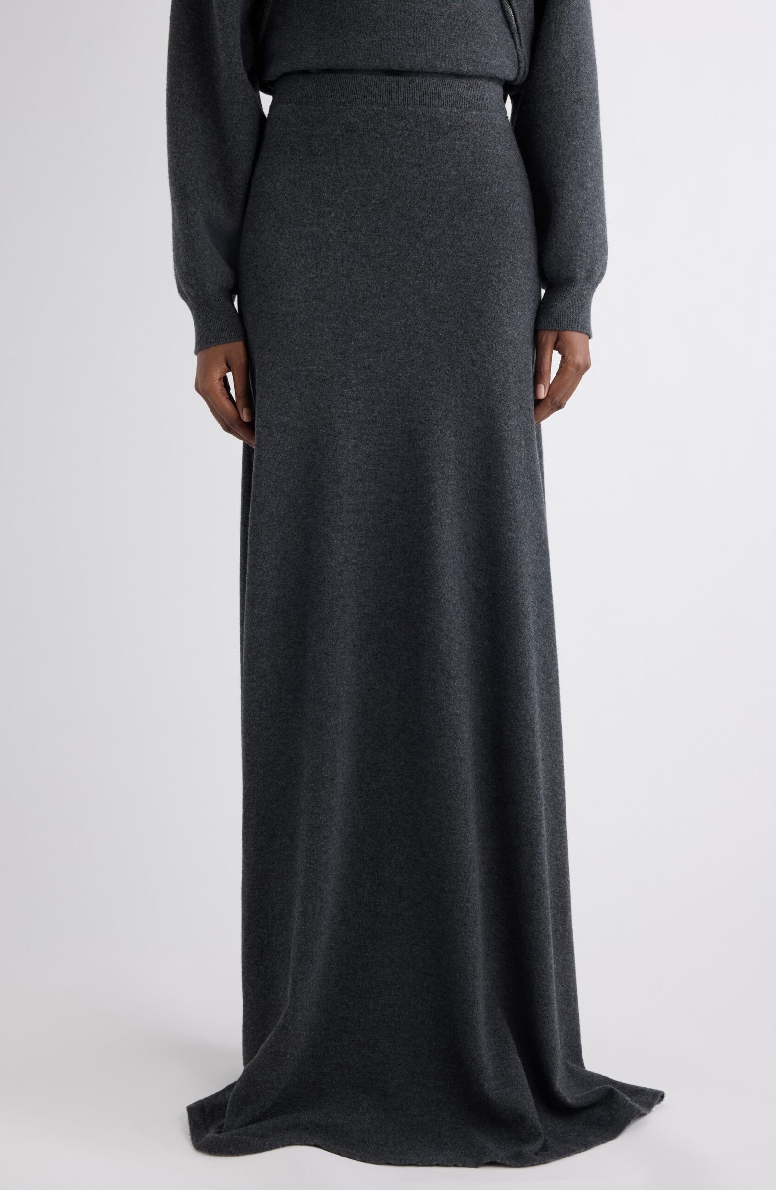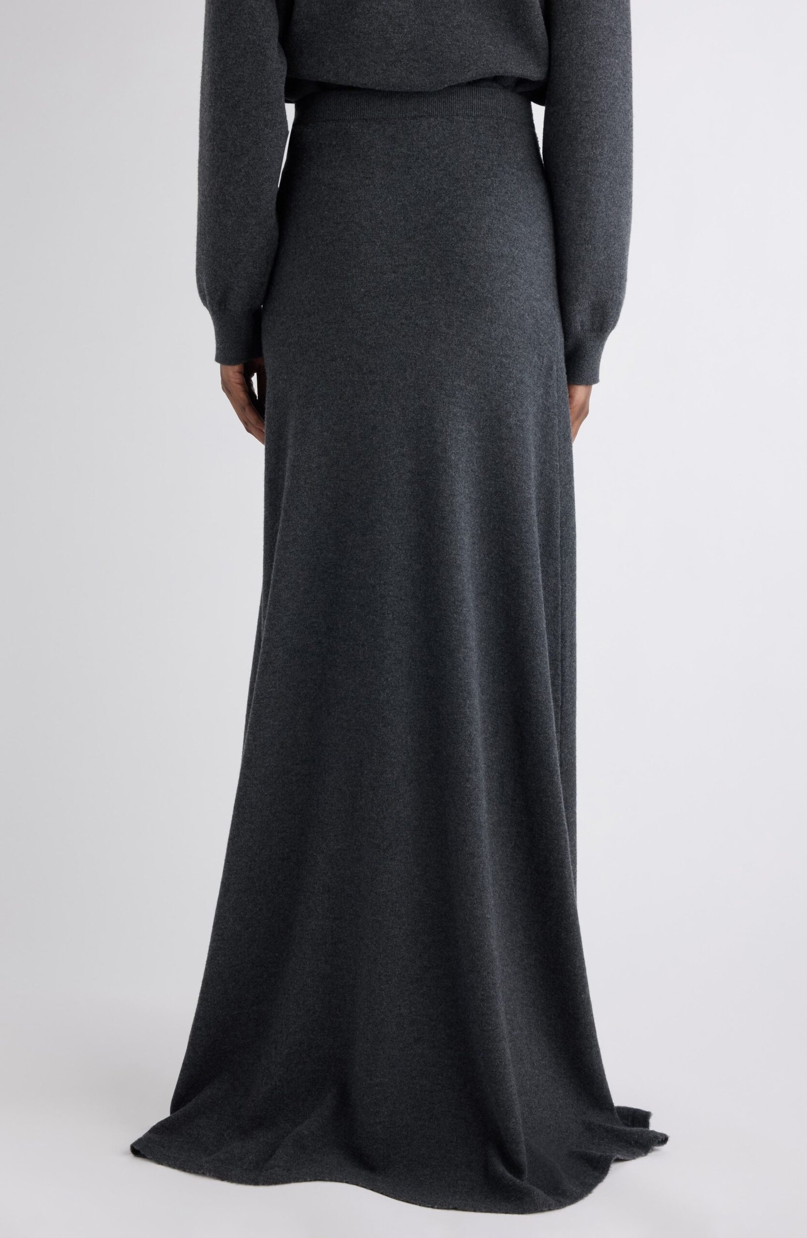Demna’s big-volume codes translate into a sleek knit maxi skirt that skims the body then slips past the ankle to the floor. The wool feels plush and substantial which makes the hem