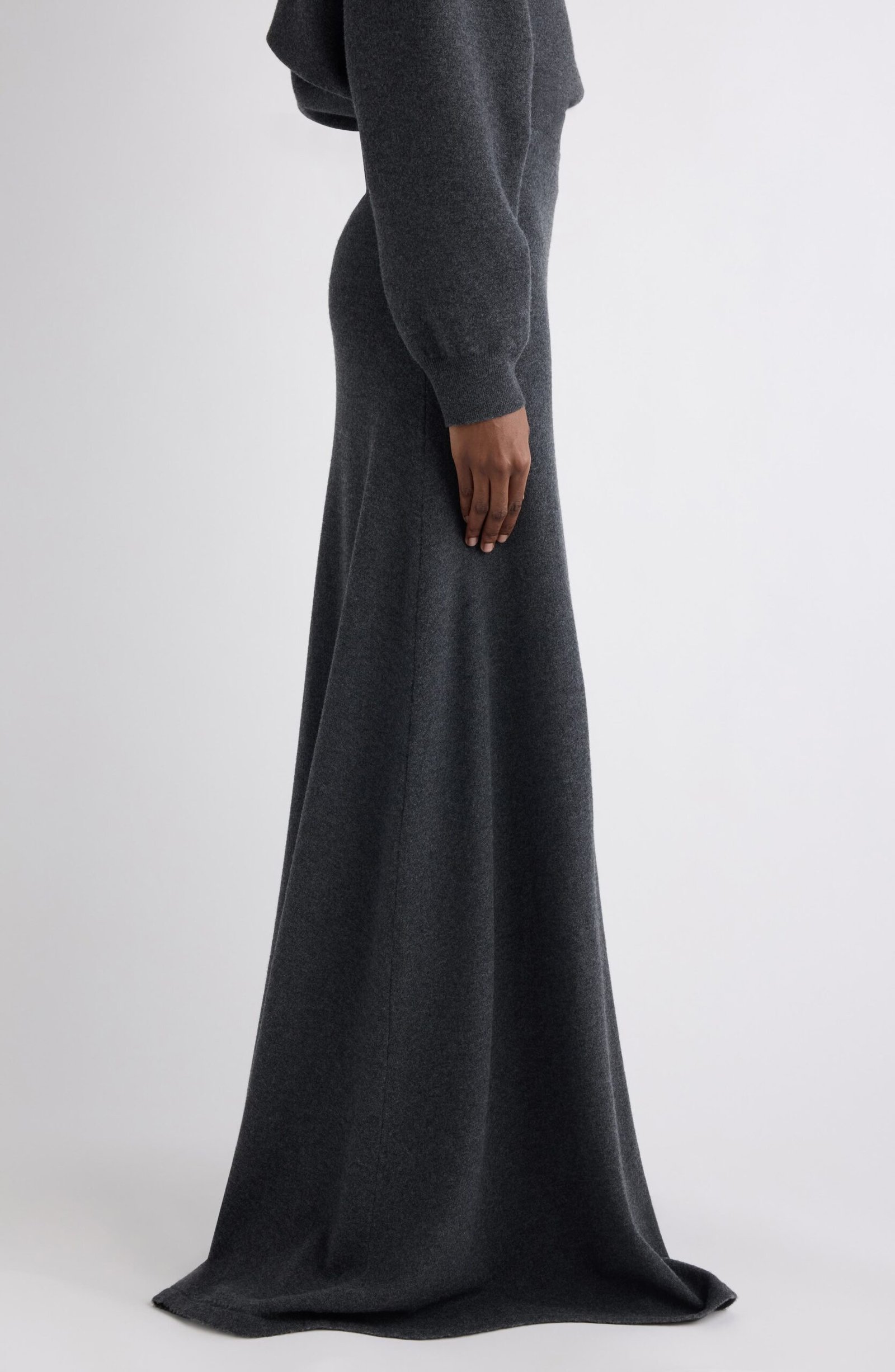 Demna’s big-volume codes translate into a sleek knit maxi skirt that skims the body then slips past the ankle to the floor. The wool feels plush and substantial which makes the hem puddle just so.