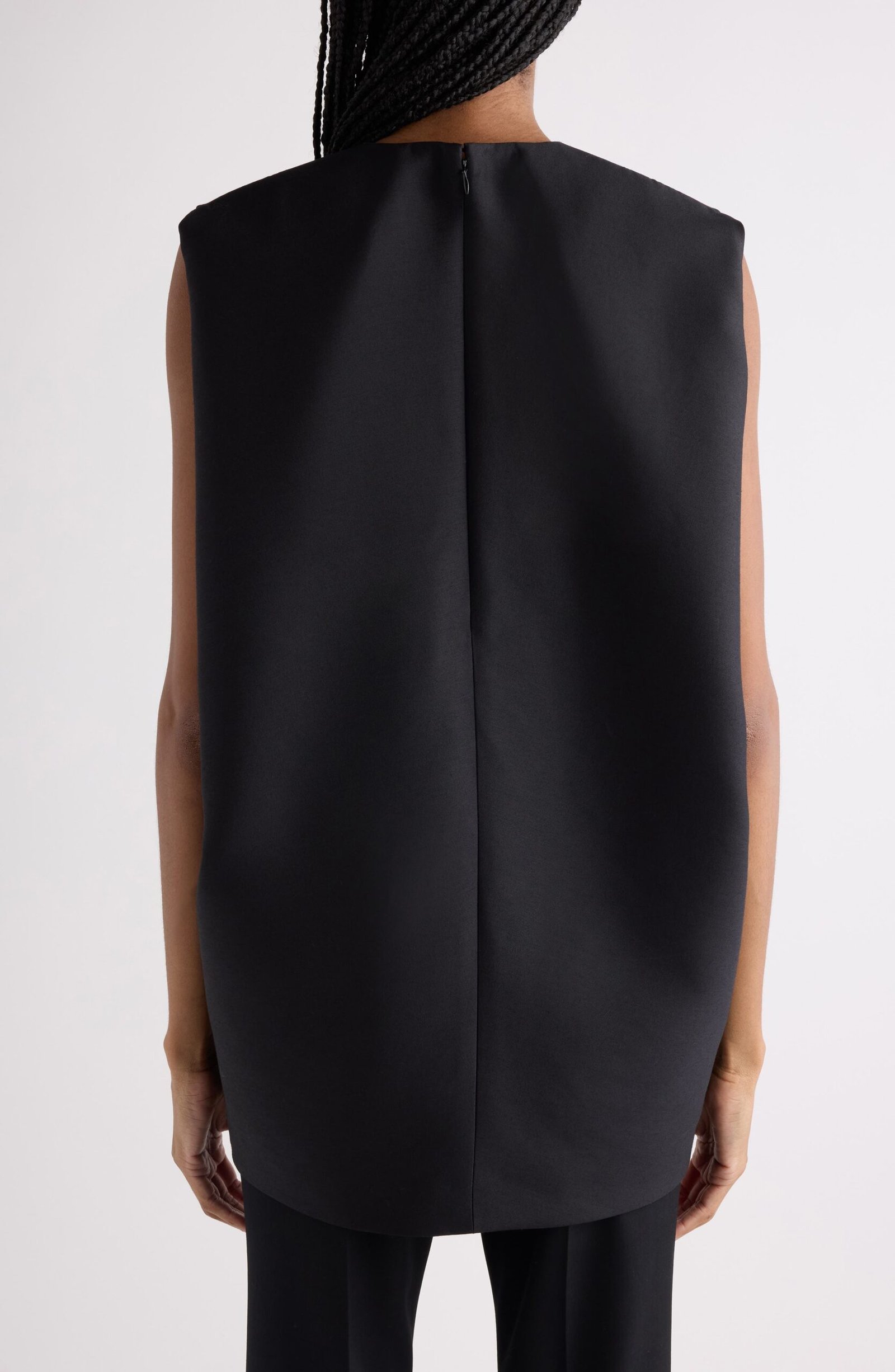 For his debut Balenciaga collection, Pierpaolo Piccioli revisits the maison’s iconic cocoon shape in this sculptural wool-silk crepe minidress, evoking the dramatic tailoring of master courtier Cristóbal Balenciaga.