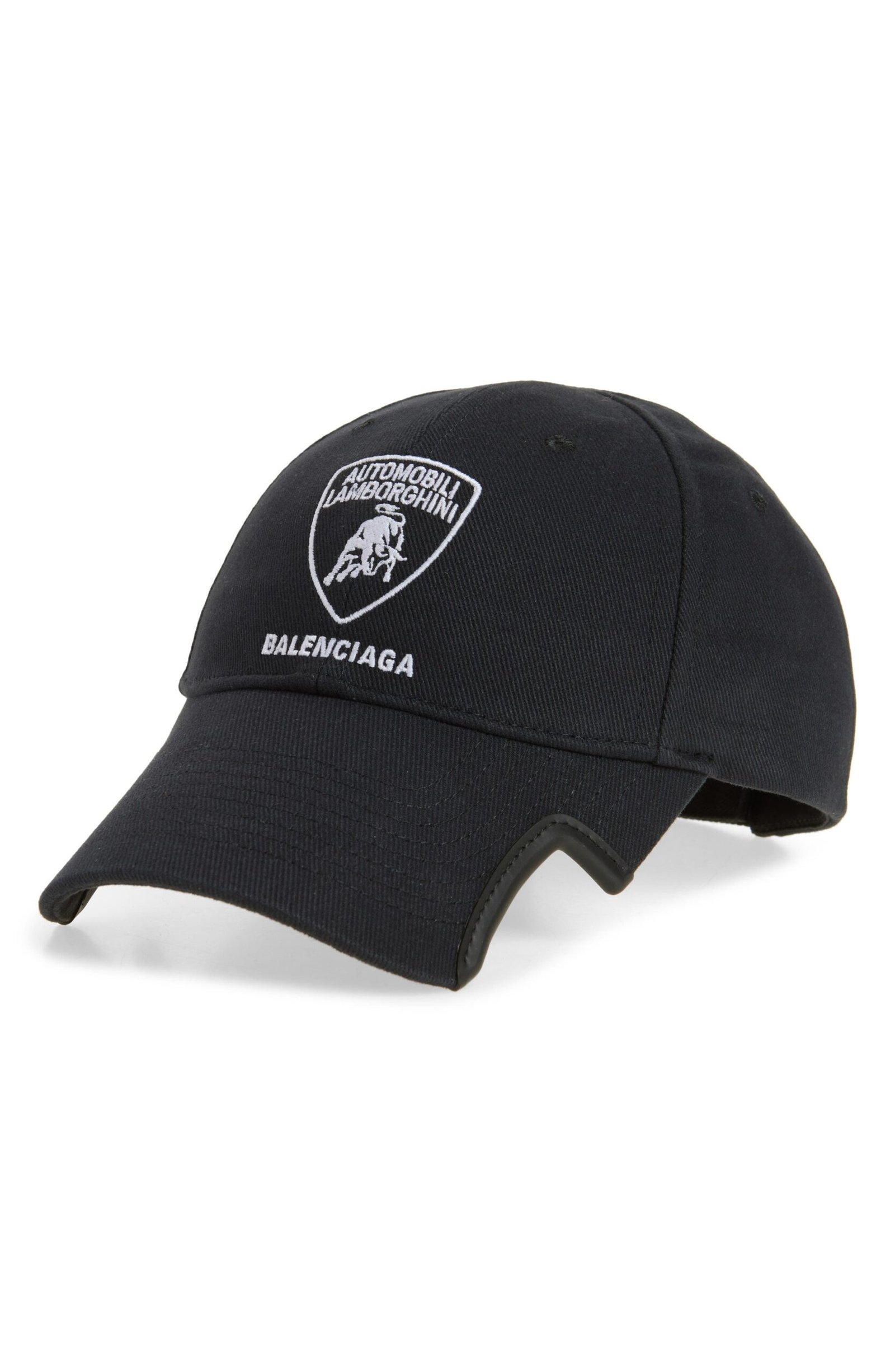 Balenciaga’s unmistakable streetwise edge merges with Lamborghini’s electrifying legacy in this bold baseball cap. High-contrast logo embroidery and angled cutouts at the precurved