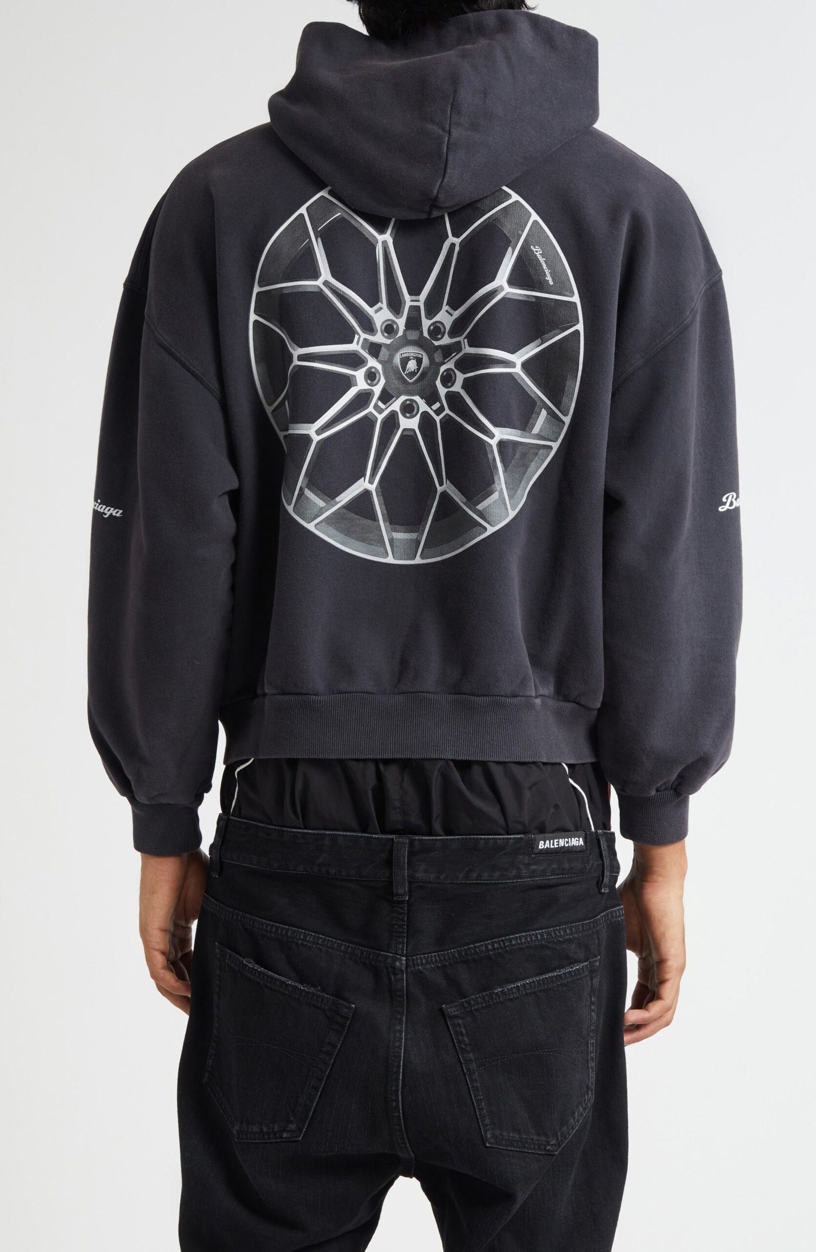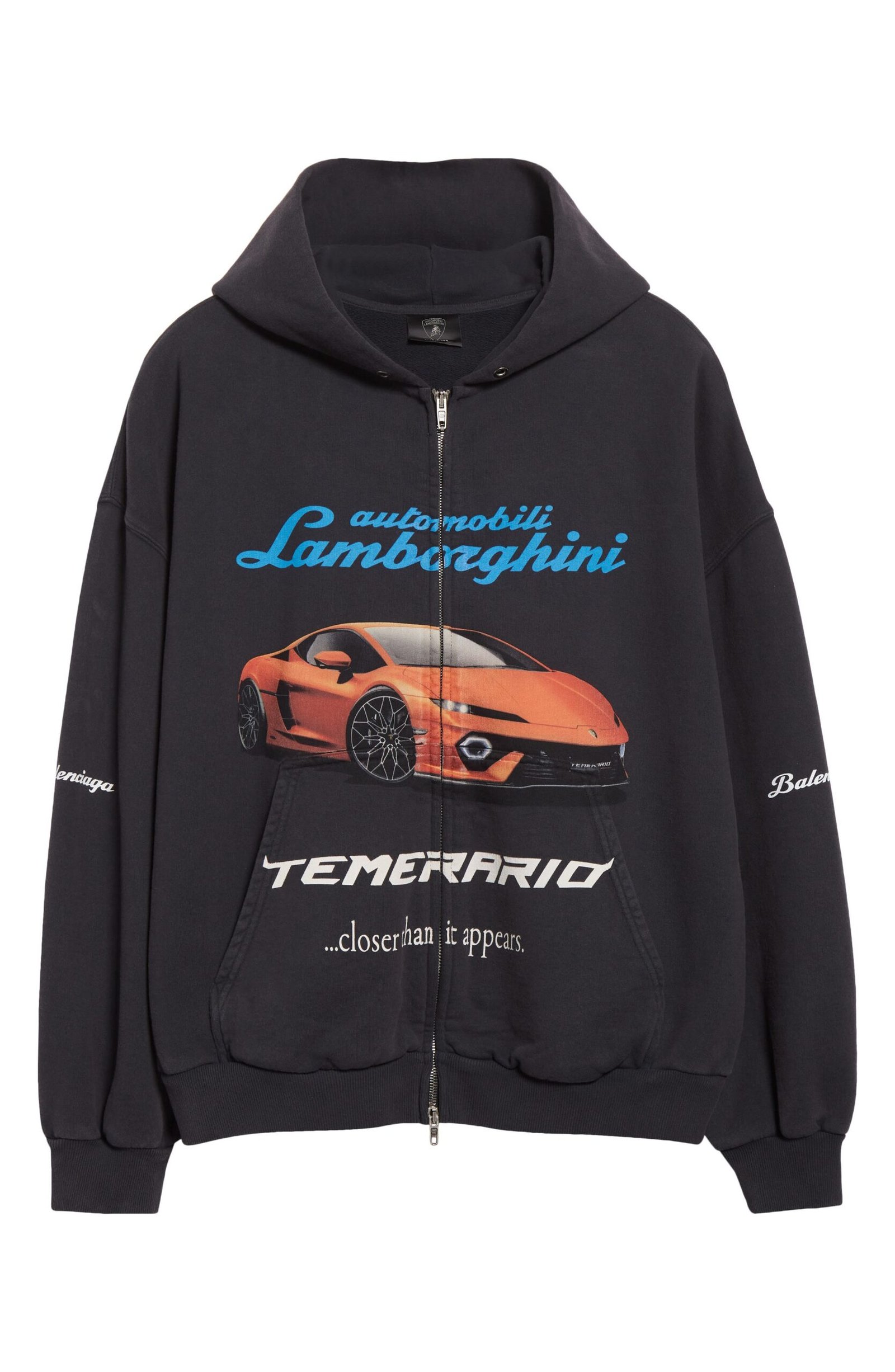 Demna’s streetwear sensibility meets Lamborghini’s adrenaline-fueled iconography in this shrunken-fit hoodie with a timeworn patina care of artful fading. Made from Balenciaga’s signature dry fleece, this full-zip hoodie has a more structured, sculptural silhouette compared to typical fleece pieces.