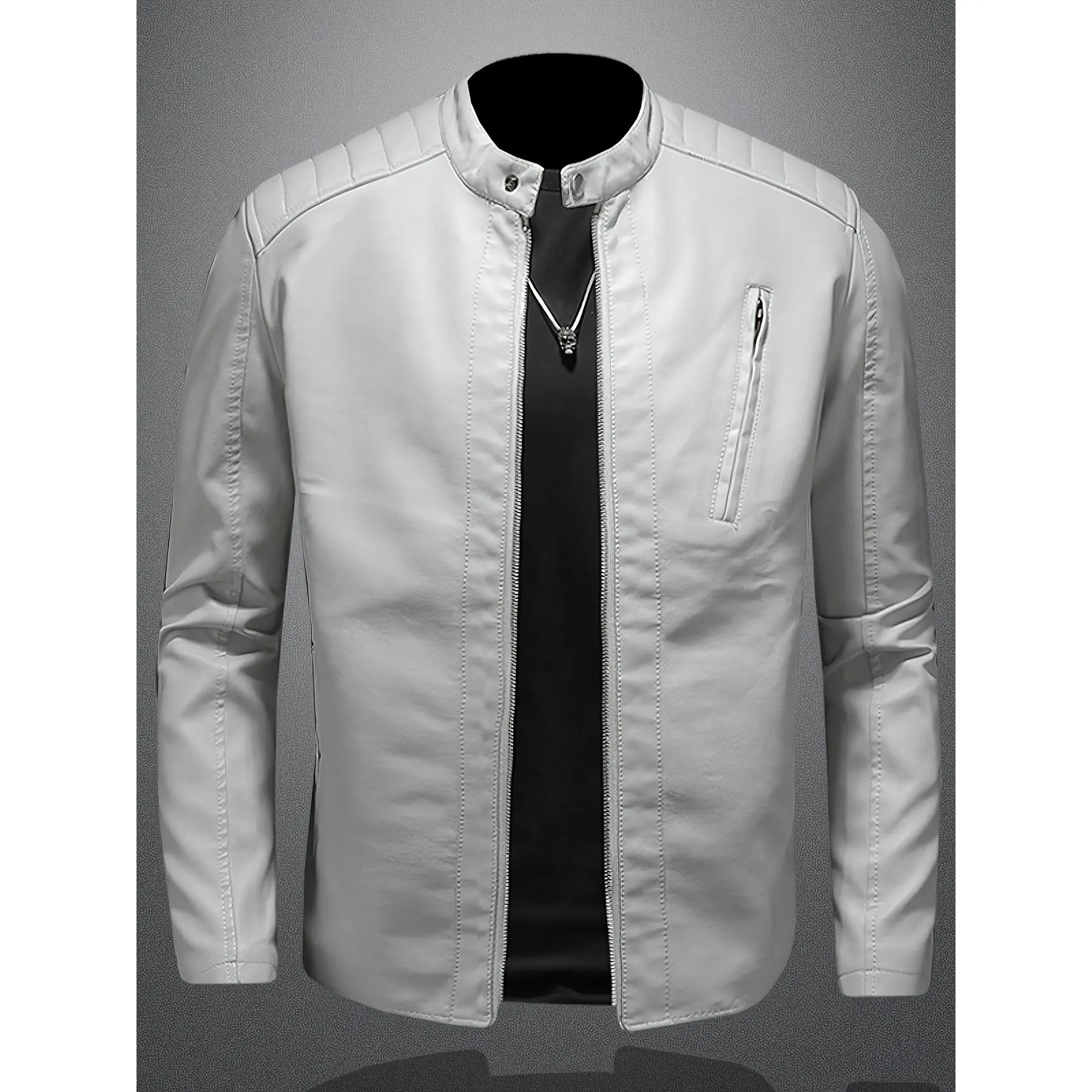 Men’s motorcycle leather jacket stand collar solid color jacket, high-end windproof street wear, artificial leather outdoor wear